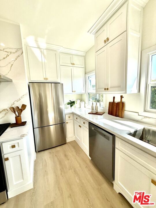 Magnificently remodeled with taste and elegance. This gorgeous unit with a private entry, offers 1,359 square feet of sprawling open floor plan with a large sun-field living room and a large sun-field dining room open to the gourmet kitchen with custom cabinets, custom quartz countertops and top of the line appliances. Large bedrooms with walk-in closets. Recessed lighting, hardwood floors, central AC unit, in-unit laundry and much more. Located in one of the most sought after locations of west Hollywood, This unit is designed for luxury, comfort, and entertaining.