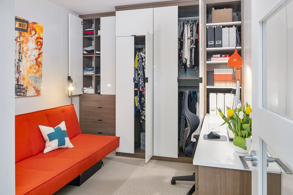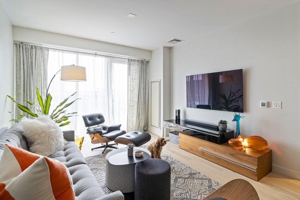 Ready to live in a full service neighborhood with everything at your fingertips? This 1 plus Den (small second bedroom) apartment is perfect for anyone looking for a second room for guests or an at home office. Modern appliances and finishes throughout, the apartment still appears like new. An excellent balcony looks out on all the action assembly row has to offer. The building features a concierge, elevator, a lounge with a billiards table, a common roof deck with gas grills and fire pit, access to a pool and a gym! Direct access garage parking. Every modern convenience can be found in Assembly Row. Photos are of same layout two floors below. Den does not have built-ins and Floor and cabinet color slightly different.