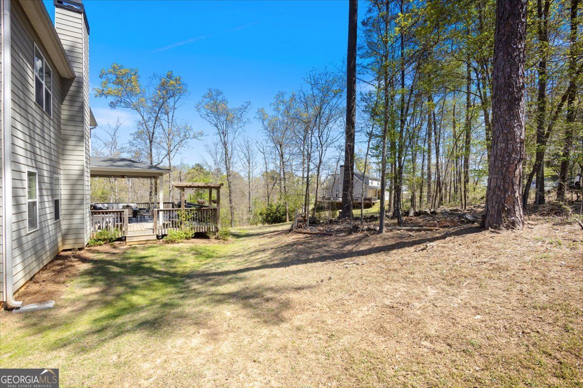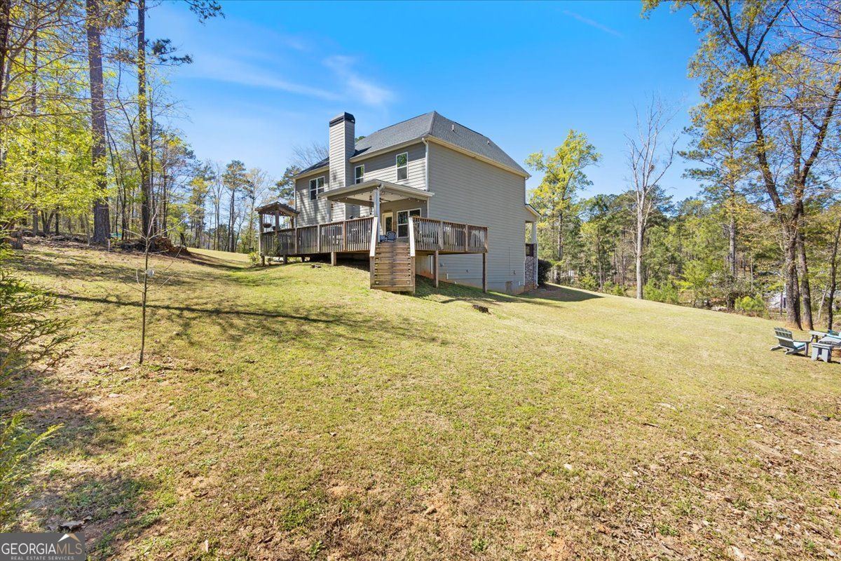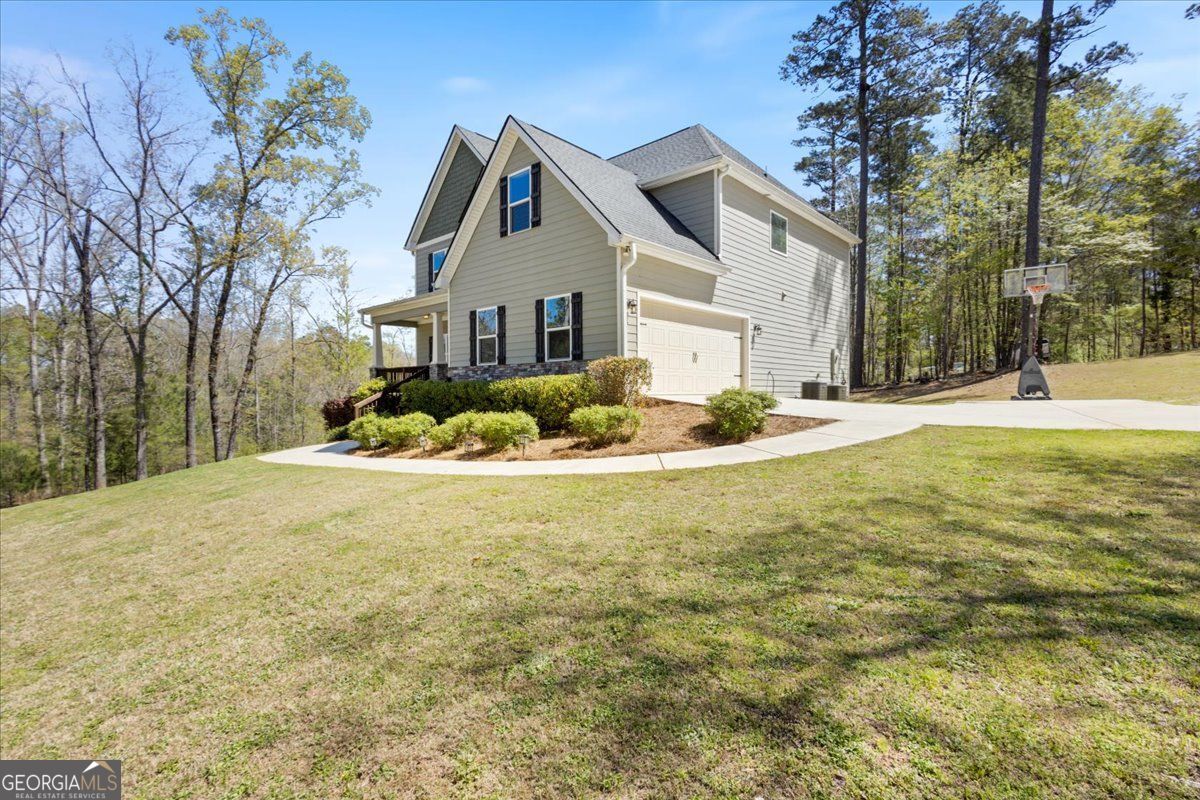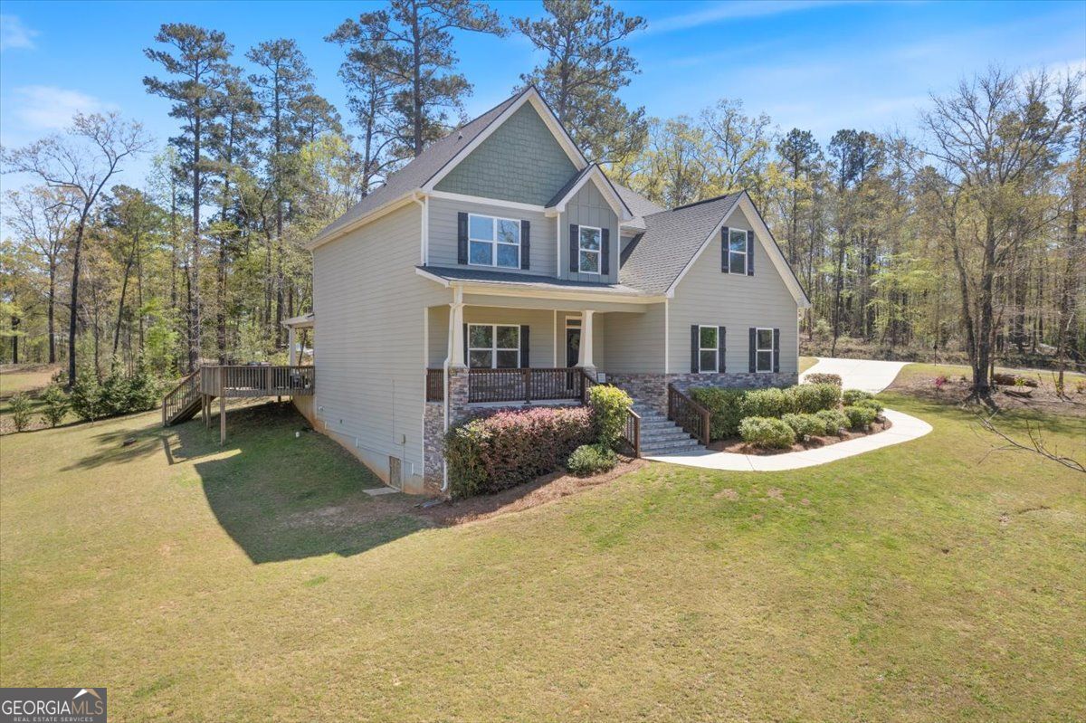 Tucked within a sought-after Jackson Lake community, this 2020-built residence offers a rare combination of privacy, scale, and refined everyday living on a 1.27-acre corner lot with seasonal lake views. Surrounded by mature landscaping and natural tree cover, the setting feels quietly removed while still being part of an established lake neighborhood. Inside, the home unfolds across 2,651 square feet, featuring 4 bedrooms, 3 full baths, a dedicated office, and formal dining, all connected through a thoughtfully designed open-concept layout. The kitchen is both functional and elevated, complete with smart appliances, quiet-close cabinetry, and direct sightlines into the main living area, where a wood-burning fireplace with a stained timber mantle creates a warm, grounded focal point. Engineered hardwood flooring anchors the main level, while the upper level has been refreshed with new carpet and full interior paint, offering a clean, move-in-ready feel throughout. The primary suite is generously scaled with tray ceilings, a spacious bath including a soaking tub and walk-in shower, and an oversized closet. Secondary bedrooms are equally well-proportioned, and the home's solid construction and insulation contribute to impressively low utility costs. Outdoor living is designed for both relaxation and entertaining, highlighted by a large pergola-covered deck overlooking lush, curated landscaping with established gardenias, loropetalum, and knockout roses, complemented by new hydrangea and tea jasmine plantings. A timer-controlled irrigation system ensures the grounds remain vibrant with minimal upkeep. Additional highlights include a two-car garage, abundant natural light throughout, and a rare financing advantage-an assumable 2.49% VA loan available for qualified buyers. A well-balanced offering of privacy, comfort, and modern functionality in one of Jackson Lake's most desirable settings.