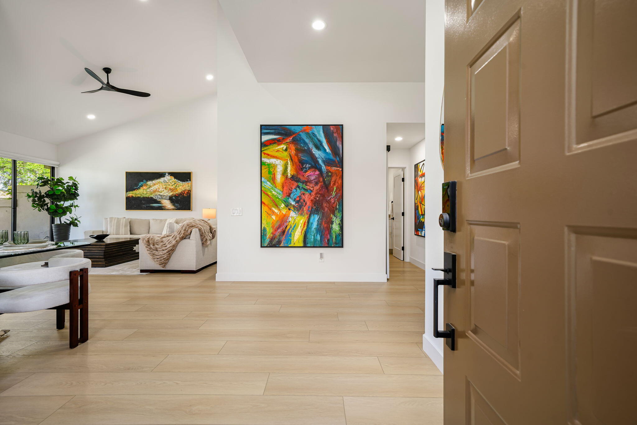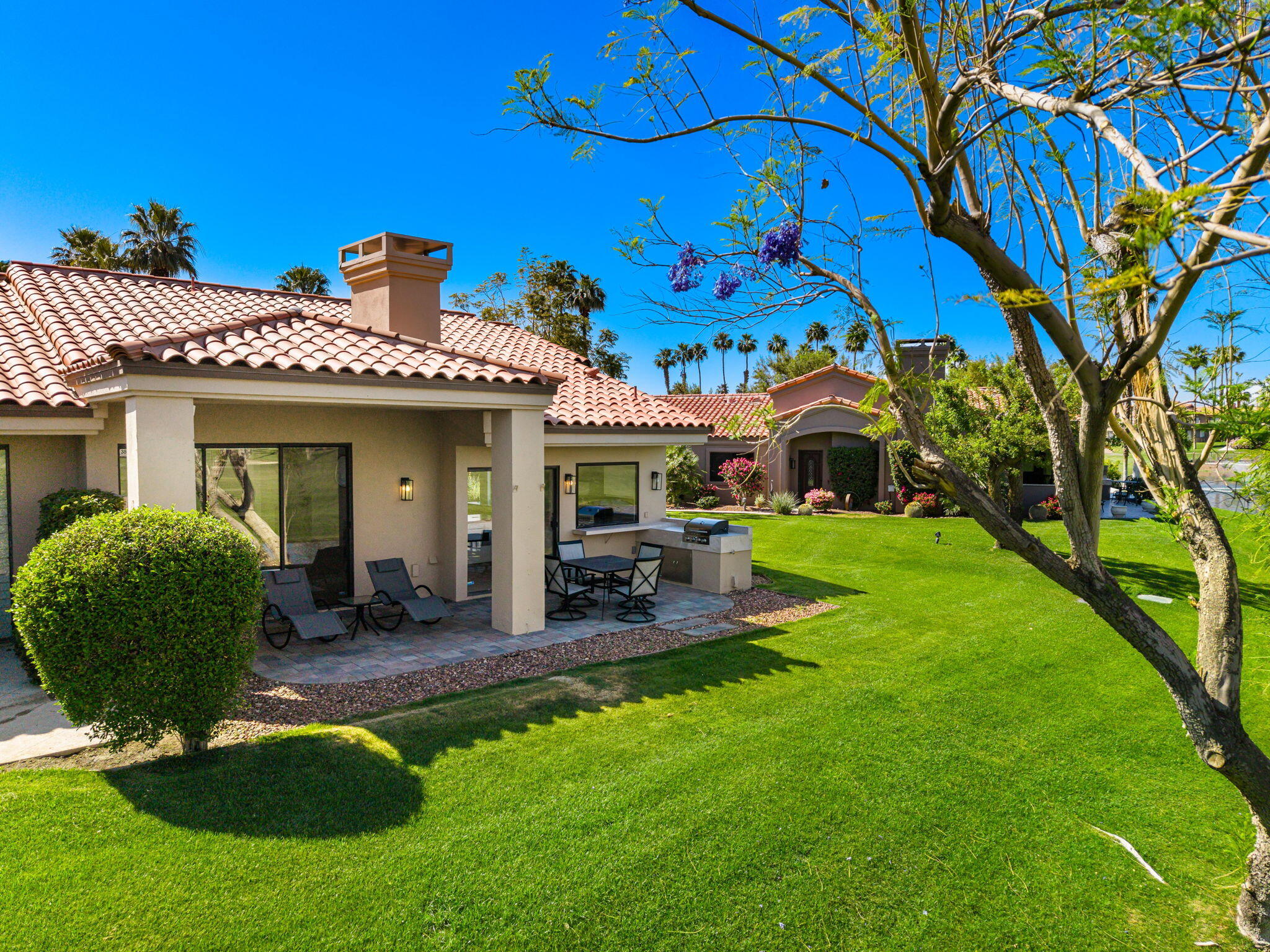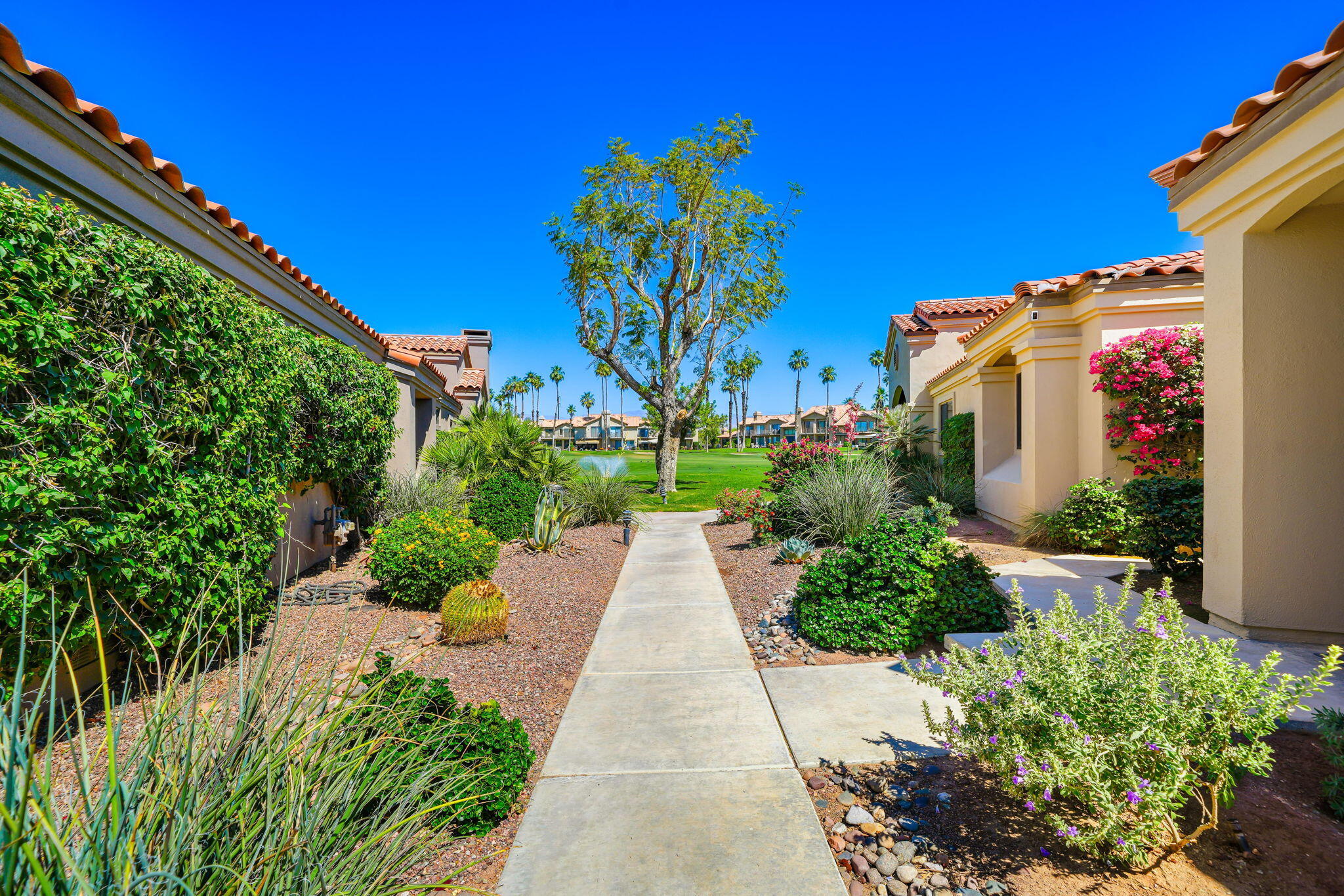 BEAUTIFULLY REIMAGINED, TURNKEY FURNISHED & SHORT-TERM RENTAL FRIENDLY--THE ULTIMATE DESERT DREAM HAS ARRIVED! Welcome to 38306 Gazania Circle, a single-story condo located within the prestigious Palm Valley Country Club. Perfectly positioned along the Ted Robinson-designed Challenge Golf Course, this prime end-unit captures sweeping golf course, lake and mountain views. This highly sought-after and fully remodeled 'Sycamore' plan offers 3 bedrooms, 3 bathrooms and over 1,900 Sq.Ft. of thoughtfully designed open living space. The kitchen is a true showpiece, featuring soft-close cabinetry, sleek natural stone countertops, a waterfall island with counter seating, a granite composite sink, and a full suite of stainless steel appliances. Soaring ceilings and plank vinyl flooring flow throughout, creating a bright and airy ambiance. Additional highlights include an indoor laundry room, electric fireplace and a stylish bar nook for added convenience. Two of the bedrooms serve as en-suite retreats, complete with walk-in showers, dual vanities with vessel sinks and matte black fixtures, while the guest bath showcases a luxurious soaking tub and shower combination. The third bedroom offers versatile use as a guest room, office, or flex space. Step outside to an expanded paver patio with a built-in BBQ area, perfect for unwinding while taking in the serene surroundings, an additional privacy patio is located off the primary. The 2-car garage includes an additional refrigerator and built-in storage cabinets, and is just steps from one of the many community pools and spas. Palm Valley Country Club is one of the desert's most iconic active lifestyle communities offering resort-style amenities and memberships options for golf, tennis, pickleball, aquatic, fitness and spa enthusiasts alike. A true move-in ready opportunity, ideal as a primary residence, luxurious seasonal retreat, or income-producing short-term rental investment - this is one you don't want to miss. Schedule your private showing today!