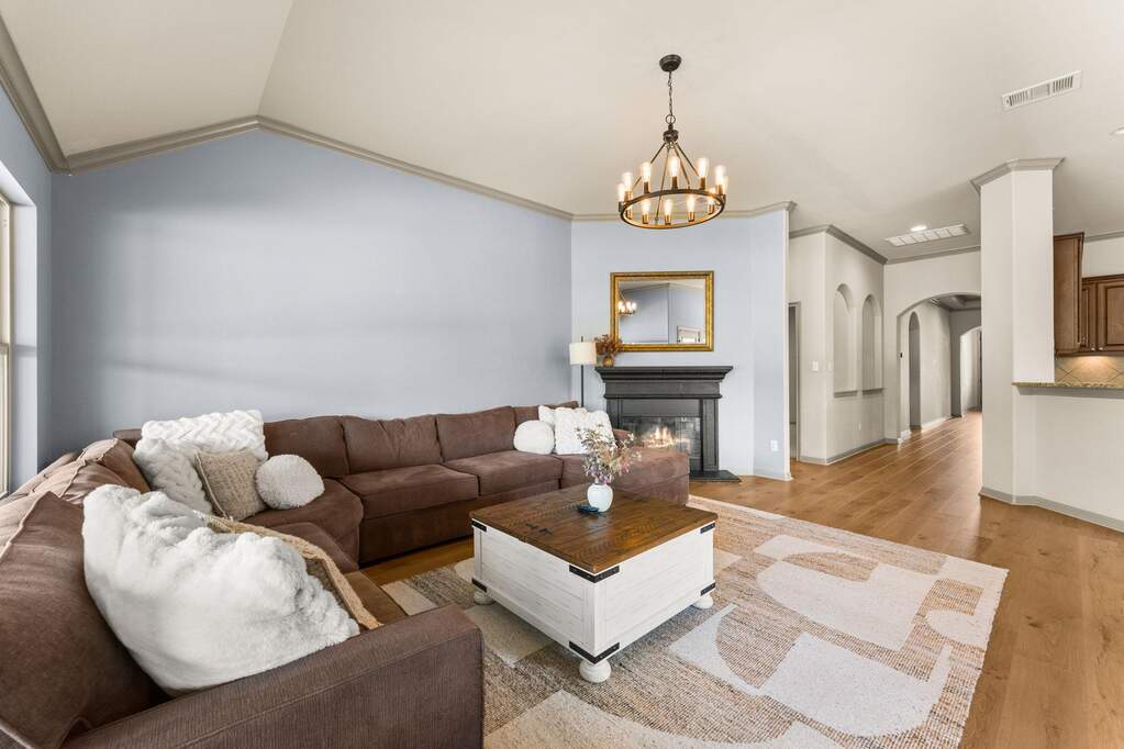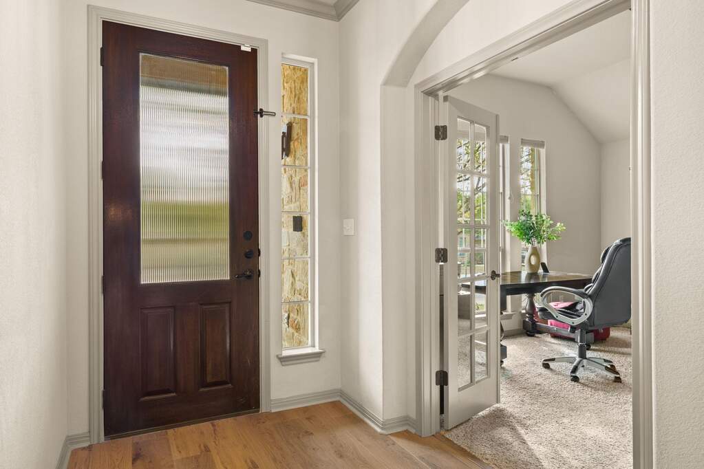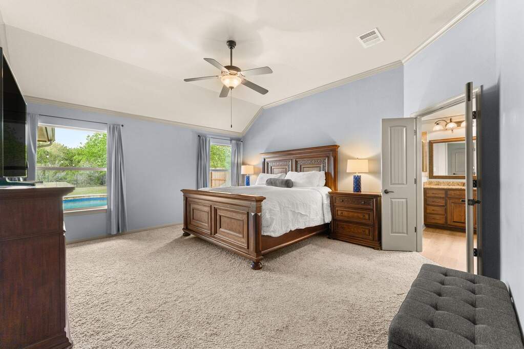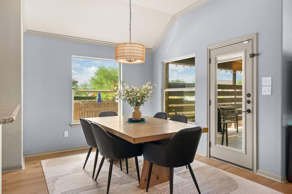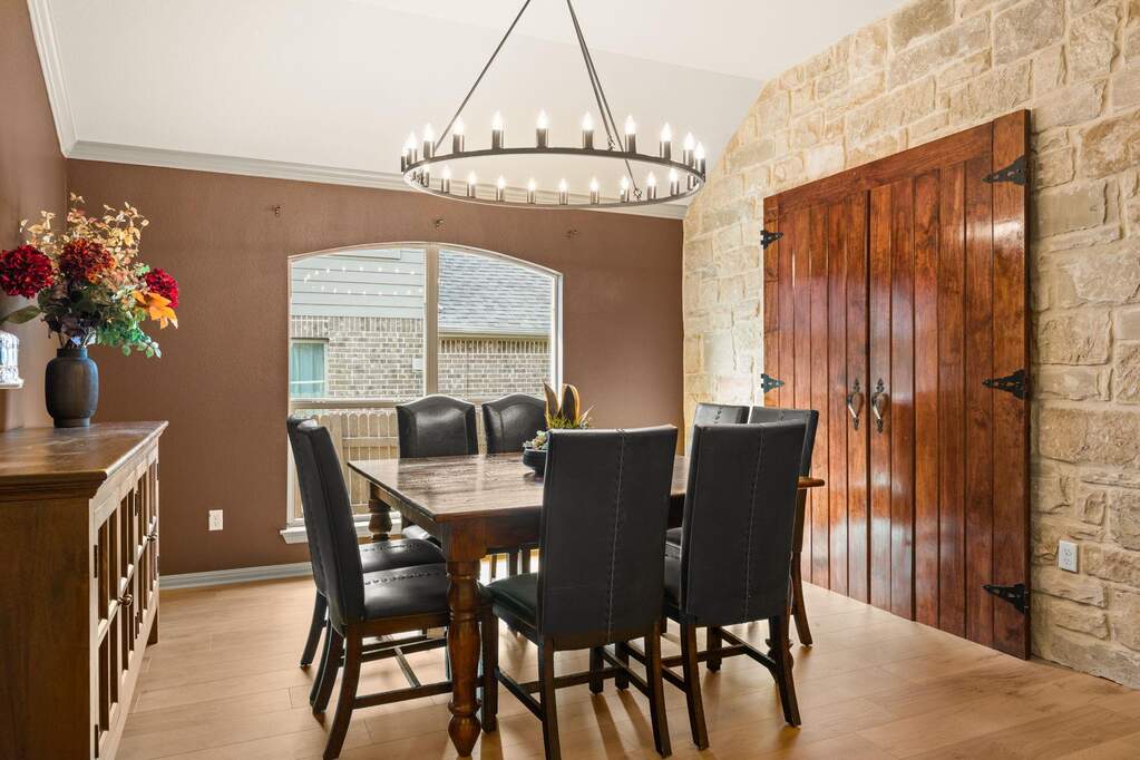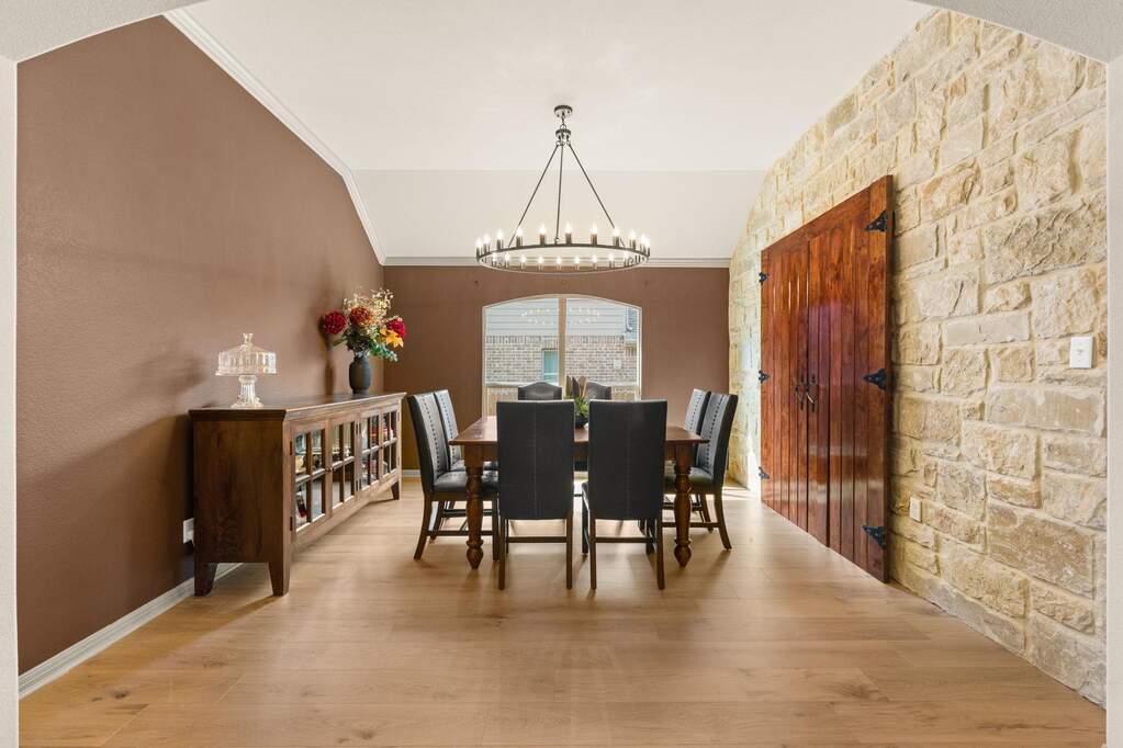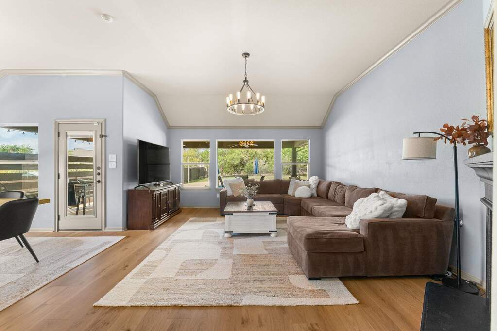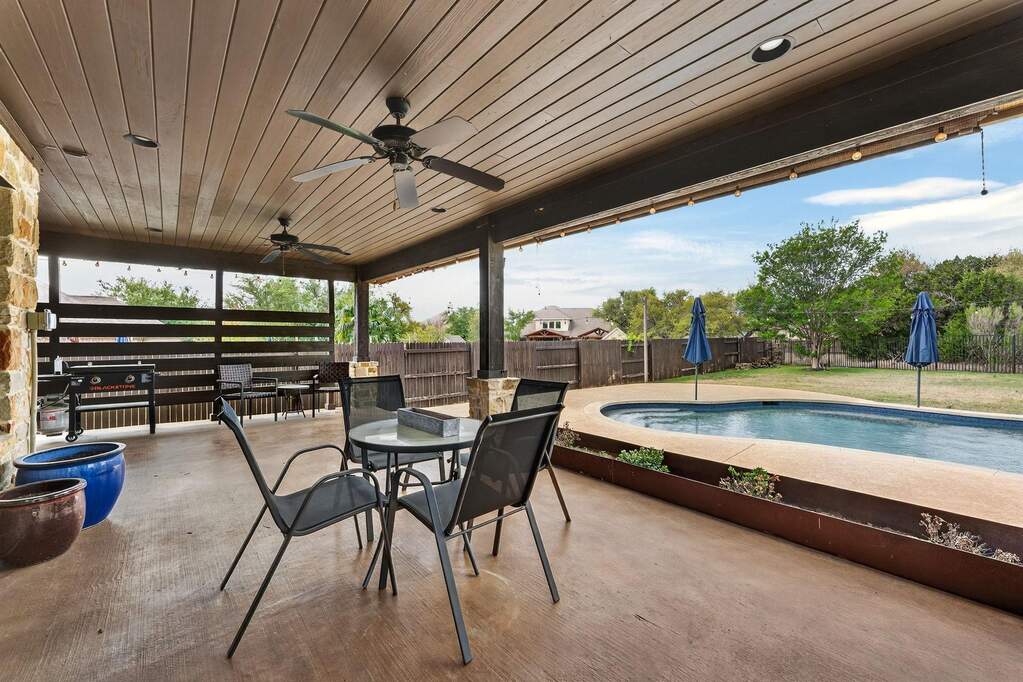 Welcome to Belterra, where Hill Country ease meets everyday convenience between Austin and Dripping Springs. This beautifully maintained one-story home opens through a gracious entry into an expansive living area framed by views of the backyard and greenbelt beyond. Designed for both privacy and enjoyment, the outdoor setting features a 17,000-gallon pool with solar heating, an extended patio strung with ambient lighting, and a serene backdrop of natural space. Inside, the flexible floor plan offers versatility to fit a variety of lifestyles. A bonus room with a closet provides the option for a fifth bedroom, media room, or spacious office. Recently updated wood-look laminate flooring runs throughout the home, creating a cohesive and refined feel. The kitchen is thoughtfully designed with double ovens, abundant cabinetry, and generous counter space, all open to the family room and breakfast area for easy gathering. A separate dining space, accented by a stone feature wall and architectural details, is ideal for hosting larger meals and special occasions. Constructed with four-sided stone, the home reflects quality and thoughtful care, with numerous improvements made by the current owners. Enjoy the lifestyle you love, whether it's family nights, entertaining, or an executive retreat. Belterra residents enjoy access to exceptional community amenities, including two pool areas, a clubhouse, pickleball and basketball courts, a baseball practice field, scenic trails, and a splash pad located in the Retreat section of the neighborhood.