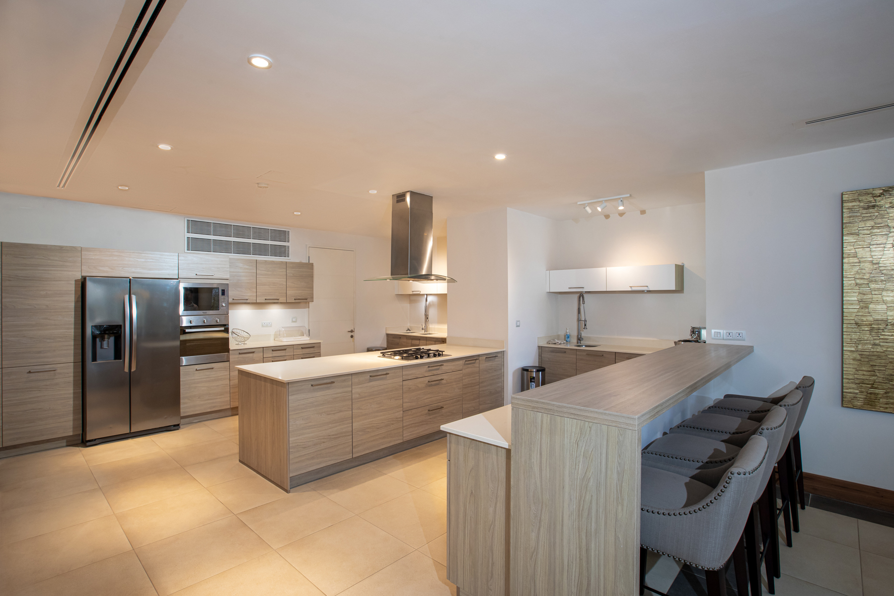 Designed with entertaining in mind, this level also features a fully equipped professional-grade kitchen, complete with distinct areas for hot preparation, cold preparation, and pastry.