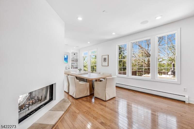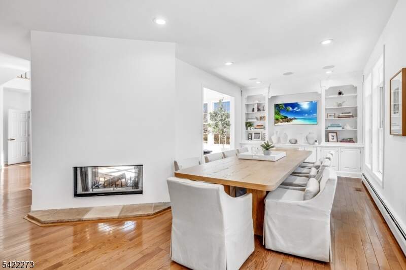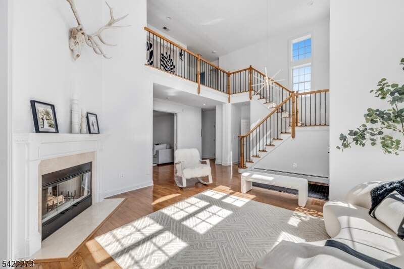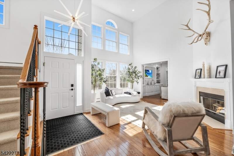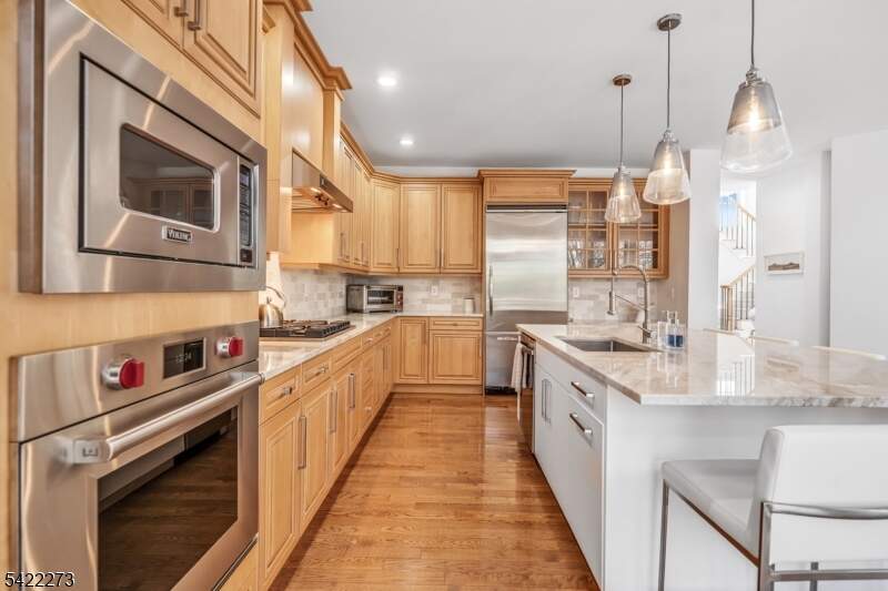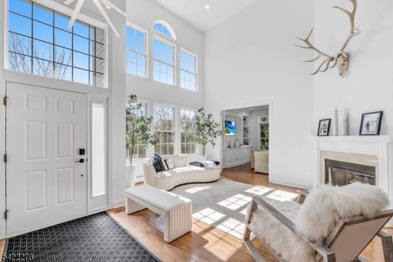 Absolutely immaculate end-unit townhome in desirable Summit Pointe offering 3 bedrooms, 3.5 bathrooms, a 2-car garage, large driveway, and an oversized walkout finished basement, with nearly 4,000 square feet of total living space. A dramatic entry foyer and living room with soaring double-height ceilings and oversized Pella windows create an airy, grand feel throughout the home. The light-filled main living spaces are beautifully appointed with hardwood floors, recessed lighting, built-in speakers, and high-quality custom finishes. The stunning kitchen features custom wood cabinetry, a large center island, beautiful stone countertops, stainless steel Wolf and Viking appliances, and a double-sided fireplace, while the dining area is enhanced by a gorgeous wall of custom built-ins. Sliding doors lead to a large deck, perfect for indoor-outdoor living. Convenient main-level laundry. The expansive primary suite is a true retreat, complete with skylights that pour in natural light, a beautifully designed spa-like bathroom with a large glass shower, soaking tub, and walk-in closet. The secondary bedrooms are all generously sized. The walkout lower level is an entertainer's dream, featuring a brand new bar with sink and beverage centers, along with exceptional additional living space. Additional features include central air, central vacuum, and ample storage. A truly move-in ready home with gorgeous renovations throughout. Amazing community with stunning pool, tennis, clubhouse.