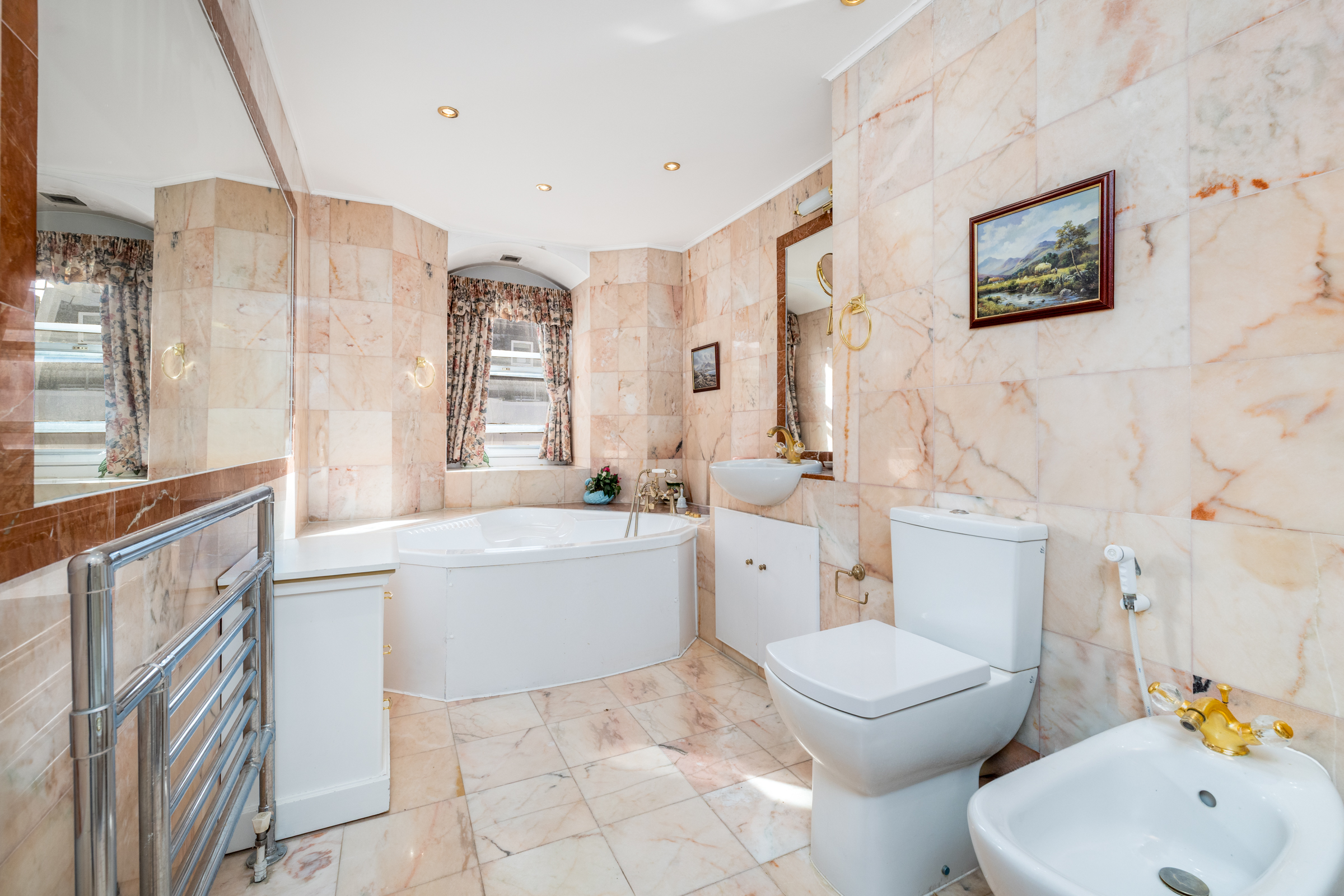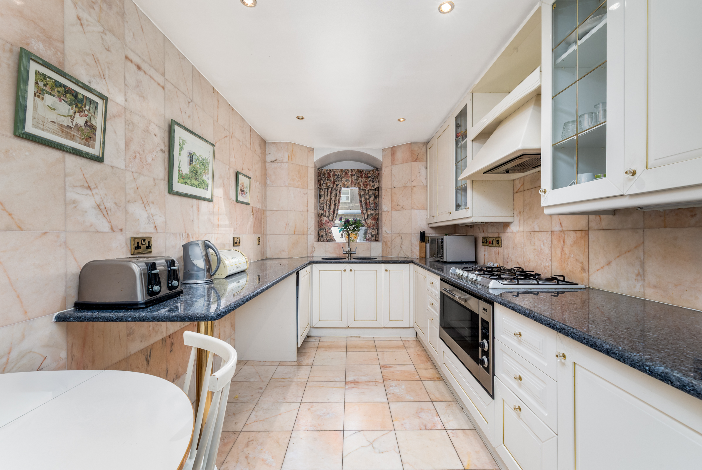 The kitchen is fully fitted and positioned centrally within the apartment, while the existing bathrooms and utility space support comfortable day-to-day living as it stands. Though the interiors have been well maintained, the apartment now offers clear potential for renovation, making it an especially compelling proposition for a buyer looking to create a tailored long-term home in one of west London’s most distinguished mansion blocks.