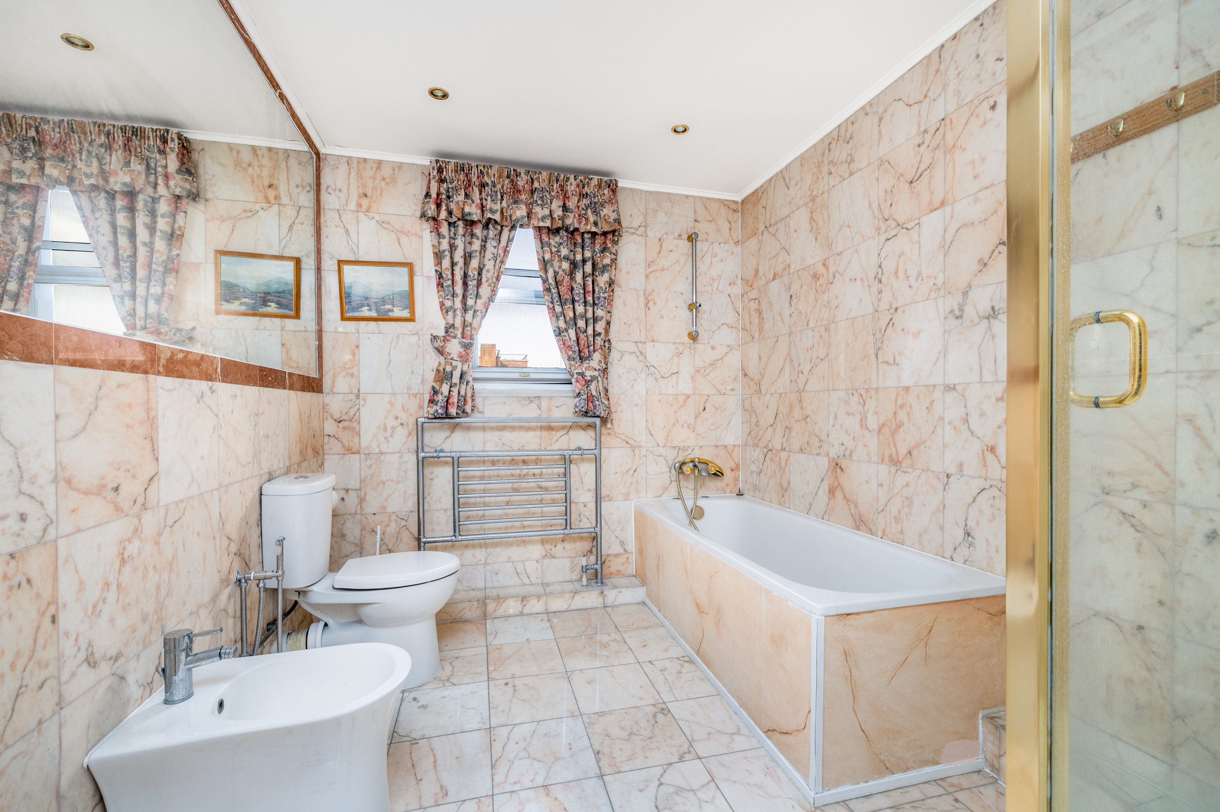 The bedroom accommodation is arranged across the opposite side of the plan, creating a strong sense of separation between entertaining and private space. The principal bedroom is well proportioned, while three further bedrooms provide ample accommodation for family and guests. The current layout allows for considerable versatility, with scope to reconfigure according to a purchaser’s requirements.