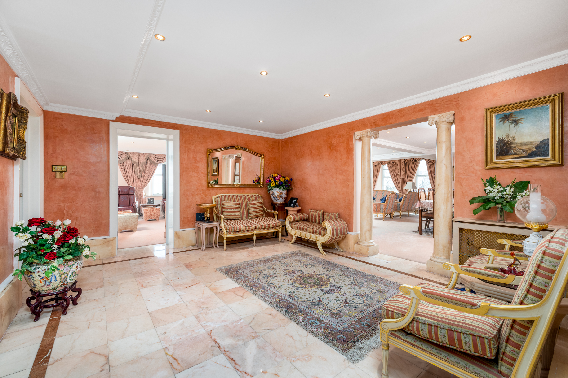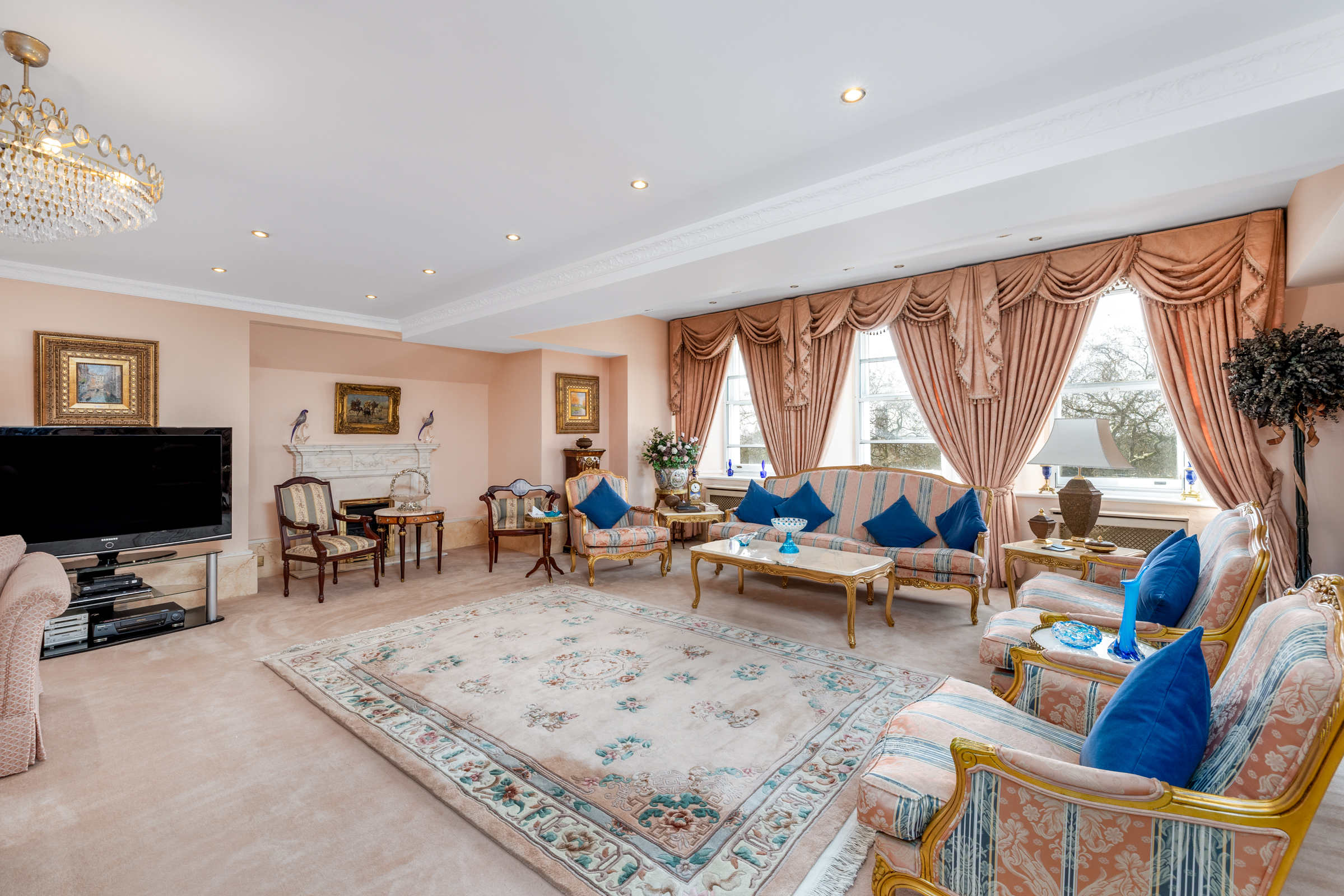 The apartment opens into a generous entrance hall that sets the tone for the volumes that follow. At its heart is an exceptional 35-foot reception and dining room, a striking space for entertaining with an abundance of natural light and far-reaching south-facing views towards Hyde Park. A separate study or additional reception room sits alongside, offering welcome flexibility for family life, working from home or more formal hosting.