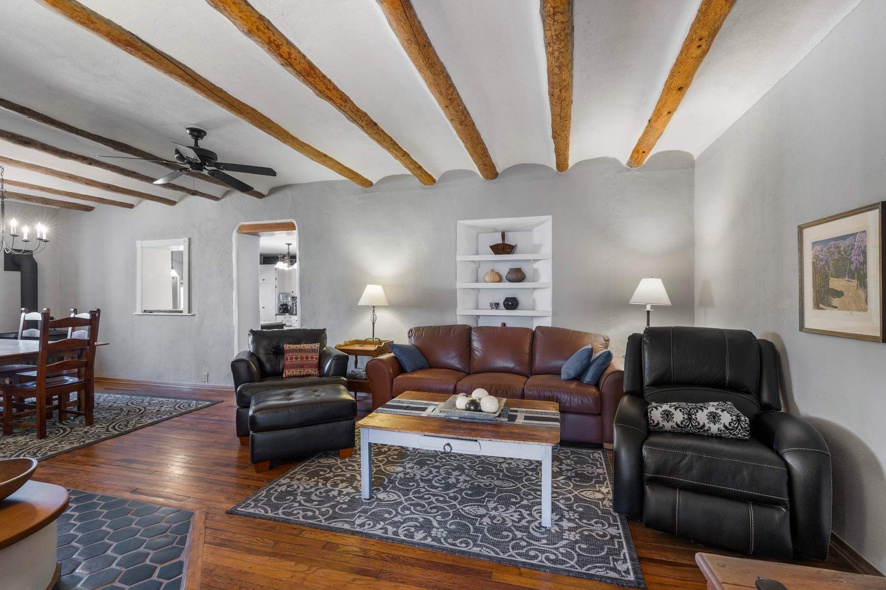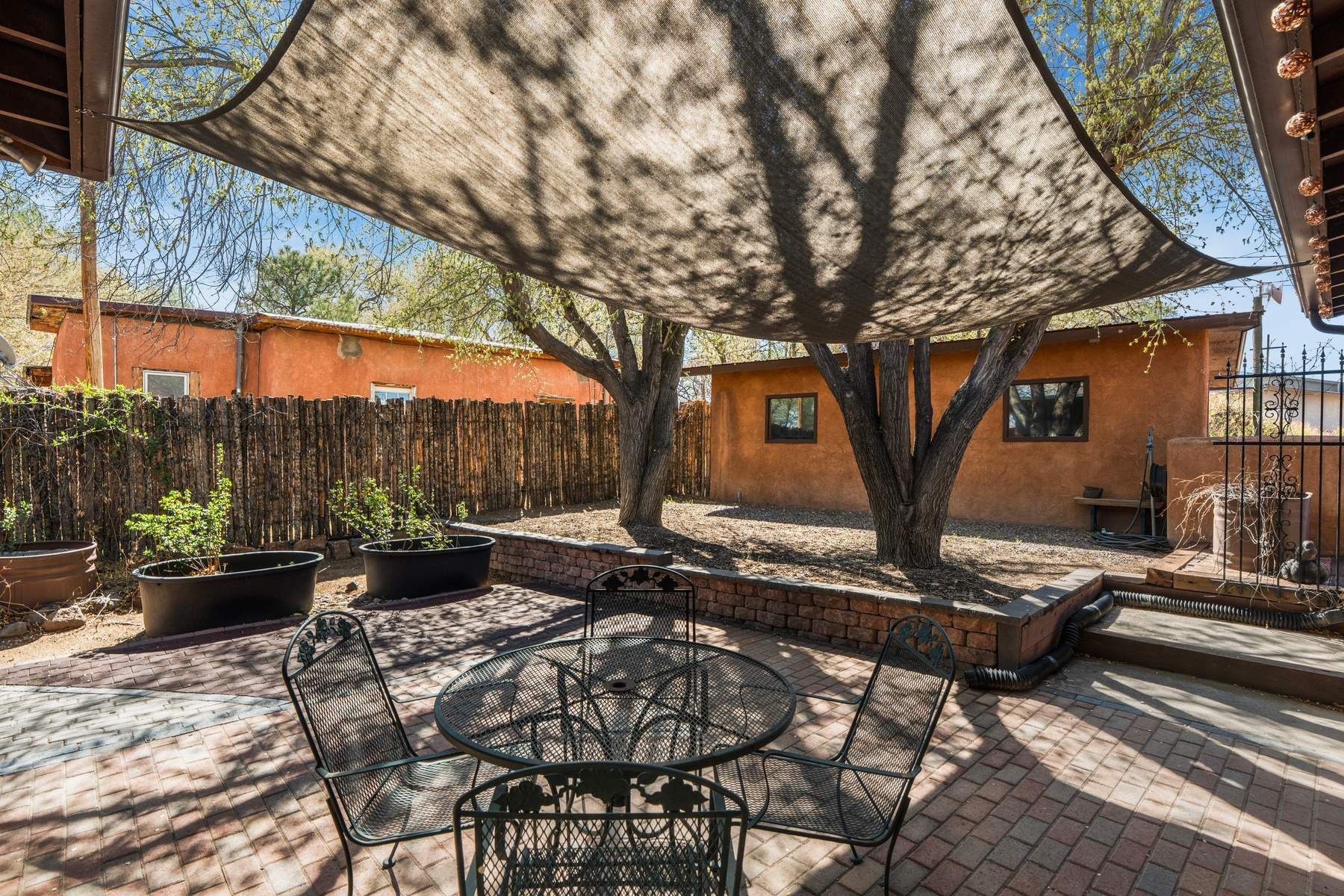 Welcome home to this distinctive single-level home with an acequia running through the property, located in the El Rancho area of Pojoaque. With adobe portions of the home dating back to 1892, this 3-bedroom, 2-bath home with office offers 2,680 square feet of living space on 1.63 acres, blending historic Northern New Mexico character with everyday comfort and functionality. Warm and inviting style details define the home, including wood and coved viga ceilings, brick, wood, and concrete floors (no carpet), bay windows and abundant natural light throughout. The living room is anchored by a fireplace and opens to adjacent dining and flexible living spaces that support both daily living and gathering. The eat-in kitchen is both charming and practical, featuring granite countertops, extensive cabinetry, built-in shelving, and a butler’s pantry, with easy flow into the dining area. A separate office provides space for work, studio use, or additional flexibility. Three bedrooms and two bathrooms are thoughtfully arranged within the home, offering comfortable use and separation. Two gas stoves provide warmth and character during the colder months. Outside, the property reflects traditional Northern New Mexico land use, with an acequia running through the parcel, mature trees, and a variety of usable outdoor areas suited for gardening, projects, or outdoor living. The elongated 1.63-acre lot offers flexibility and depth without the maintenance demands of larger acreage. A detached one-car garage with workshop space adds functionality and storage. Located approximately 10 minutes from Pojoaque amenities, 20 minutes to Los Alamos, and 27 minutes to downtown Santa Fe, this lovingly maintained home for 30+ years by the current owner offers quiet rural living in a wonderful community and a welcome combination of historic adobe architecture, usable land, and convenient access.
