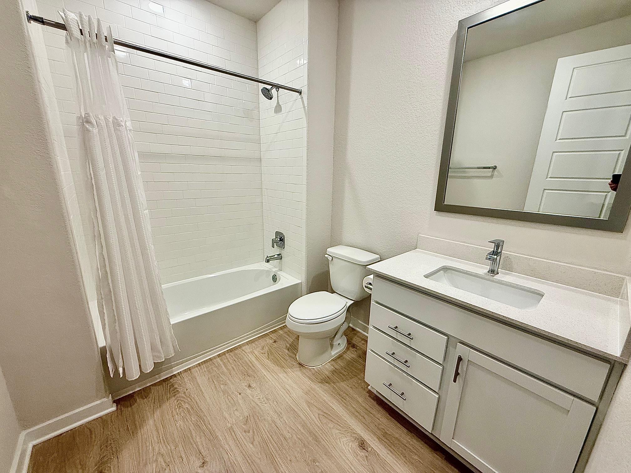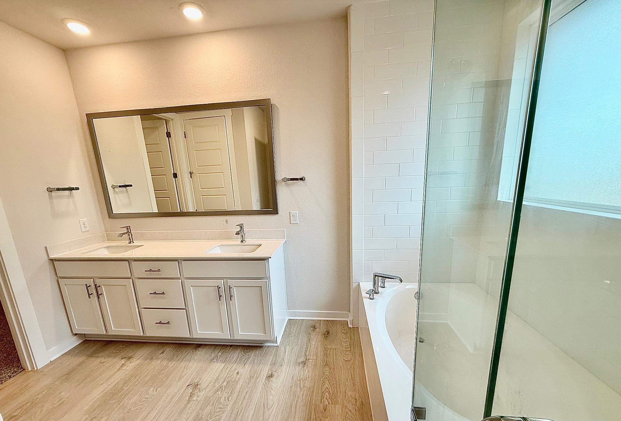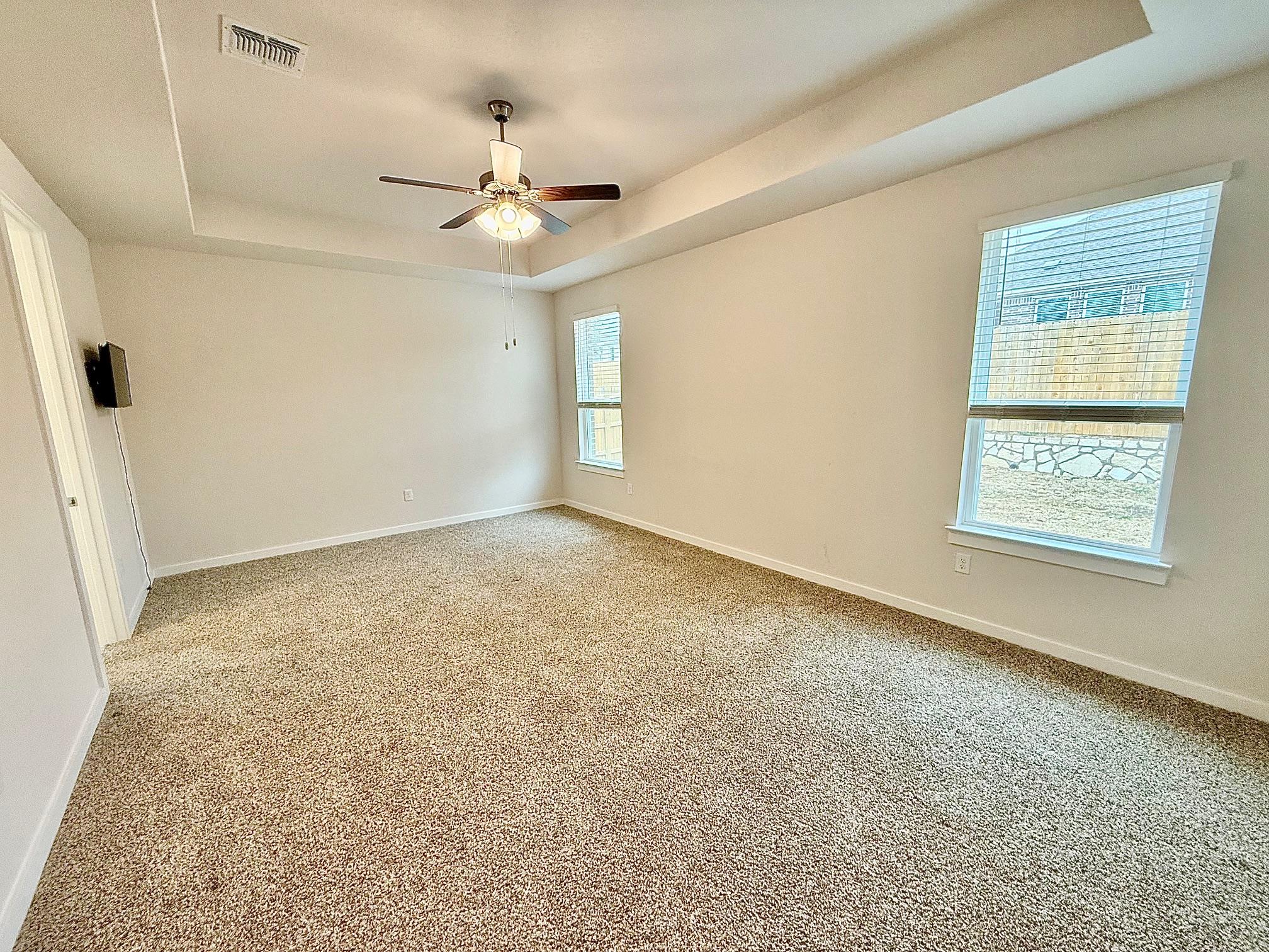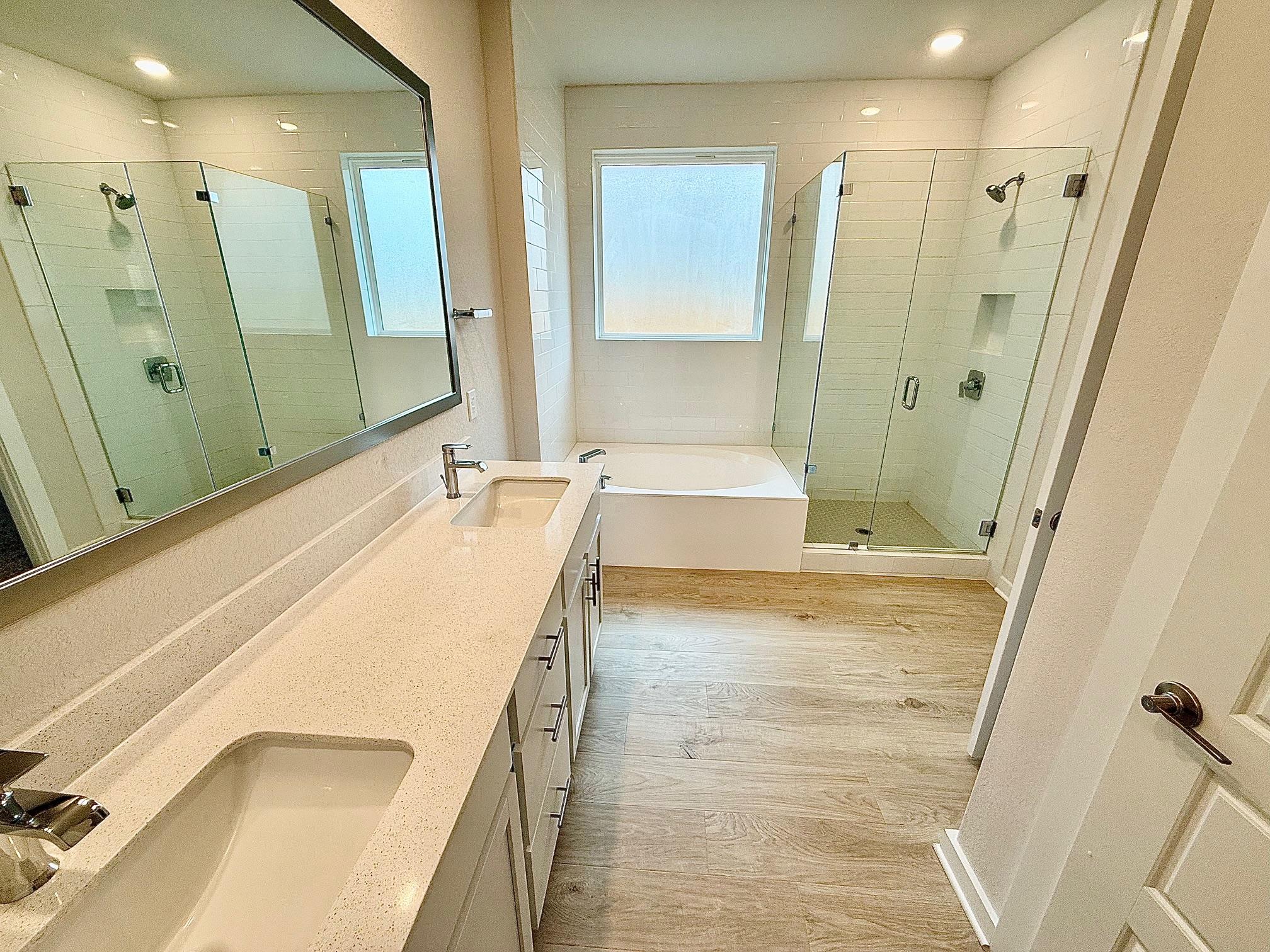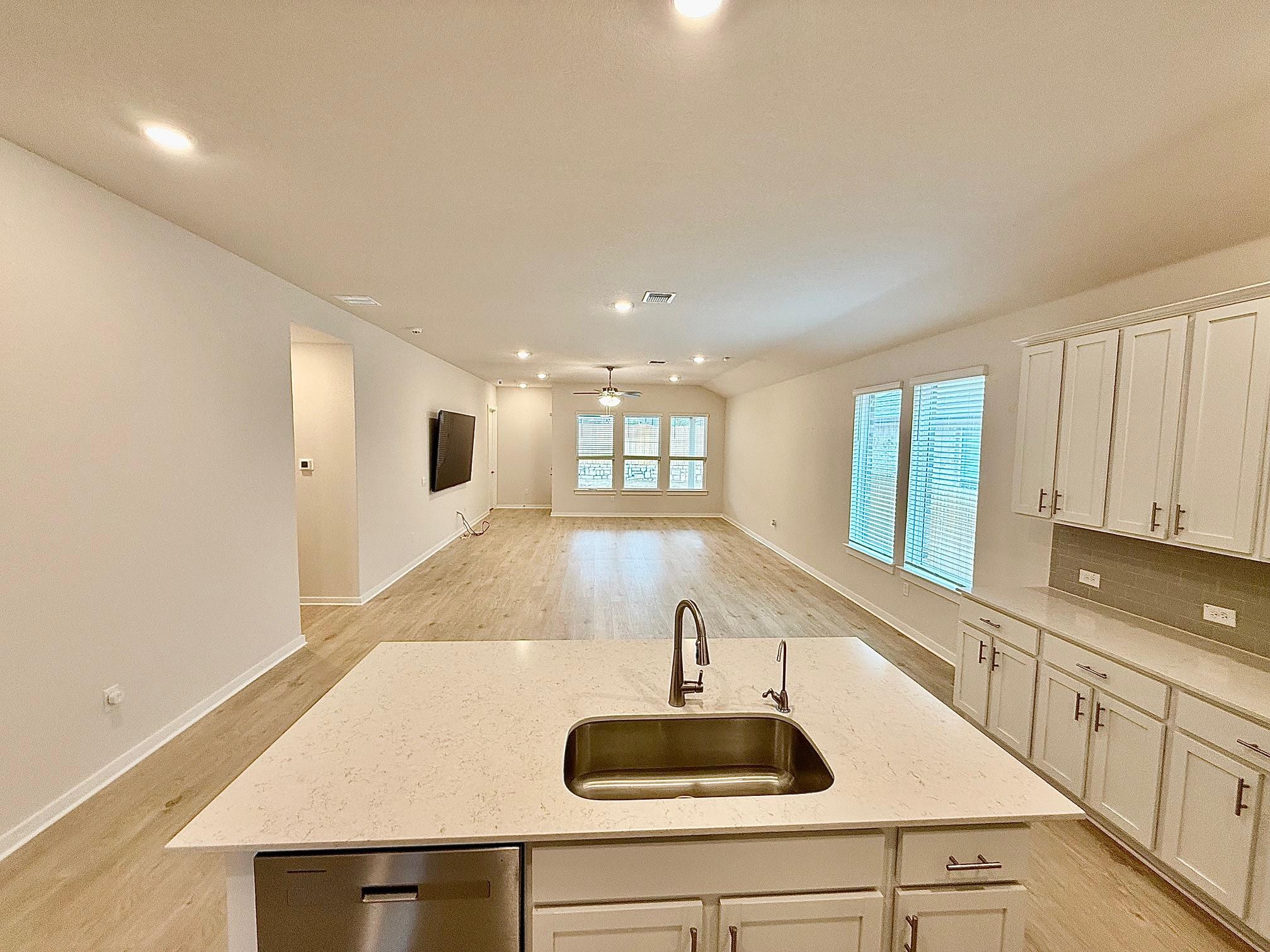 Step into modern comfort and style with this beautifully designed single-story home, built in 2023, offering an expansive 2,209 SF open floor plan with 4 bedrooms and 3 full bathrooms. Nestled in a prime location with a 20-foot easement buffer for added privacy, this home boasts a striking brick and limestone exterior, a welcoming covered front porch, and an 8-foot wood and 5-panel glass entry door that sets the tone for its contemporary charm. Enjoy high ceilings and an airy open-concept layout, seamlessly connecting the living, dining, and kitchen areas - perfect for entertaining or relaxing. The chef's kitchen features quartz countertops, white shaker cabinets, a stylish subway tile backsplash, stainless steel appliances, and a refrigerator. Luxury vinyl plank flooring flows throughout the main living spaces, while plush carpet in the bedrooms adds warmth and comfort. The primary suite is a true retreat with a dual vanity, spa-like bath, and ample closet space. Designed for convenience and efficiency, this smart home includes a camera doorbell, 8-foot interior 5-panel doors, 2" faux wood blinds, and a washer & dryer. A water softener and whole house filtration system ensure top-quality water throughout. Step outside to a large extended covered patio, ideal for outdoor gatherings or peaceful evenings. Located just minutes from shopping, and dining, and with easy access to 183 tollways, this home offers a perfect blend of comfort and accessibility. Plus, enjoy fantastic community amenities, pool and playscape. Conveniently located elementary and middle schools are just around the corner. Available June 1st - don't miss the chance to make this exceptional home yours!