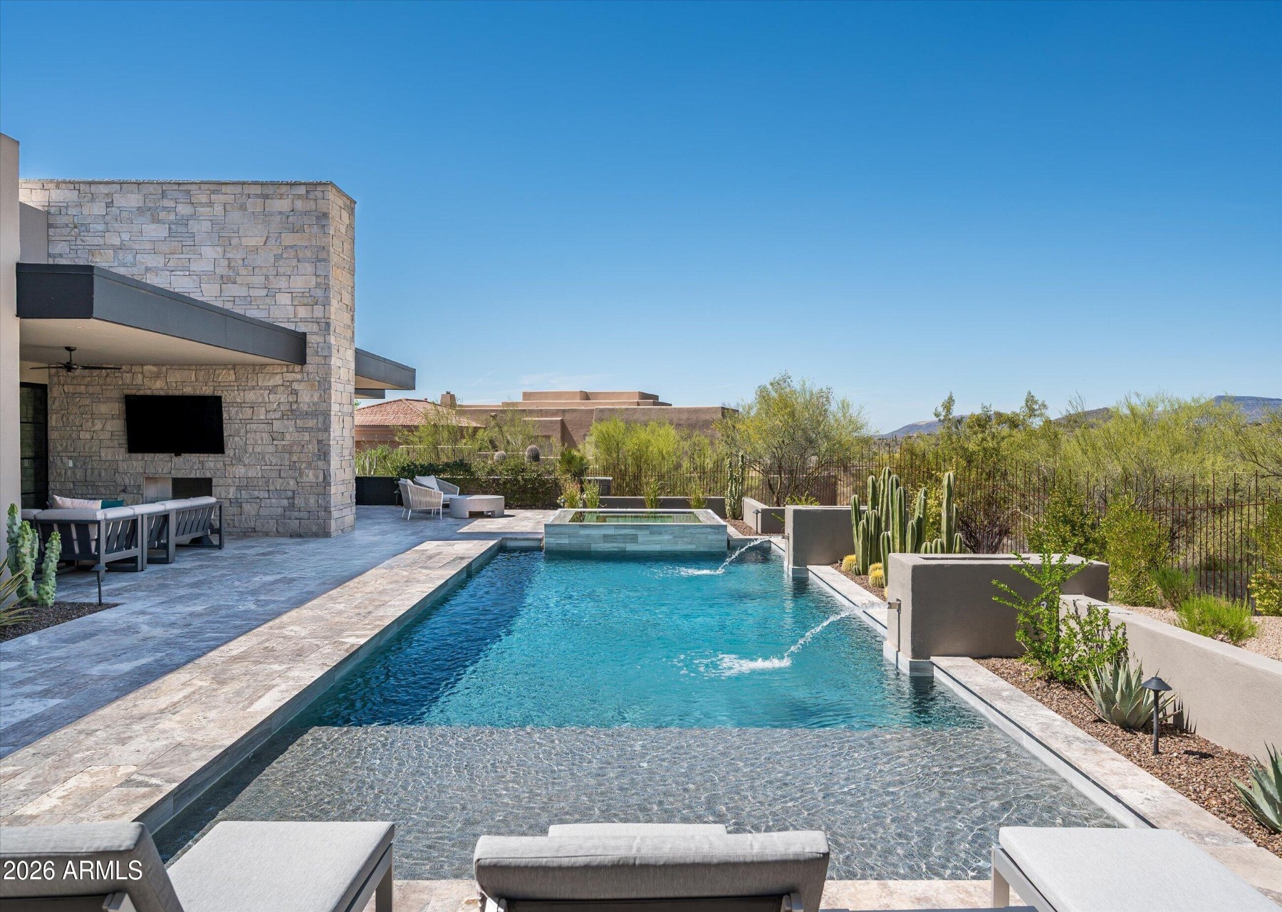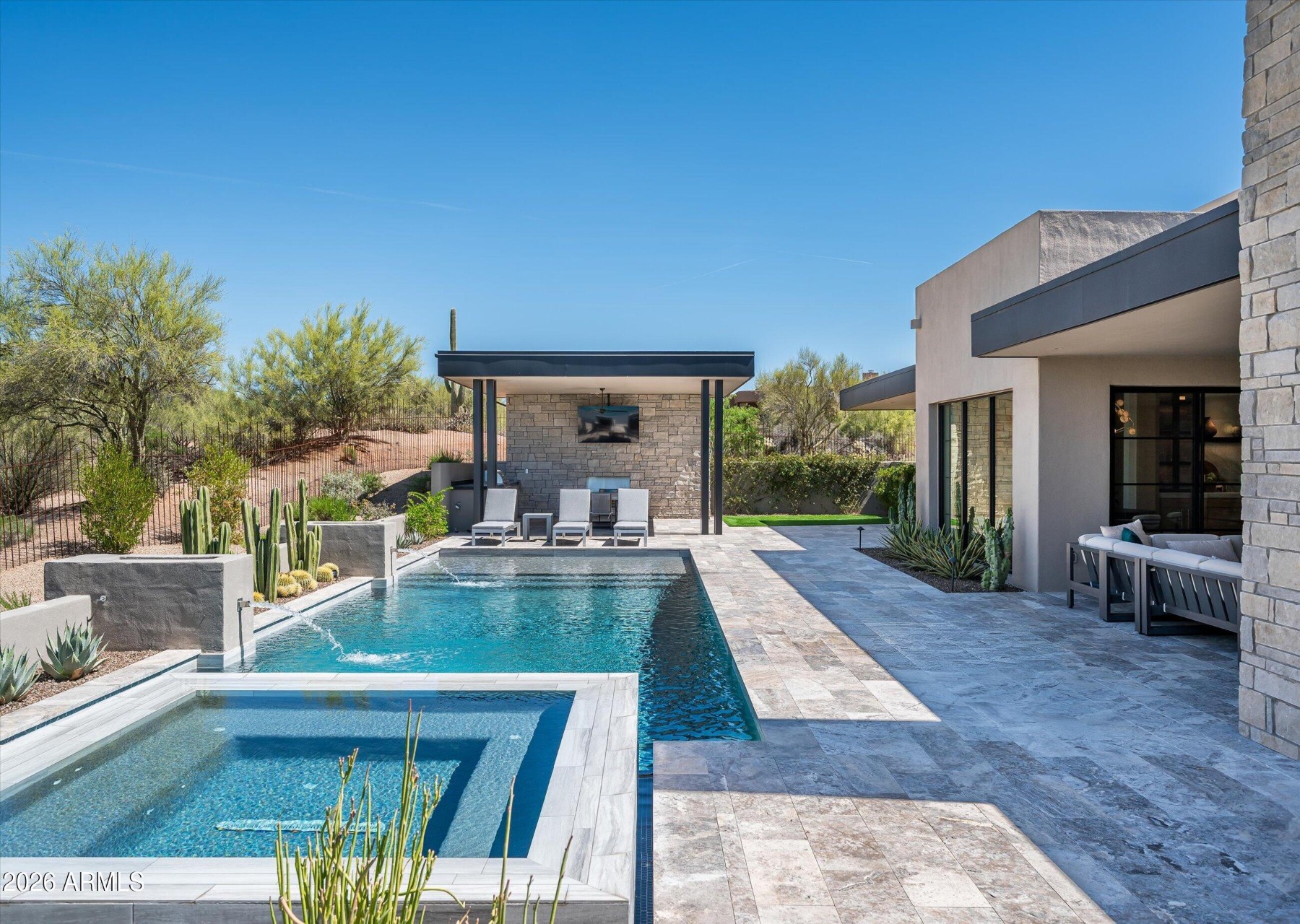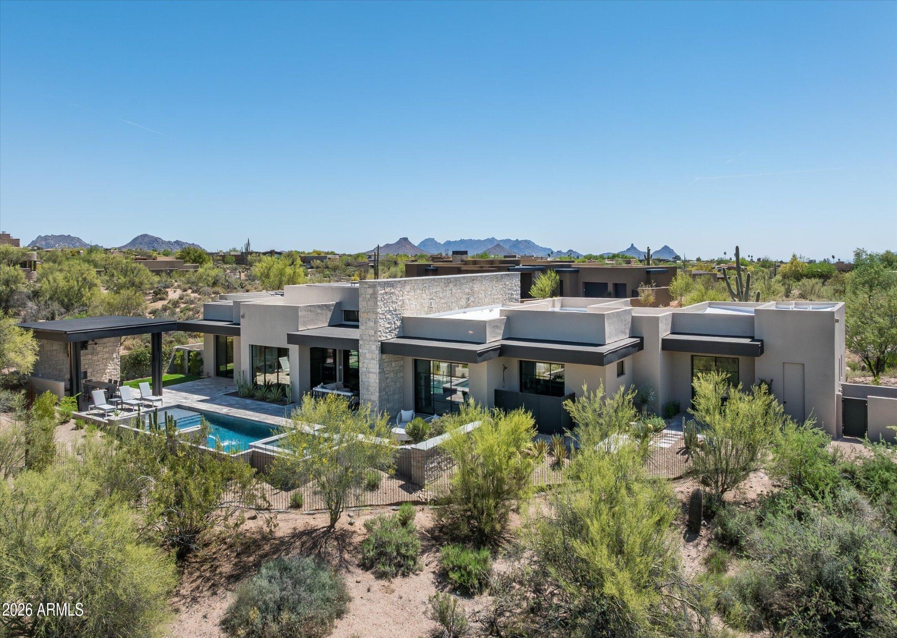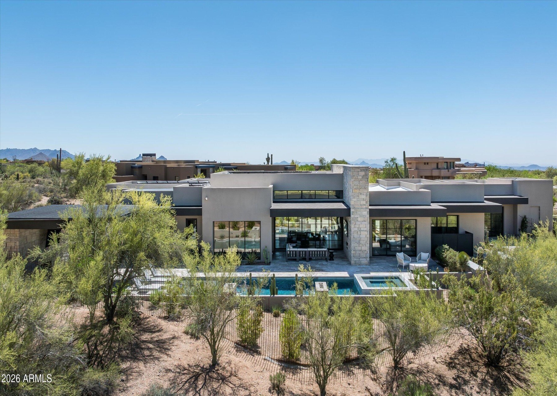 New golf listing in prestigious Desert Mountain--where luxury, design, and breathtaking scenery come together seamlessly. This nearly new, fully furnished, single-level contemporary masterpiece showcases an exceptional great room floor plan, thoughtfully designed for both everyday living and effortless entertaining. A full golf membership available, elevating the Desert Mountain lifestyle experience. From the moment you enter, you're greeted by panoramic desert views stretching across Lone Mountain and glowing sunset horizons. Walls of glass invite the outdoors in, creating a seamless connection to the surrounding natural beauty. At the heart of the home is a stunning chef's kitchen, complemented by a secondary catering kitchen and walk-in pantry featuring. ...extensive custom cabinetry--perfect for hosting on any scale. Step outside to your private resort-style retreat. The expansive patio features a sparkling pool and spa, dramatic water and fire elements, and a covered lanai ideal for BBQs, al fresco dining, and outdoor living with TV. An additional covered lounge area with fireplace and TV provides the perfect setting to unwind--all while taking in Arizona's unforgettable sunsets. The home is richly appointed with upgraded designer finishes, custom lighting, smart home system with motorized shades throughout, solar array, auxiliary batteries and EV charger (details below).A separate two-room attached casita offers ultimate flexibility, complete with its own living area, kitchen, and en-suite bedroom--ideal for guests or extended stays. The professionally designed landscape enhances both privacy and curb appeal, while custom furnishings are included to create an immediate, elegant setting. This is Desert Mountain living at its finest--refined, relaxed, and absolutely unforgettable.Solar info (owned):60 Enphase. panel array (24 kW)2 Enphase batteriesEV Charger info:High speed Chargepoint EV charger (tesla and CCS)