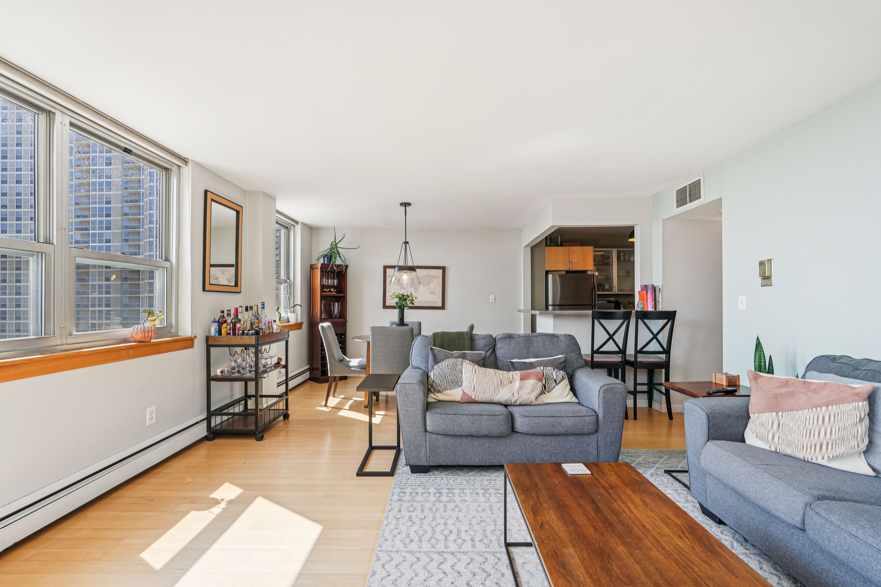 Elevated lakefront living at Edgewater Terrace. This sophisticated 6th-floor corner unit offers stunning views of Lake Michigan and McKinley Marina. Flooded with natural light, the spacious two-bedroom, two bathroom layout features an east-facing living/dining area, a modern kitchen with stainless steel appliances, primary bedroom with an ensuite bath and an updated second bath. Enjoy an assigned covered parking space, in-unit laundry and a pet-friendly community just steps from the Oak Leaf Trail, Lakefront Festivals, and downtown nightlife. The 17th-floor rooftop solarium and deck provide a premier setting for fireworks and panoramic city vistas. An ultra-inclusive HOA simplifies your lifestyle by covering heat, AC, high-speed internet, cable, and 24/7 security. Live where the city meets the shore in this sought-after Prospect Ave location!