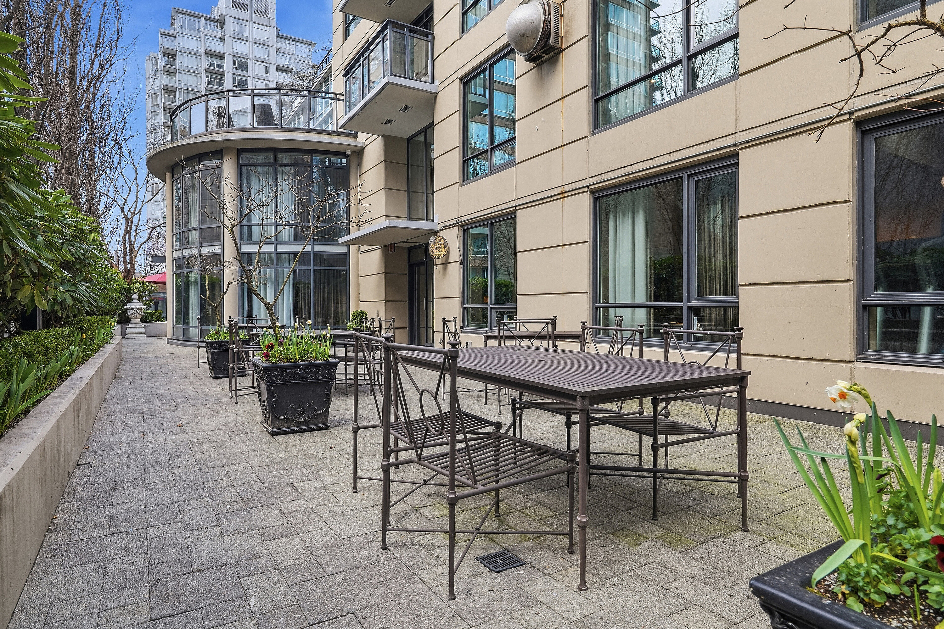 Welcome home to L’Hermitage. This 617 sq.ft. home is rarely avail and feat one bed plus den, one bath, efficient floor plan, open kitchen with Sub-zero and Bosch stainless steel appliances, gas stove and breakfast bar, stone counter tops, open balcony, air conditioning. Includes one parking stall, quick access to elevator. Building has great amenities for residents to enjoy including concierge, fitness studio, steam room, outdoor pool and jacuzzi, rooftop garden/terrace, meeting room, library, lounge areas. Opportunity to live in the heart of downtown and call this your home or to rent out. Central location in Downtown Vancouver, walkable to shopping, restaurants, financial district, sports and entertainment, Granville Mall, Yaletown, Skytrain station and public transit. Quick completion possible and move in ready. Suite is vacant, principal rooms are virtual staged with furniture (representation only).