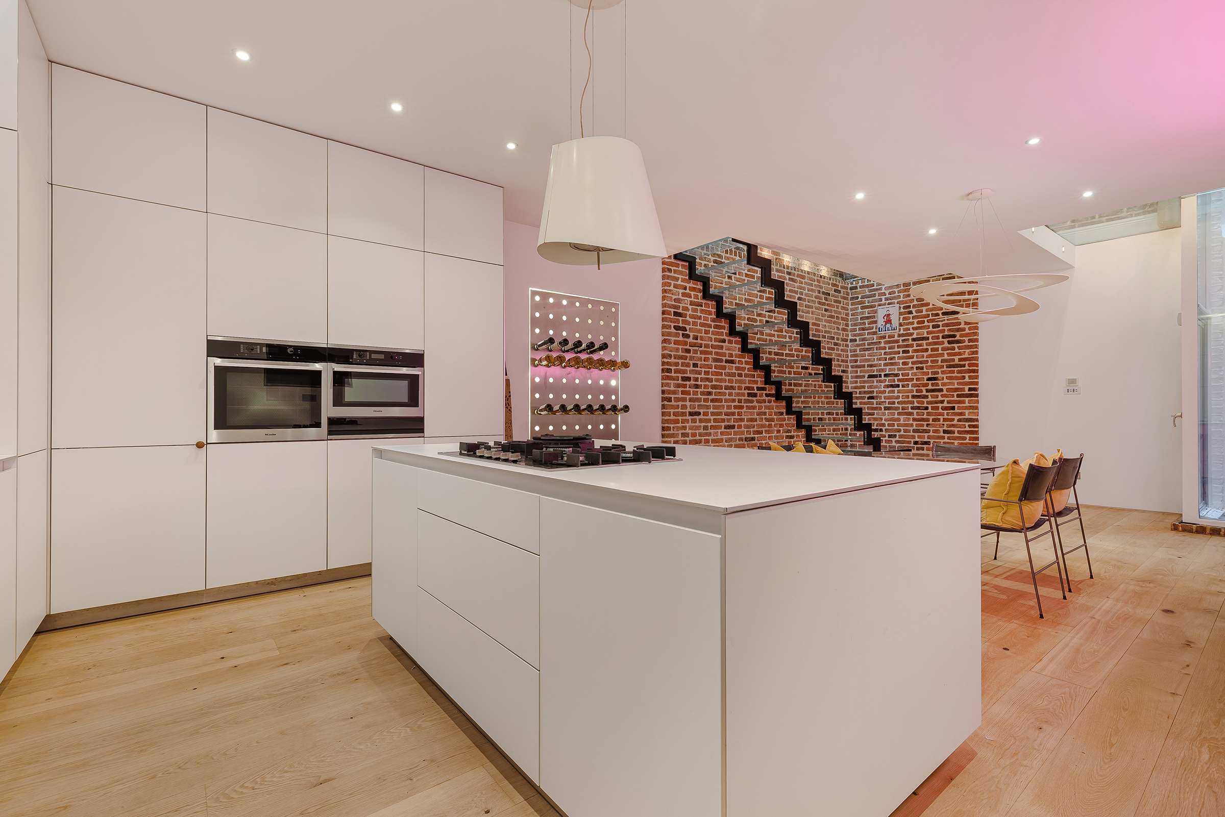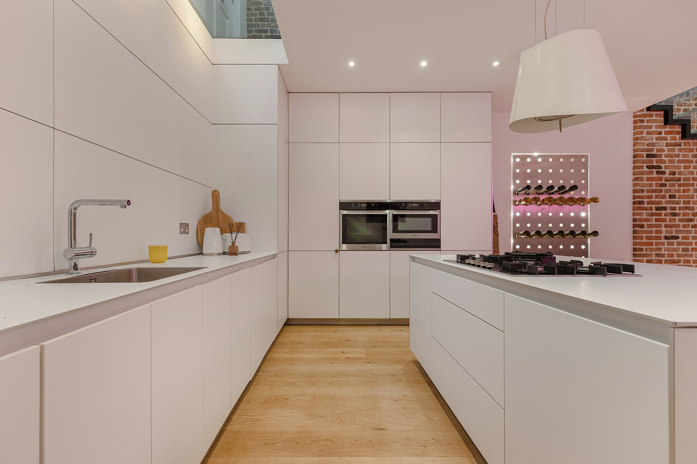 Beyond, the house opens into a remarkable kitchen and dining space. Sleek, minimalist cabinetry and a substantial central island bring a crispness to the room, offset by the warmth of the exposed brick and the softness of the lighting. There is ample room for a large dining table, and the overall effect is wonderfully sociable: a space made for dinner parties, long lunches and drinks that drift late into the evening. A lower-ground level adds another layer of flexibility, extending the entertaining footprint and giving the house an unusual sense of scale for a mews property.