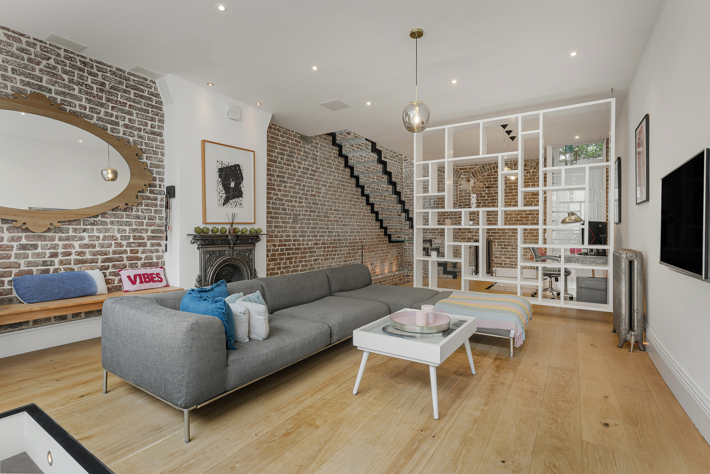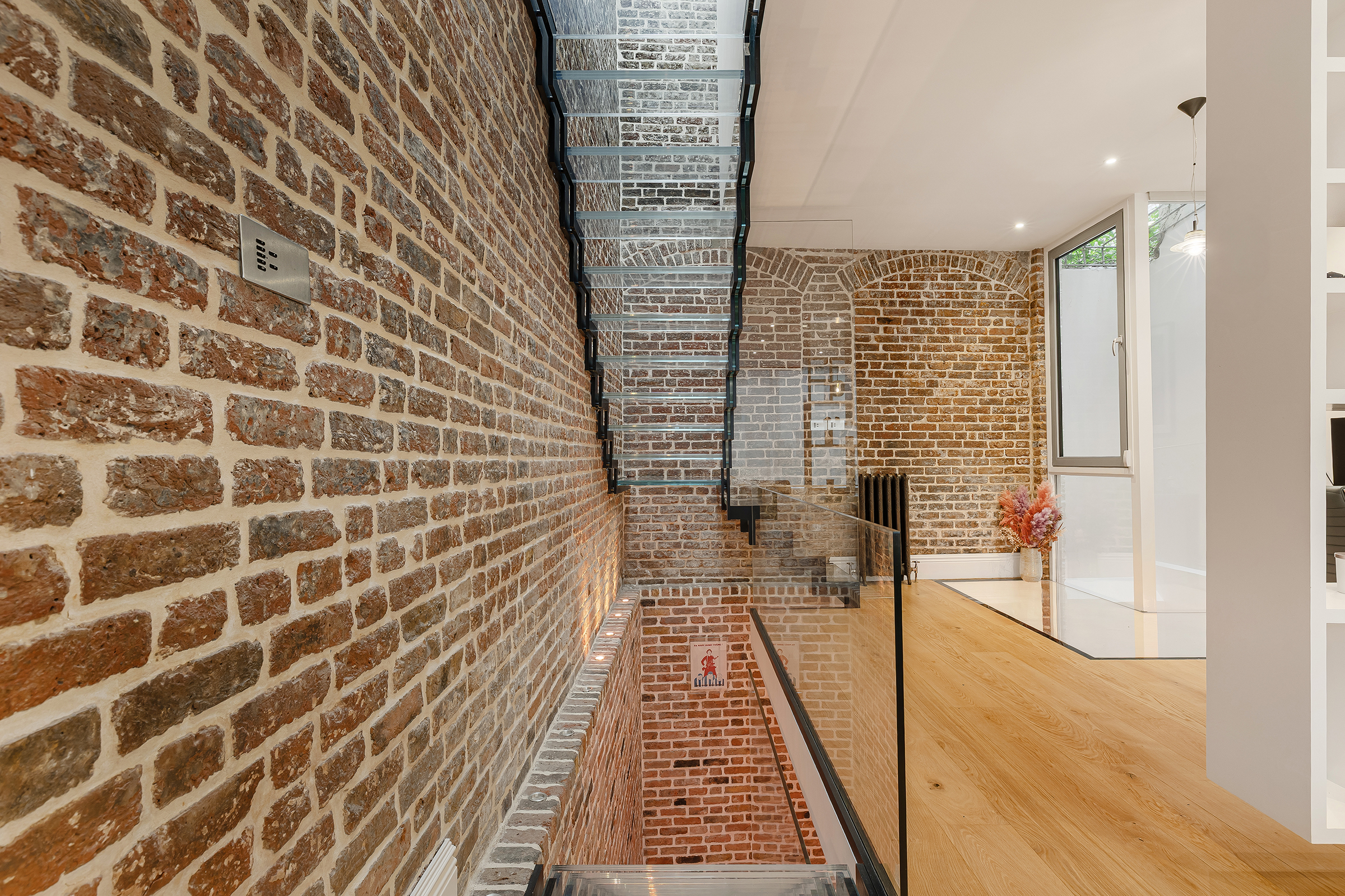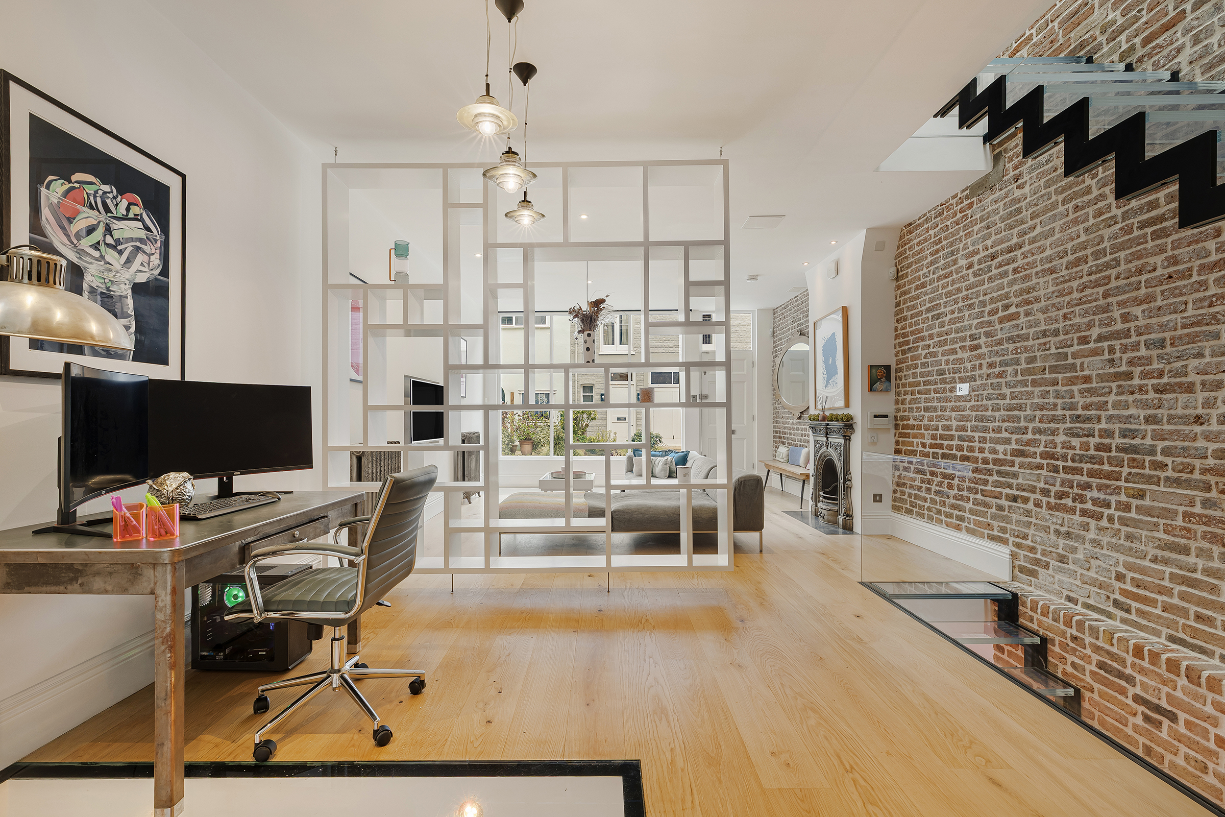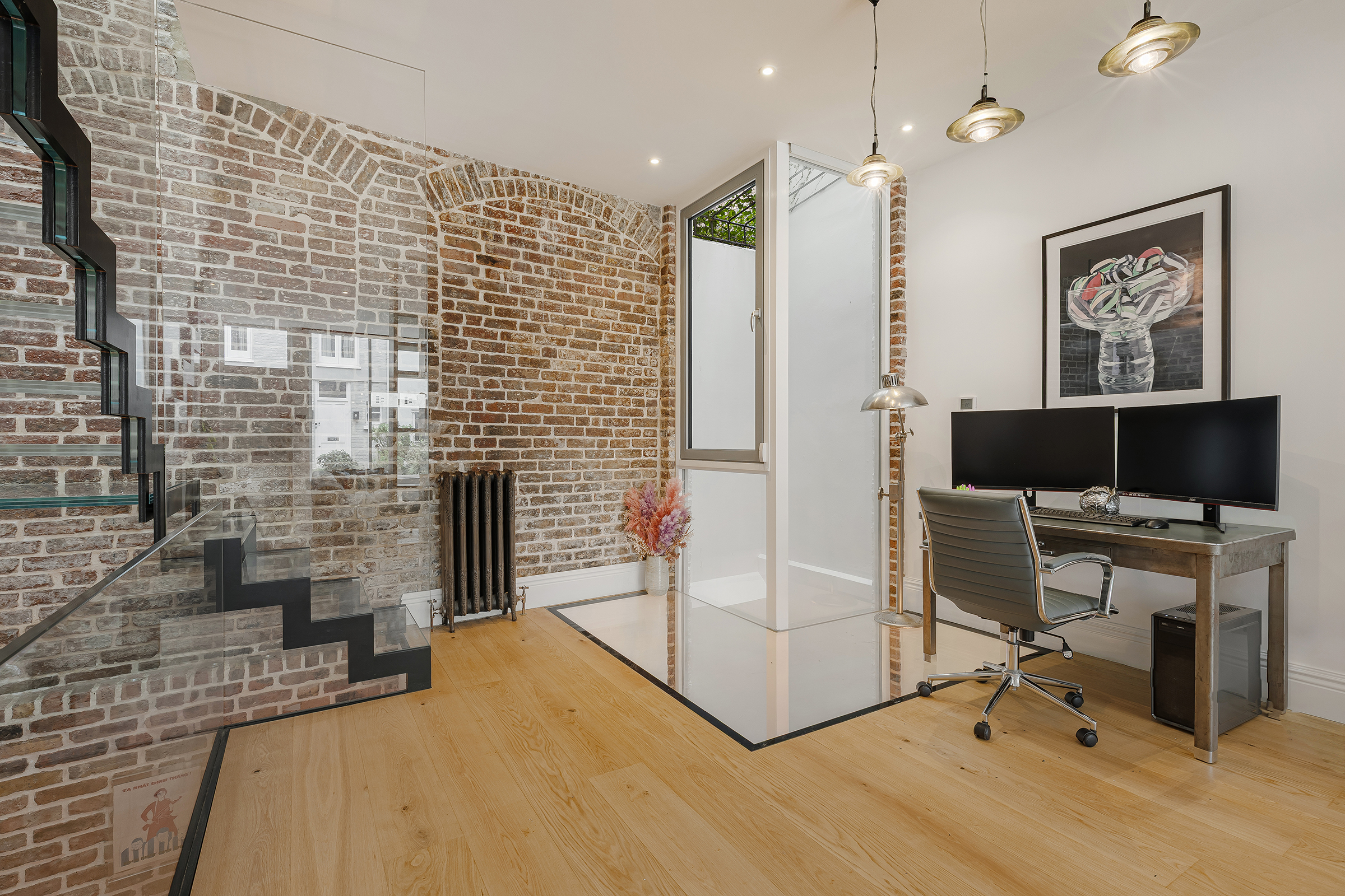The entrance level is given over almost entirely to entertaining. At the front, the reception room is dramatic yet inviting, with pale timber floors, exposed brick walls and a generous sense of volume. Open shelving and glazed partitions help define the space without interrupting the flow, while the mews-facing aspect brings in a lovely quality of natural light. There is an immediacy to the house that works particularly well here: robust textures, clean architectural lines and a layout designed for modern living rather than formality.