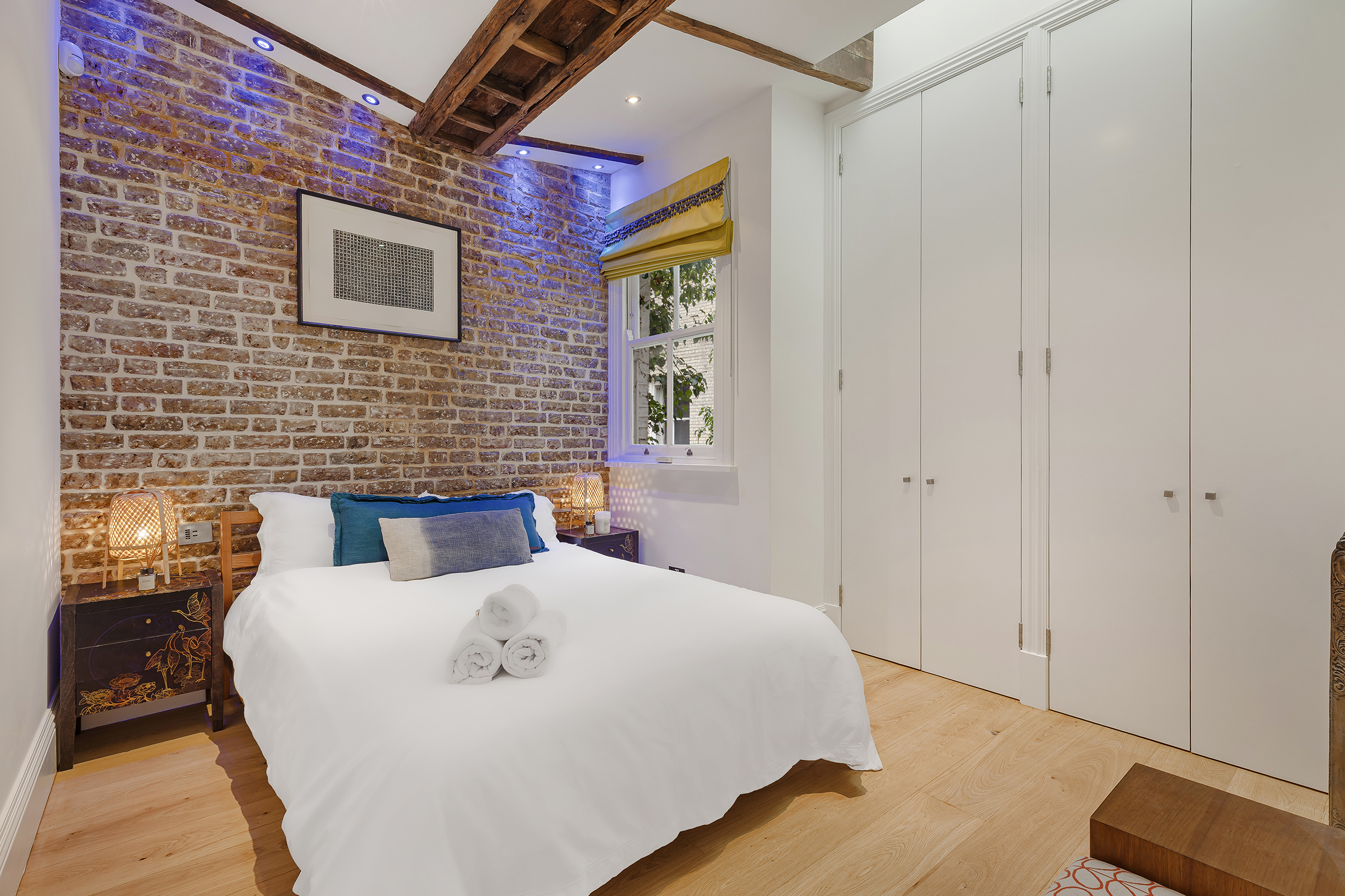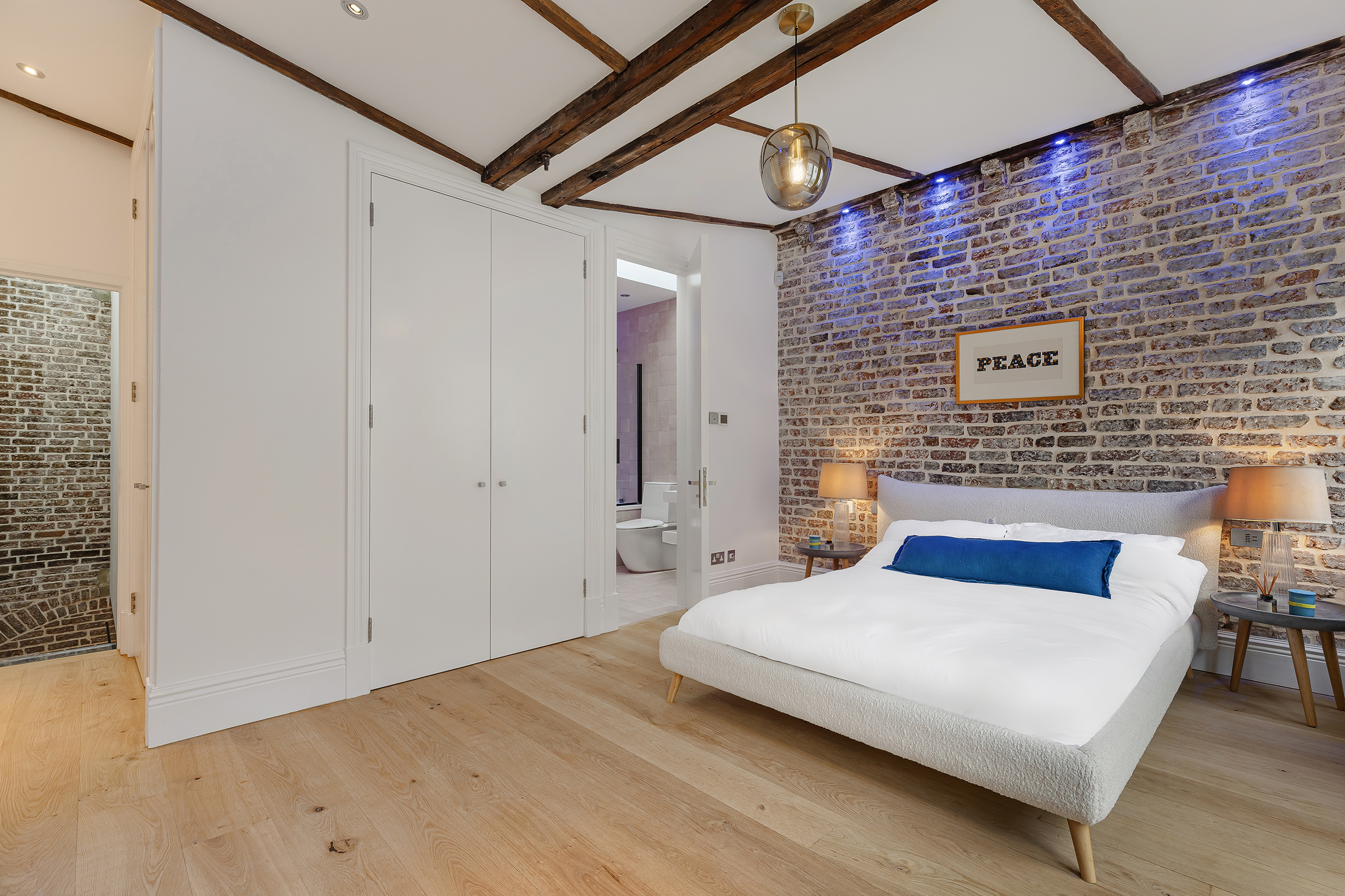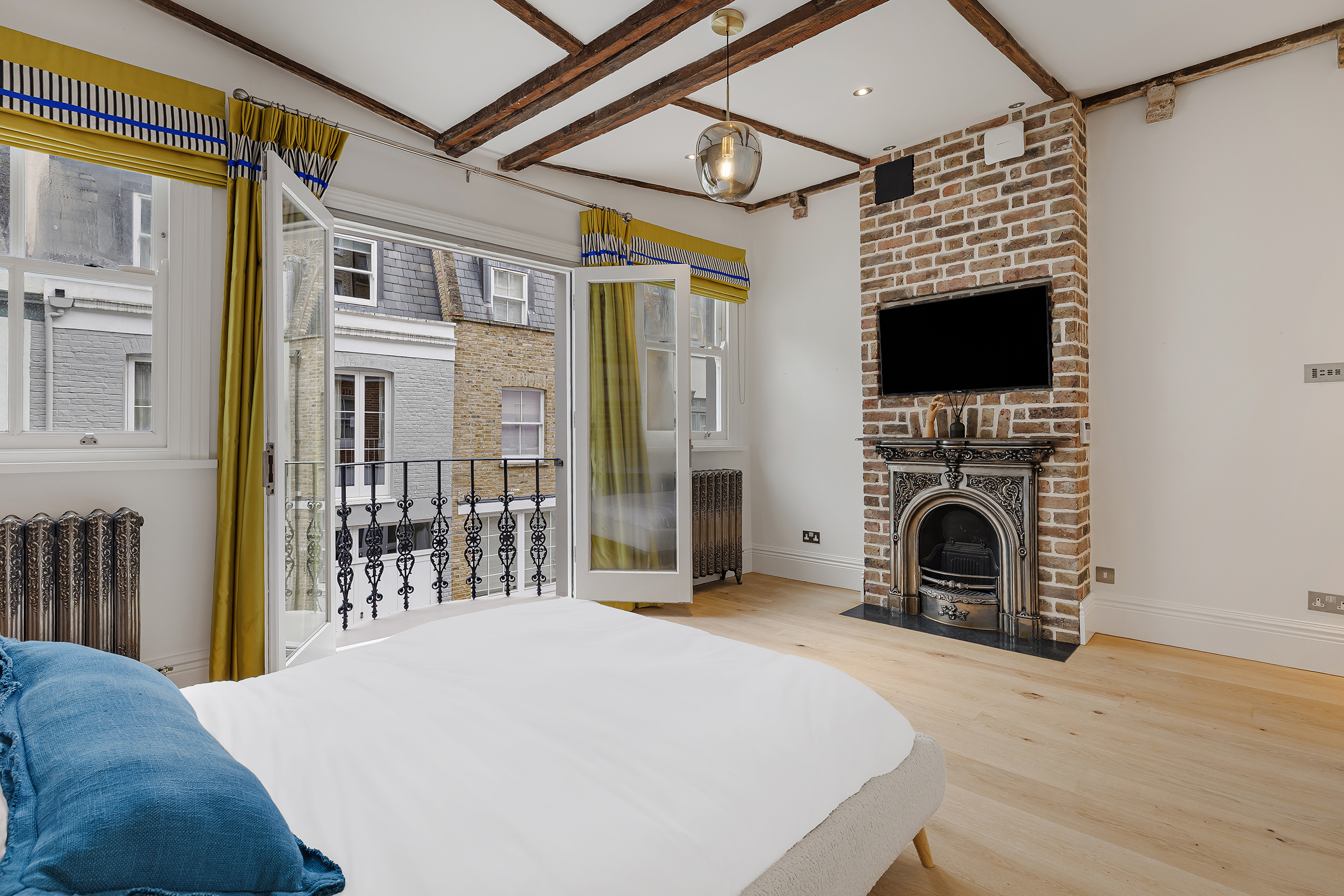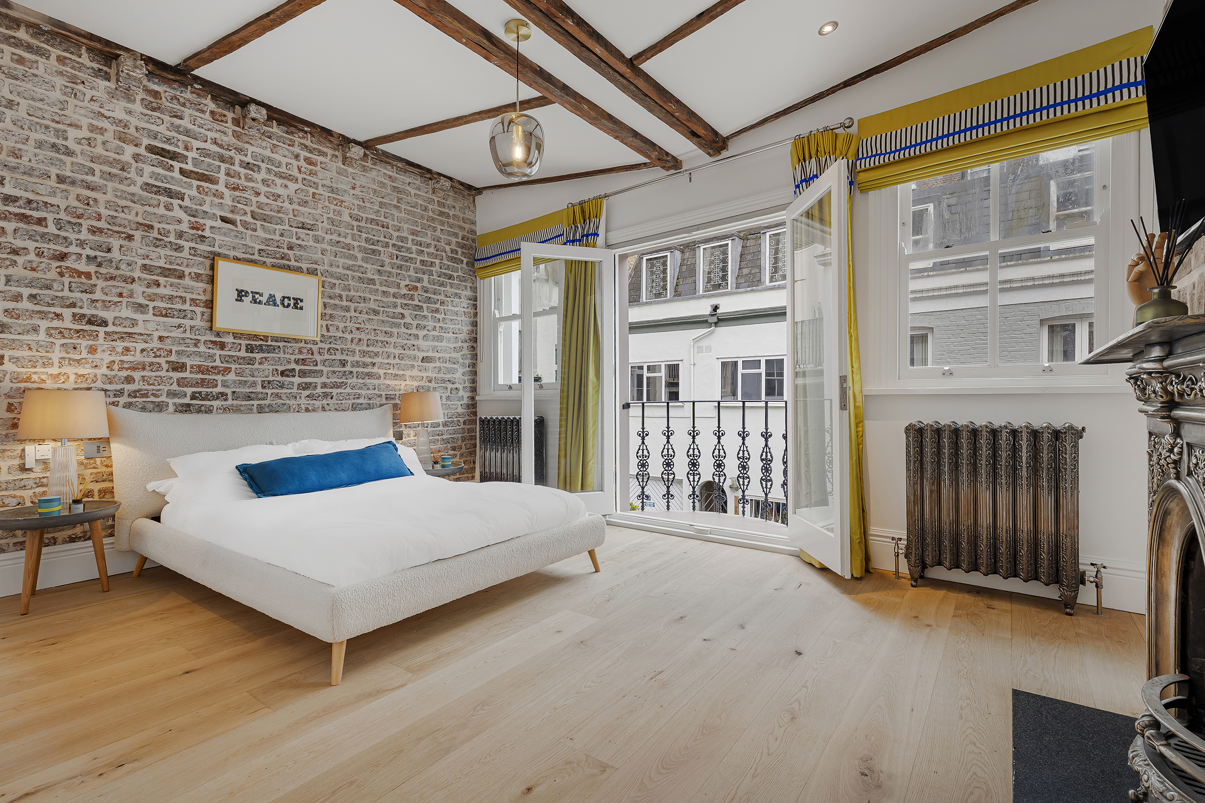 The principal bedroom occupies the first floor and is generous in both proportion and atmosphere. Exposed ceiling beams and brickwork lend texture and character, while French doors open to a Juliette balcony overlooking the cobbles below. Bespoke storage is neatly integrated, and the ensuite bathroom is finished in a pared-back contemporary style, with a bath and separate shower.