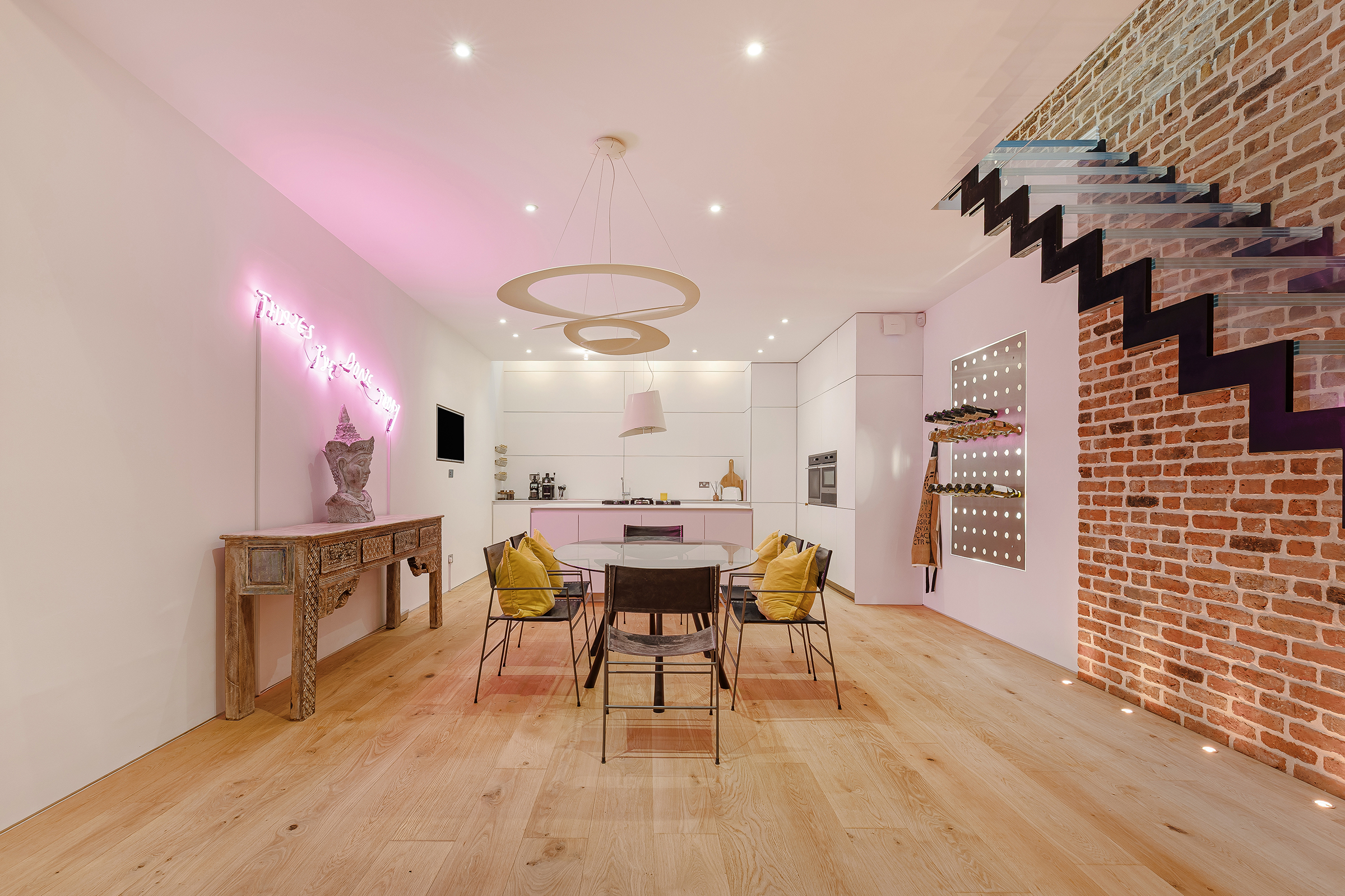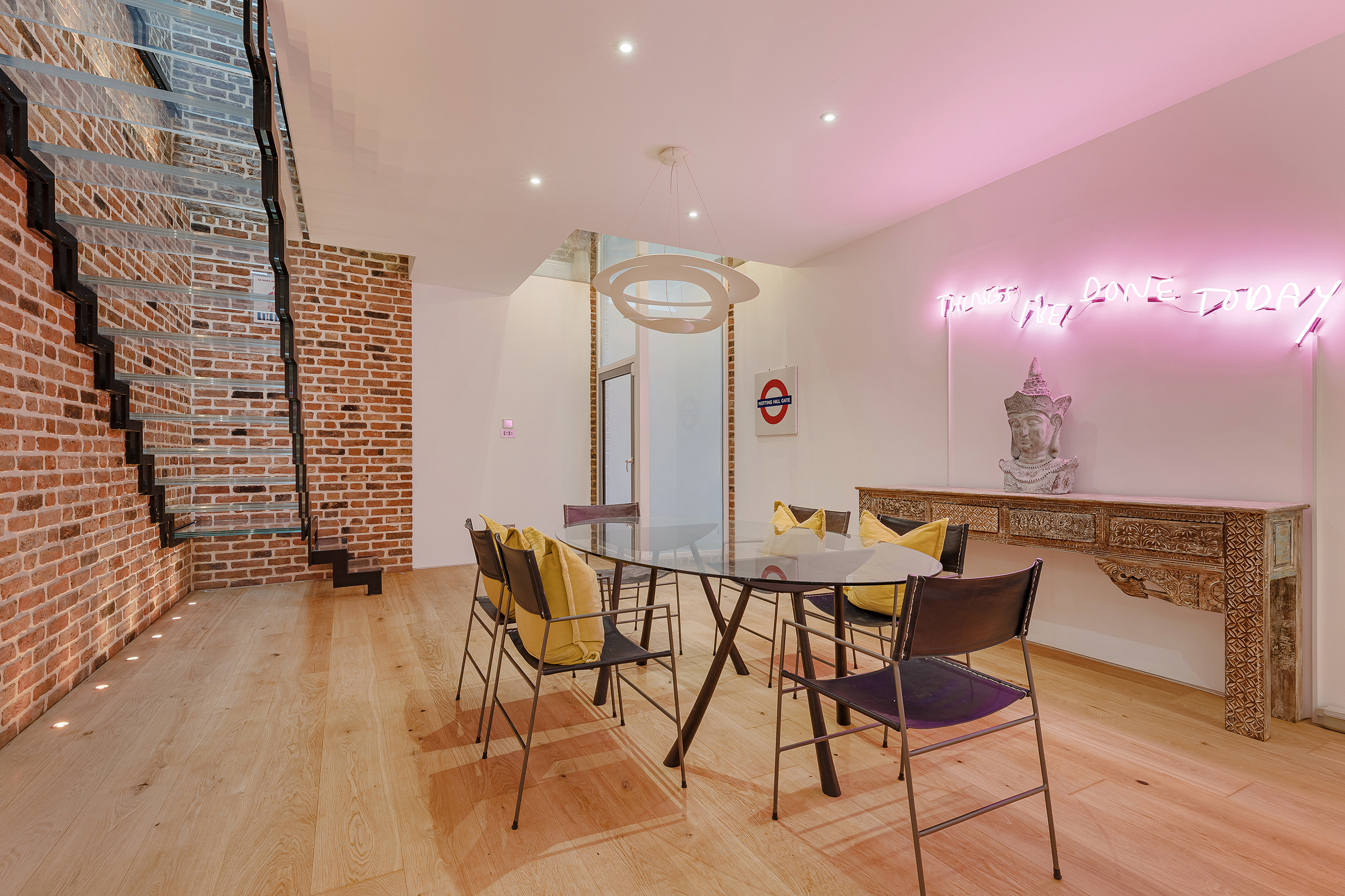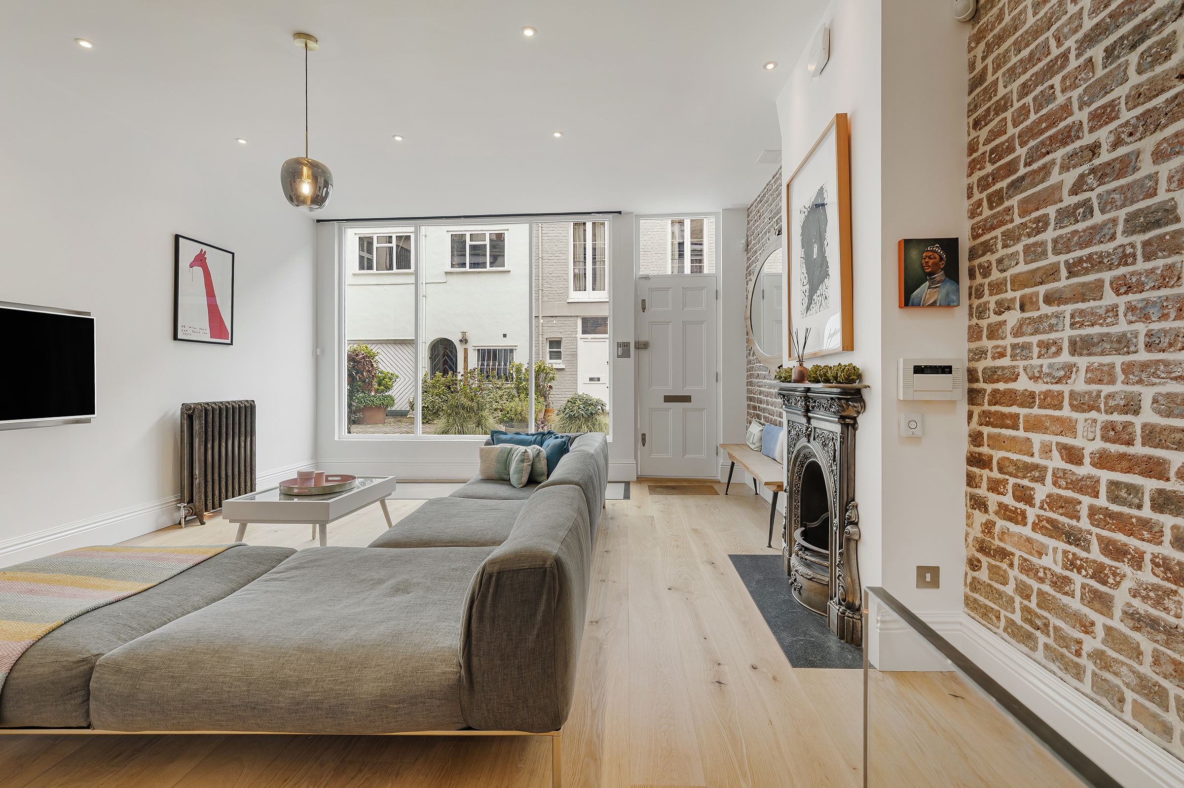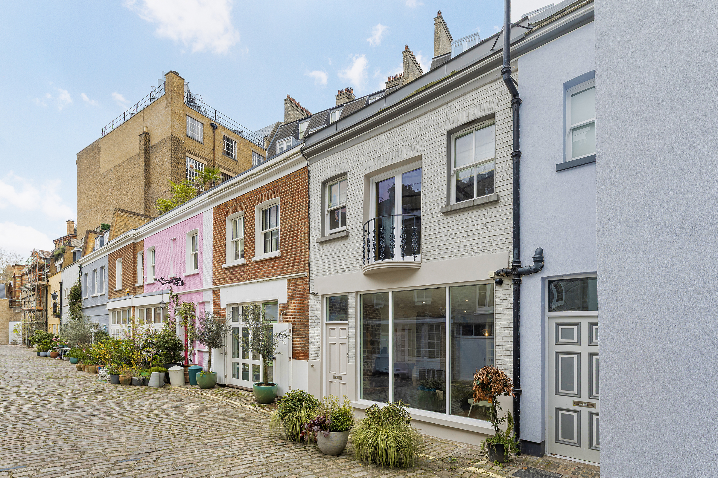 Hidden along one of west London’s prettiest cobbled mews, this striking freehold house unfolds behind a quietly characterful façade into a series of bold, high-impact interiors. Set across three floors, the house pairs exposed brick, soaring ceiling heights and sculptural staircases with a distinctly contemporary finish, creating a home that feels at once industrial, playful and polished.