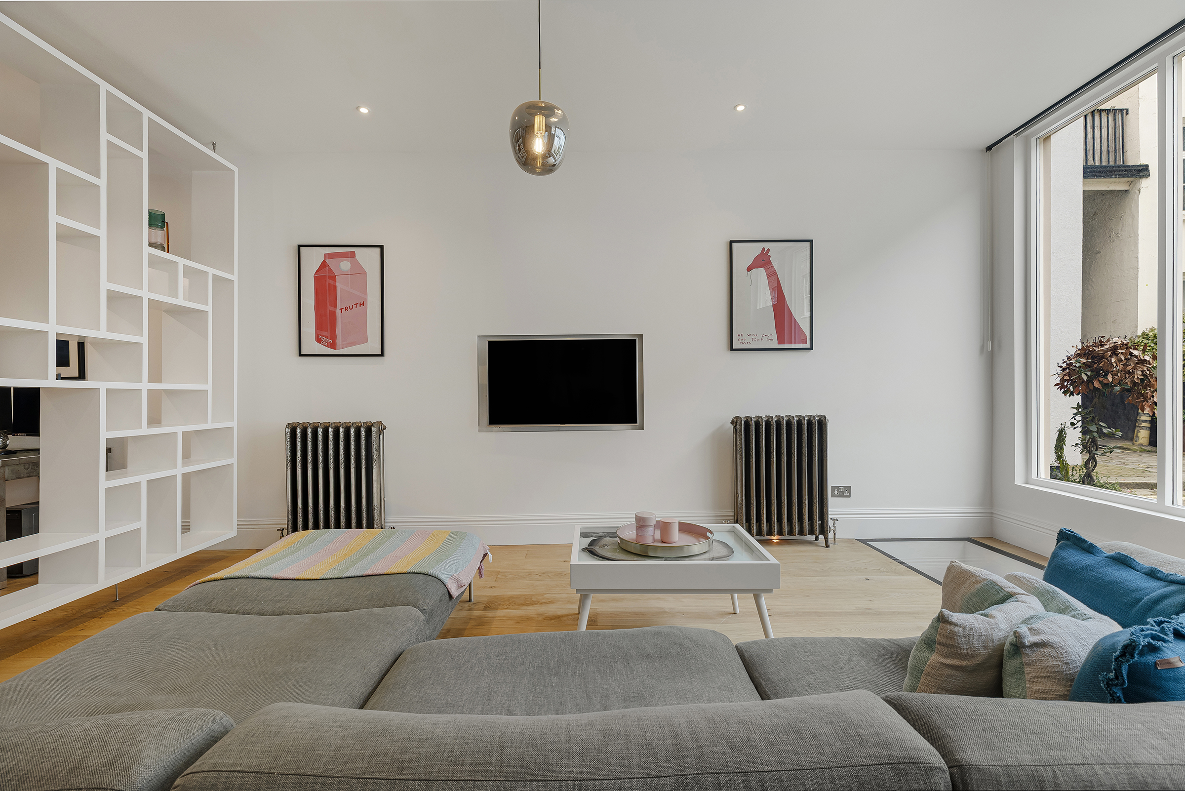 A second double bedroom is also beautifully presented, again with excellent built-in storage and its own ensuite shower room. The bedroom accommodation is calm and well judged, balancing the more theatrical feel of the entertaining spaces below with something more restful and understated.