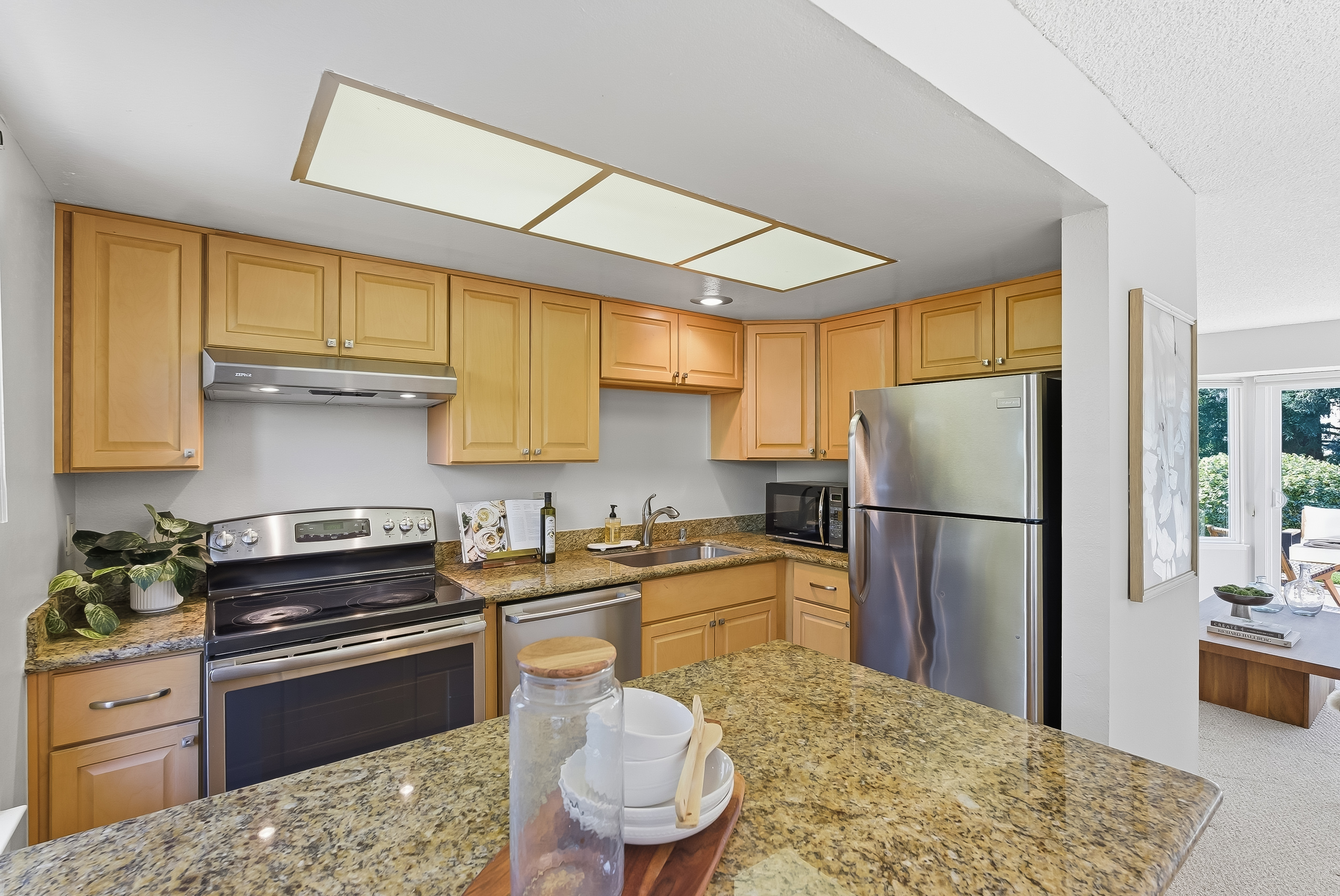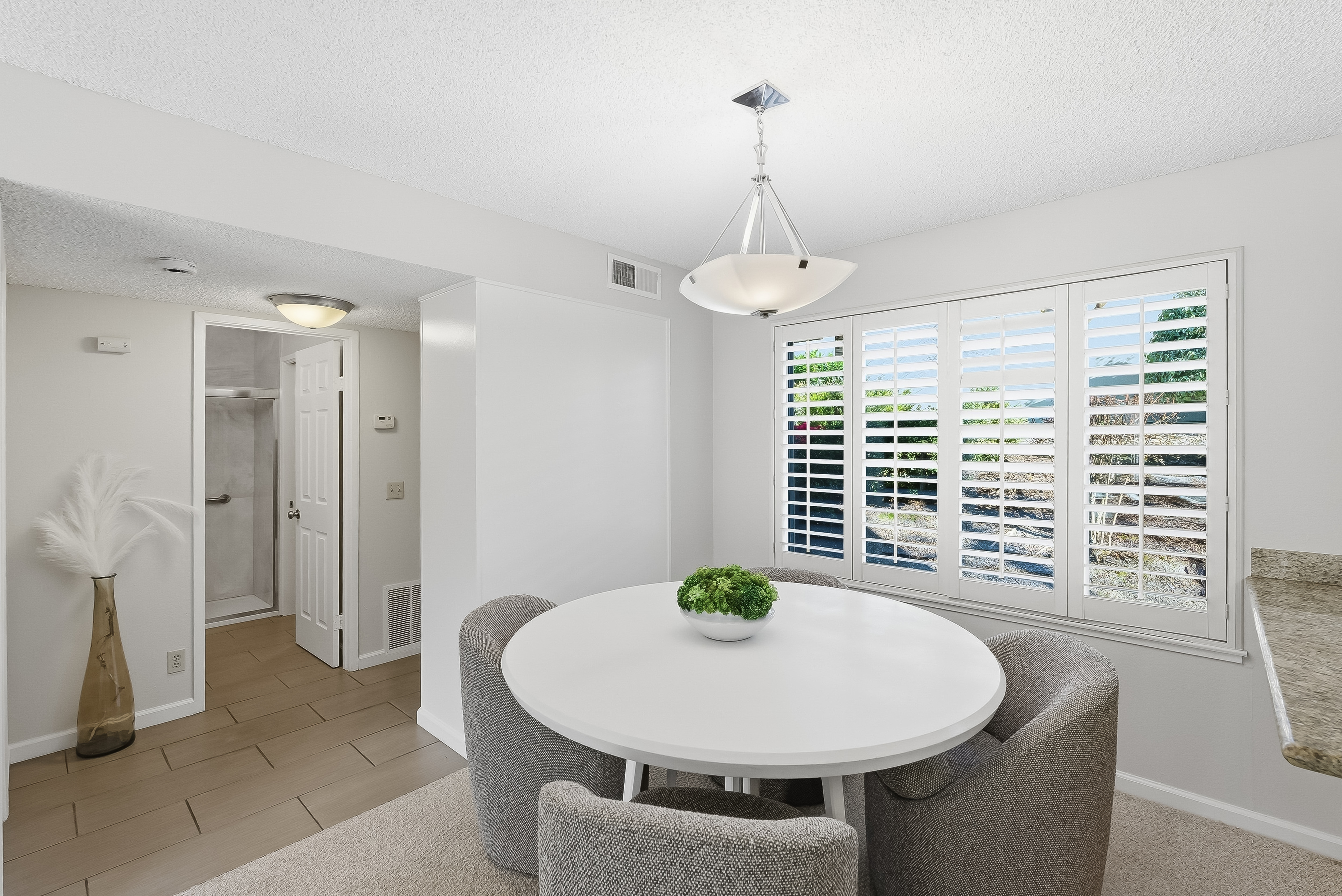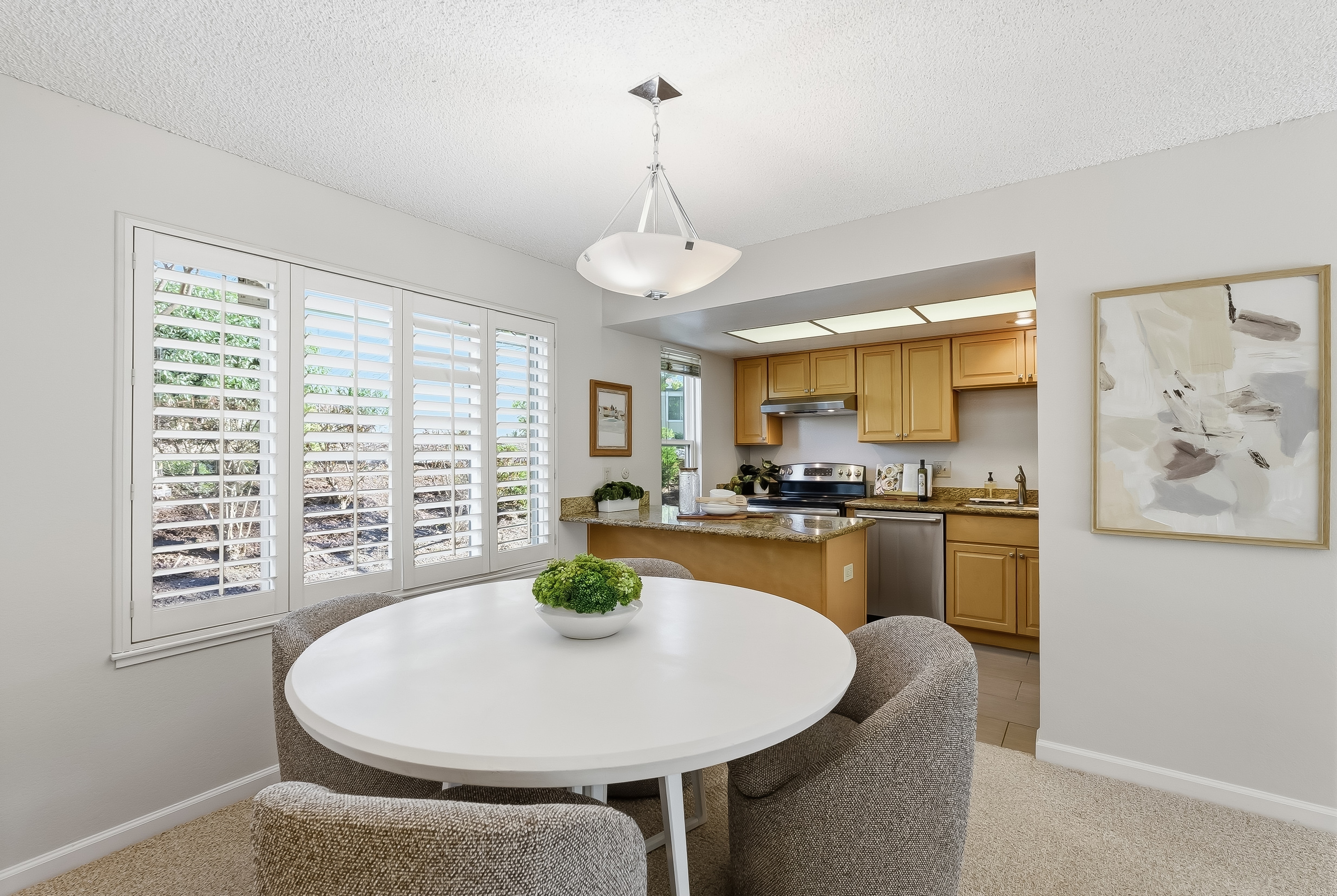 This light and bright ground-floor Cypress model condominium (not a co-op) offers an inviting blend of comfort, privacy, and thoughtful updates. Fresh interior paint, dual-pane windows, central air conditioning, plantation shutters, and top-down/bottom-up cellular shades create a clean, modern feel throughout. Bay windows and a sliding glass door fill the spacious living and dining area with natural light. The recently remodeled bathroom features a generous walk-in shower with grab bars, dual shower heads with a handheld option, a new vanity, updated lighting, modern hardware, and a separate laundry room with a side-by-side washer and dryer. The updated kitchen includes maple cabinetry, extensive granite countertops with bar seating, and stainless steel appliances, including a refrigerator. The inviting outdoor patio offers peaceful views and is surprisingly quiet thanks to its elevated lot. Additional conveniences include mailboxes smartly relocated near the front door, carport #7 with extra storage, and ample guest parking. Rossmoor is a premier 55+ gated community best known for its resort-style amenities, active social scene with over 200 clubs, and scenic 1,800-acre location. Residents enjoy 27 holes of golf, five clubhouses, multiple pools, fitness centers, and maintenance-free living.