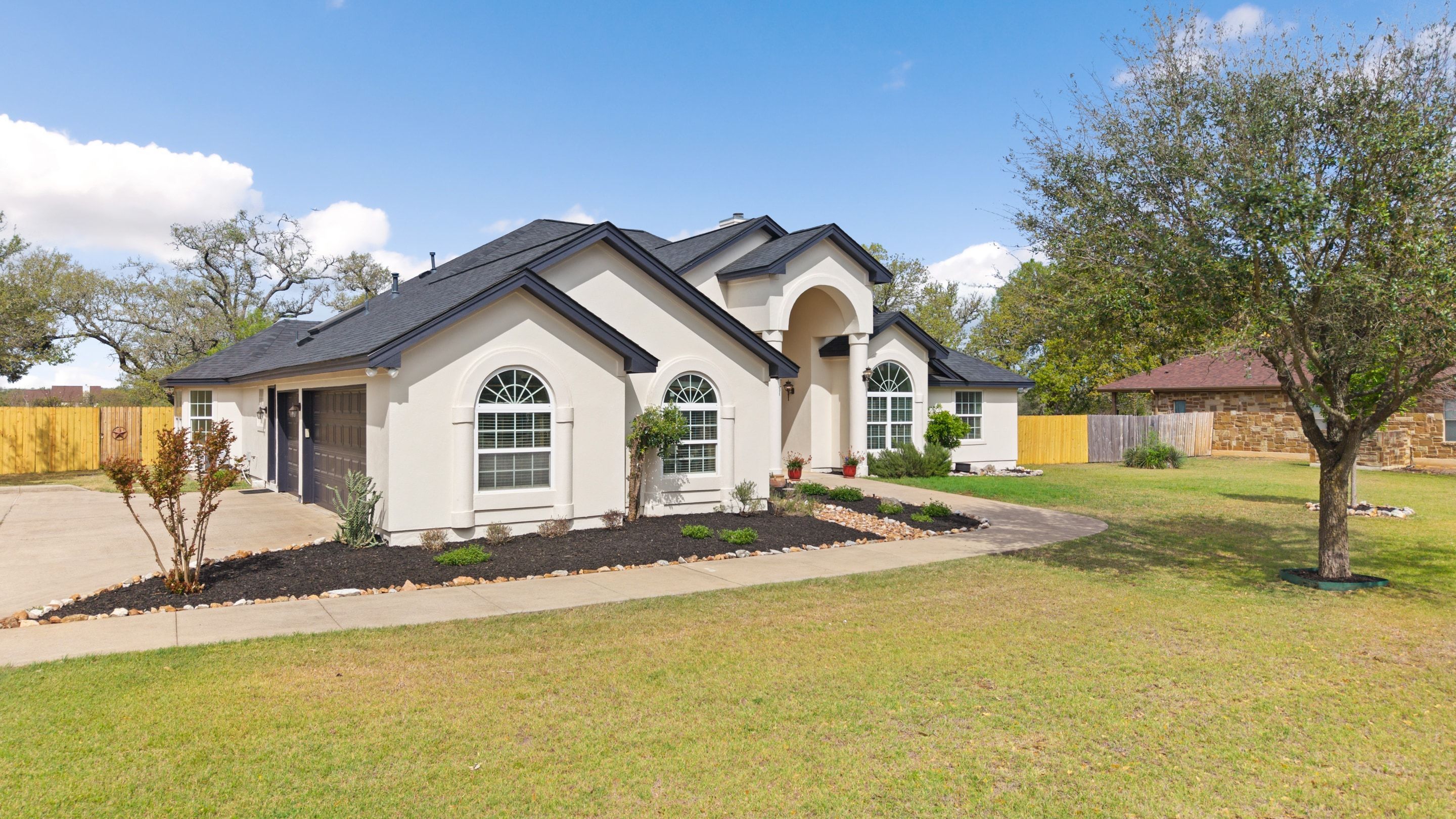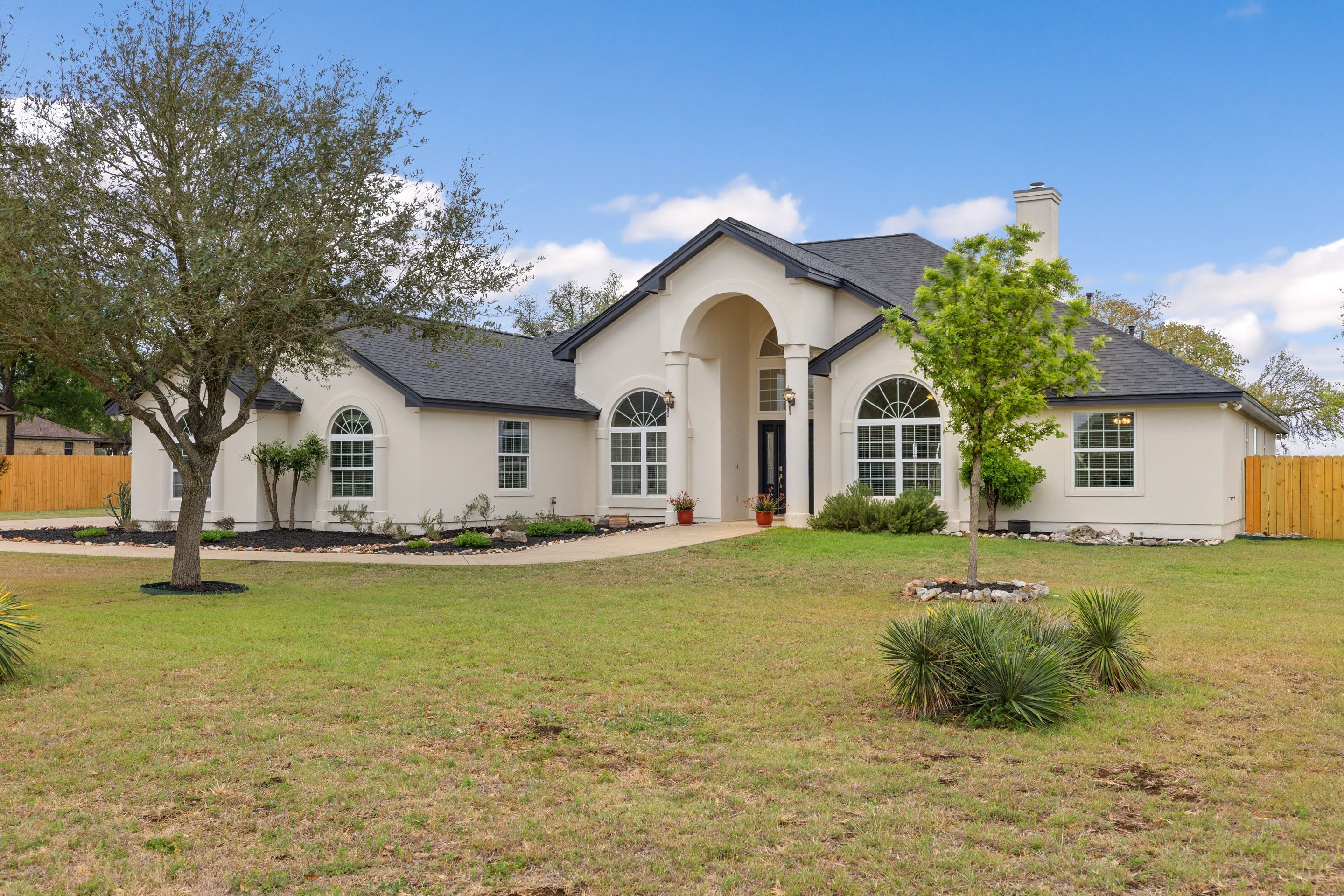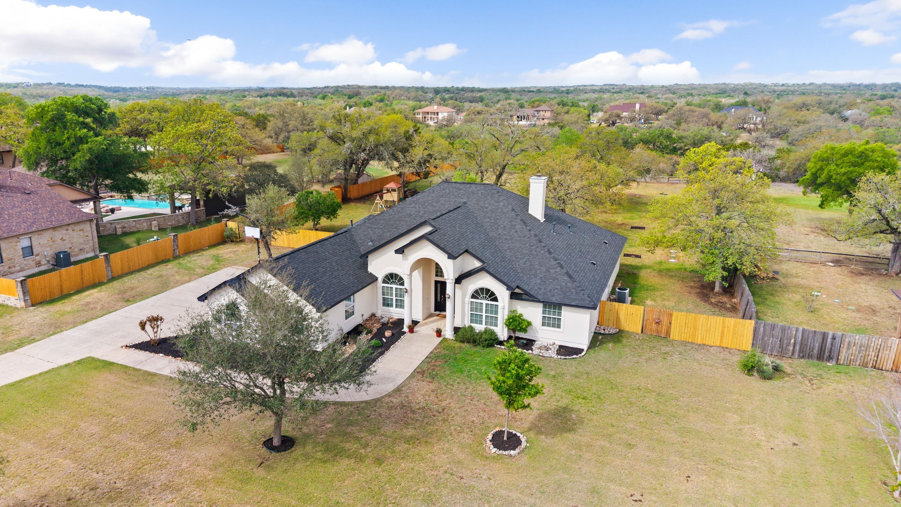 Set within the gated Estate section of Ruby Ranch, this single-story residence sits on two usable acres shaded by mature Live Oaks and backing directly to Onion Creek—an uncommon combination of privacy and Hill Country beauty that’s increasingly hard to find this close to Austin.This custom home spans 3001 square feet with four bedrooms and three full baths, laid out for both daily function and easy entertaining. The main living area is anchored by a wood-burning fireplace and framed by double French doors that pull in natural light and long views of the property. The kitchen, dining, and living areas connect seamlessly while maintaining clear, defined spaces—striking a balance between openness and thoughtful separation.Out back, an expansive covered patio opens to gorgeous Live Oaks, a creekside setting, and peaceful sunsets. Gather around the firepit for evening chats or nurture homegrown vegetables and herbs in the garden. Wildlife and open sky replace traffic and noise. The level backyard is ideal for a pool and casita. Create your own oasis!A dedicated office sits apart from the main living areas, and a flexible secondary space can shift with your needs—fitness, media, or play. The utility room is oversized and practical, with storage that keeps daily life out of sight, a sink and room for a second refrigerator.The primary suite is positioned for privacy and includes direct patio access. The generous bath is designed with scale in mind—a separate soaking tub surrounded with natural light, walk-in shower, dual vanities, and a thoughtfully configured walk-in closet with built-in organization that maximizes usability.A side entry three-car garage supports both storage and hobby use, and the property benefits from a low 1.71% tax rate. The roof was replaced in November 2025 and has a transferable warranty. Ruby Ranch is known for its acreage homes, quiet setting, and access to the broader Hill Country lifestyle—while still keeping you within reach of Buda, Kyle, San Marcos, and Austin for dining, work, and day-to-day needs. This is the kind of property people hold onto for a long time—and for good reason.