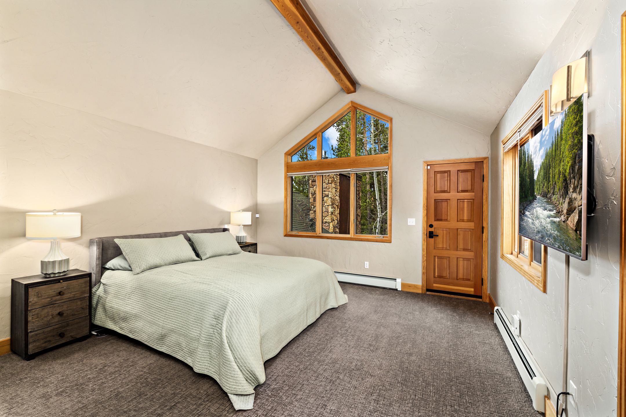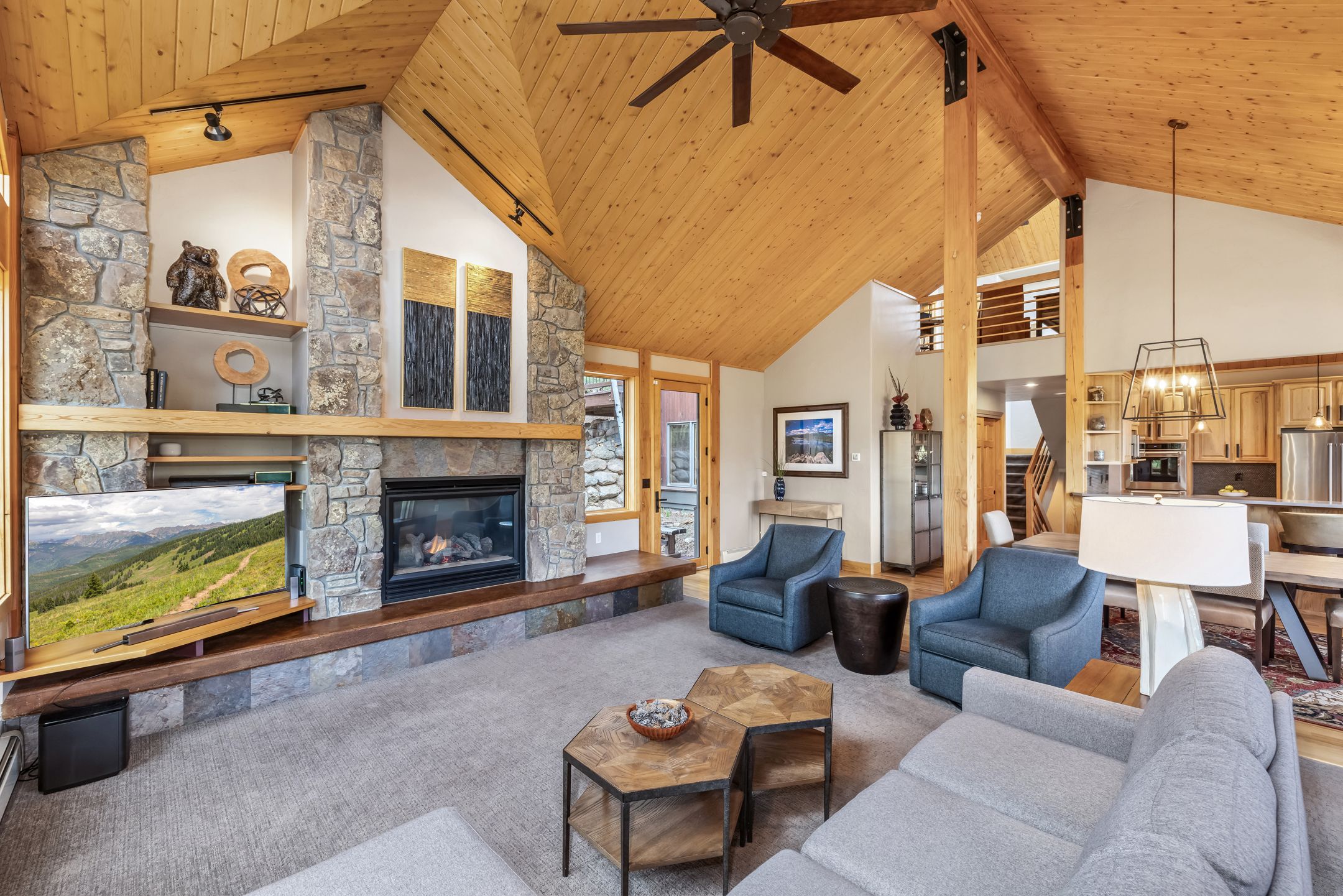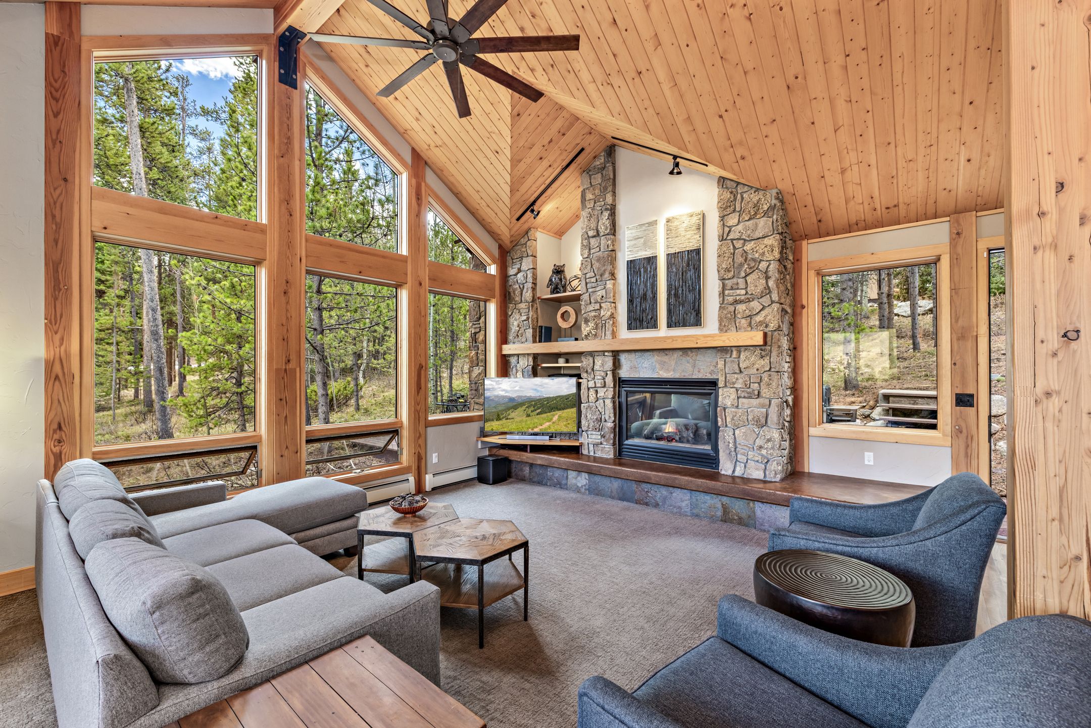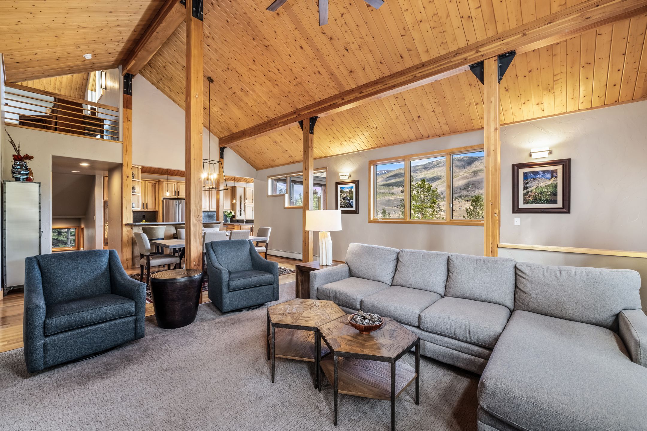 Beautifully updated 4-bedroom Eagles Nest home situated on a peaceful wooded lot with serene mountain views to the east. Relax and enjoy the private outdoor living spaces. Inside, the vaulted ceilings, floor-to-ceiling windows, exposed beams, stone fireplace, and strong natural light add to the allure of the open living area. The fireplace with a heated hearth creates a distinct focal point, designed for year-round use and comfort. The great room connects to the dining area, kitchen, and breakfast nook. Enjoy updated finishes throughout, including quartz countertops. Use the loft, currently a dedicated office, as your office, extra living space, or workout area. The four bedrooms include two gracious primary suites. The garage walks into a well-appointed room for storing outdoor equipment. Newer water heater, boiler, and exterior paint. This home is located within the Raven Golf Club community at Eagles Nest, with easy access to not only golf, but also hiking trails. Silverthorne amenities are nearby, as well as the five world-class ski areas. Only 2.5 miles to the Dillon Reservoir and I-70.