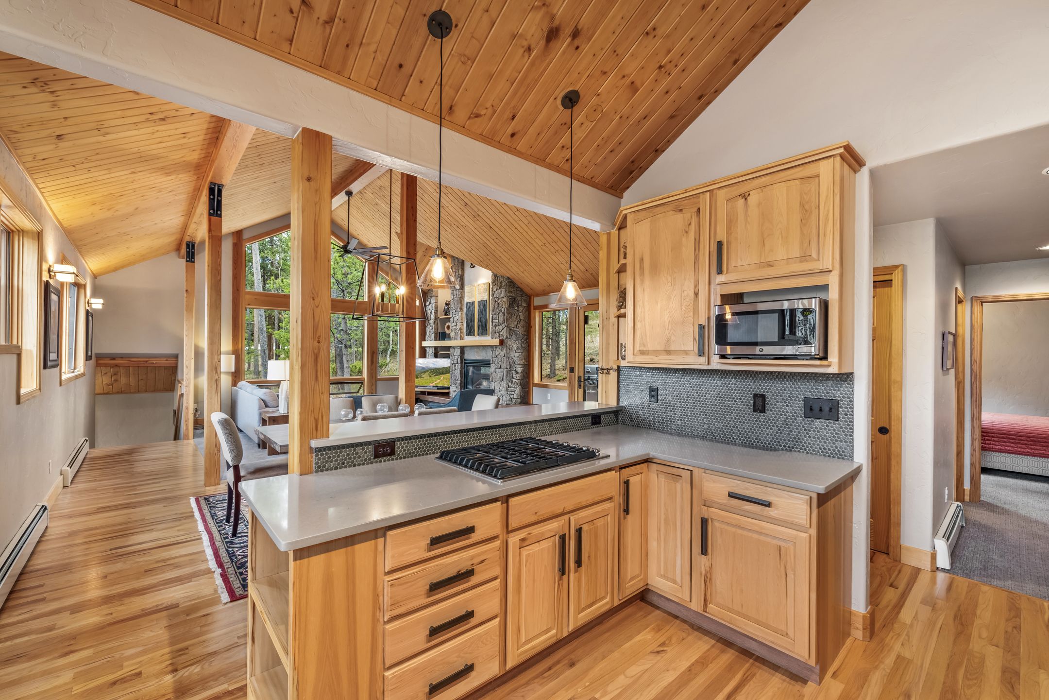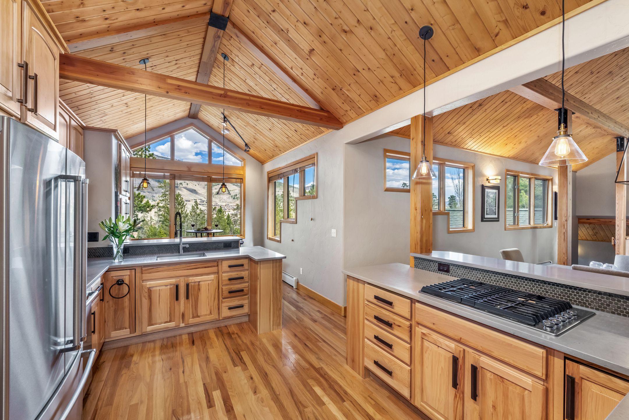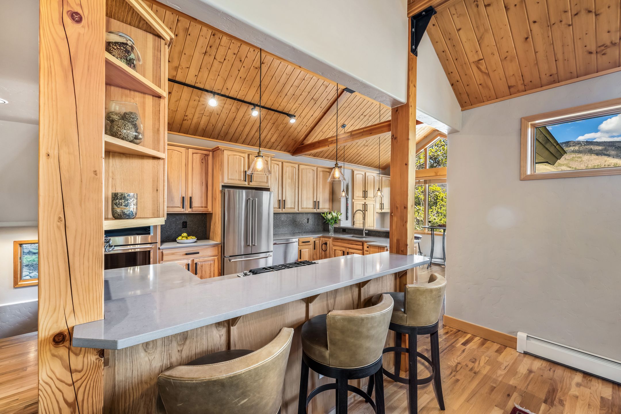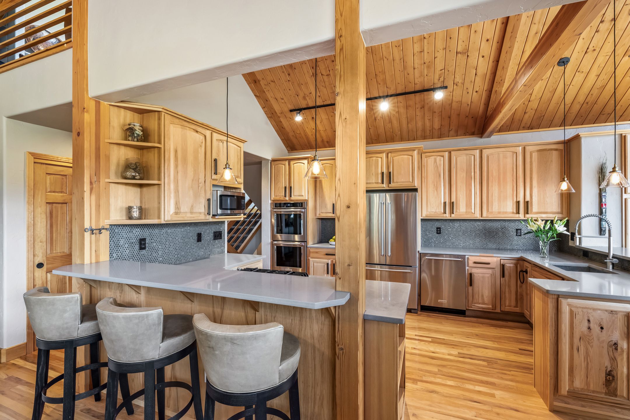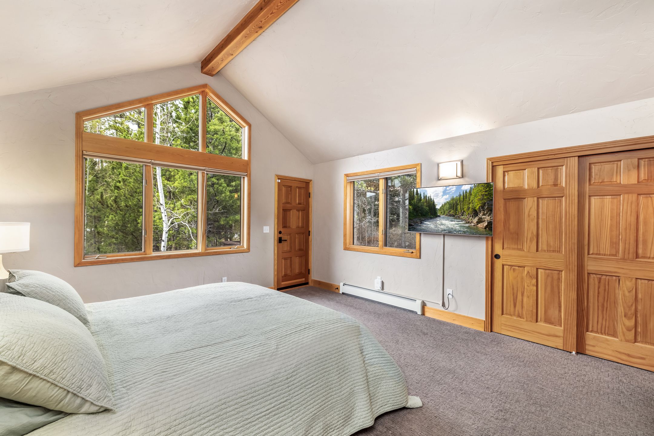 Beautifully updated 4-bedroom Eagles Nest home situated on a peaceful wooded lot with serene mountain views to the east. Relax and enjoy the private outdoor living spaces. Inside, the vaulted ceilings, floor-to-ceiling windows, exposed beams, stone fireplace, and strong natural light add to the allure of the open living area. The fireplace with a heated hearth creates a distinct focal point, designed for year-round use and comfort. The great room connects to the dining area, kitchen, and breakfast nook. Enjoy updated finishes throughout, including quartz countertops. Use the loft, currently a dedicated office, as your office, extra living space, or workout area. The four bedrooms include two gracious primary suites. The garage walks into a well-appointed room for storing outdoor equipment. Newer water heater, boiler, and exterior paint. This home is located within the Raven Golf Club community at Eagles Nest, with easy access to not only golf, but also hiking trails. Silverthorne amenities are nearby, as well as the five world-class ski areas. Only 2.5 miles to the Dillon Reservoir and I-70.