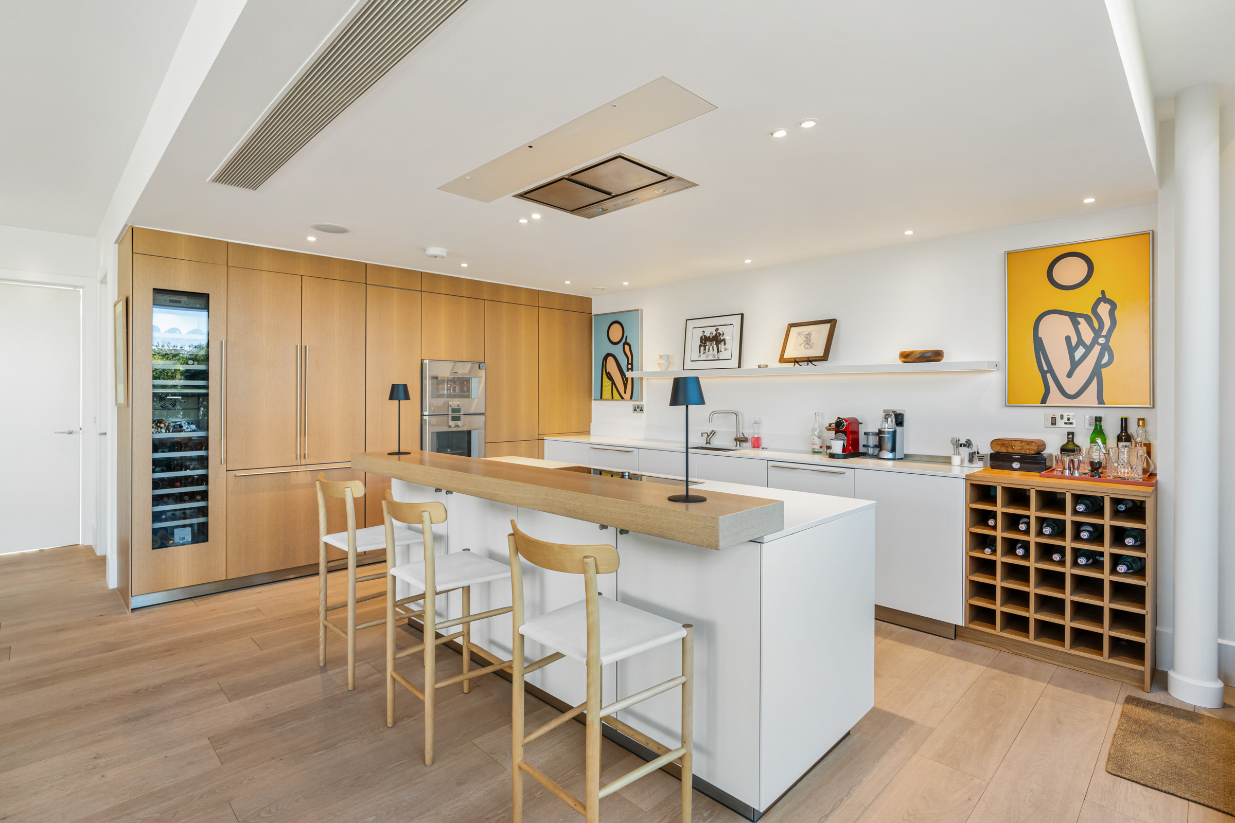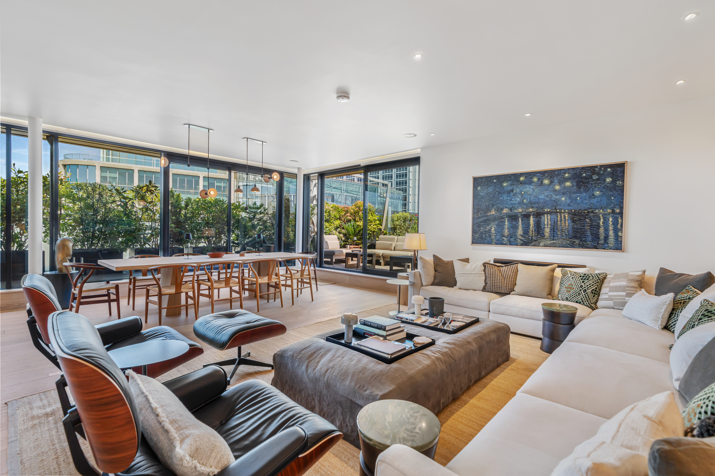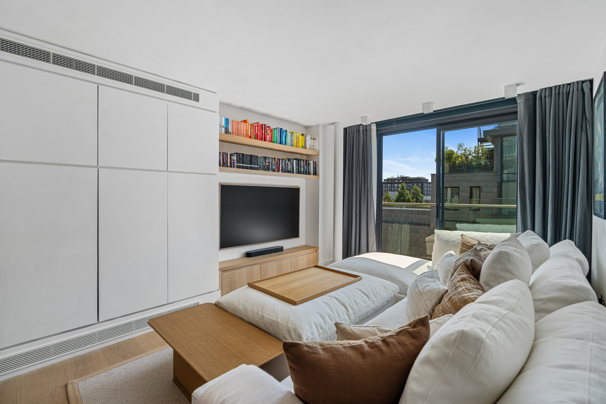 Beautifully designed, the accommodation comprises three generous bedroom suites, each with its own en-suite bathroom. The principal bedroom features a luxurious en-suite and bespoke fittings, while the second bedroom opens directly onto a private terrace. The third bedroom, currently arranged as a gym, has its own steam room. There is also a stylish guest cloakroom and a well-equipped utility room.