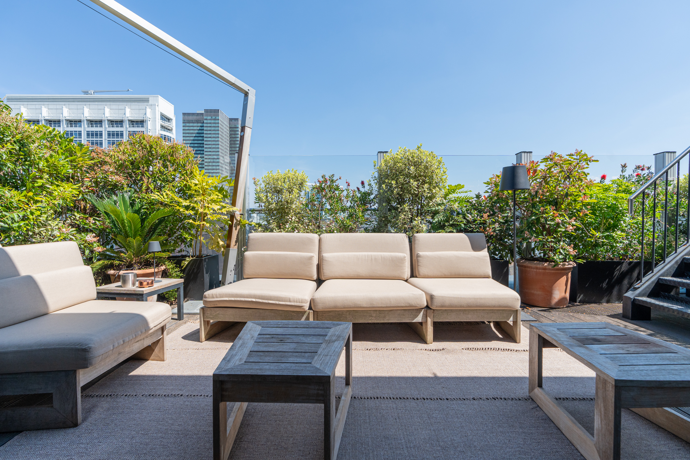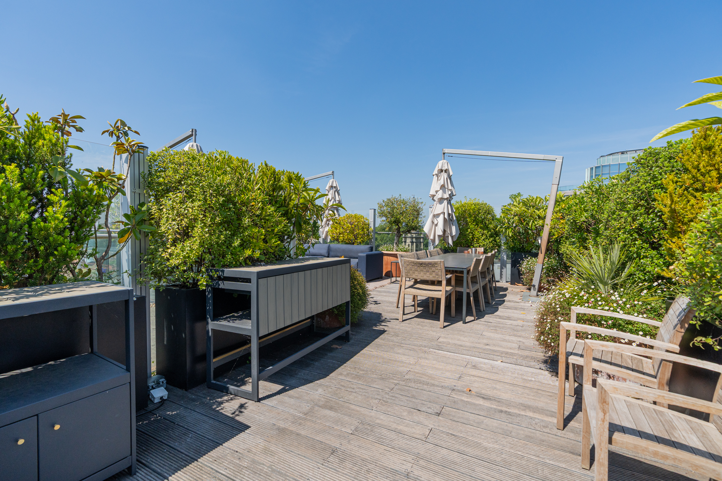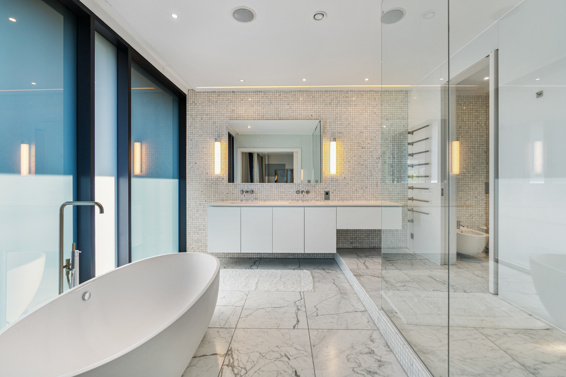 Beautifully designed, the accommodation comprises three generous bedroom suites, each with its own en-suite bathroom. The principal bedroom features a luxurious en-suite and bespoke fittings, while the second bedroom opens directly onto a private terrace. The third bedroom, currently arranged as a gym, has its own steam room. There is also a stylish guest cloakroom and a well-equipped utility room.