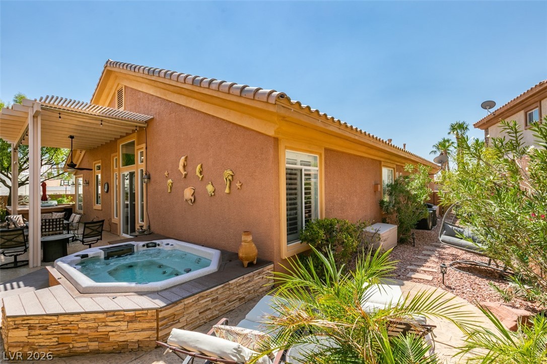 Turnkey single story in guard gated Granada Hills with premium upgrades and a resort style backyard. This home has vaulted ceilings, interior shutters, dual-tone paint, added LED lighting and two fireplaces. The chef's kitchen features double LG oven, Samsung gas cooktop, granite counters, under-cabinet lighting and an oversized pantry. Both bathrooms are updated with premium quartz and tiled quartz showers. The private backyard features a 10 person Creative Distinction swim spa with decking, stamped concrete, full outdoor kitchen with natural gas grill, bar and mini fridge. Recent updates: new appliances (2021), new Goodman A/C & furnaces (2022), water softener, fresh paint, hardwired outdoor lighting and finished 3-car garage with cabinets & epoxy flooring. Pristine, meticulously maintained move-in ready stunner in prime location!