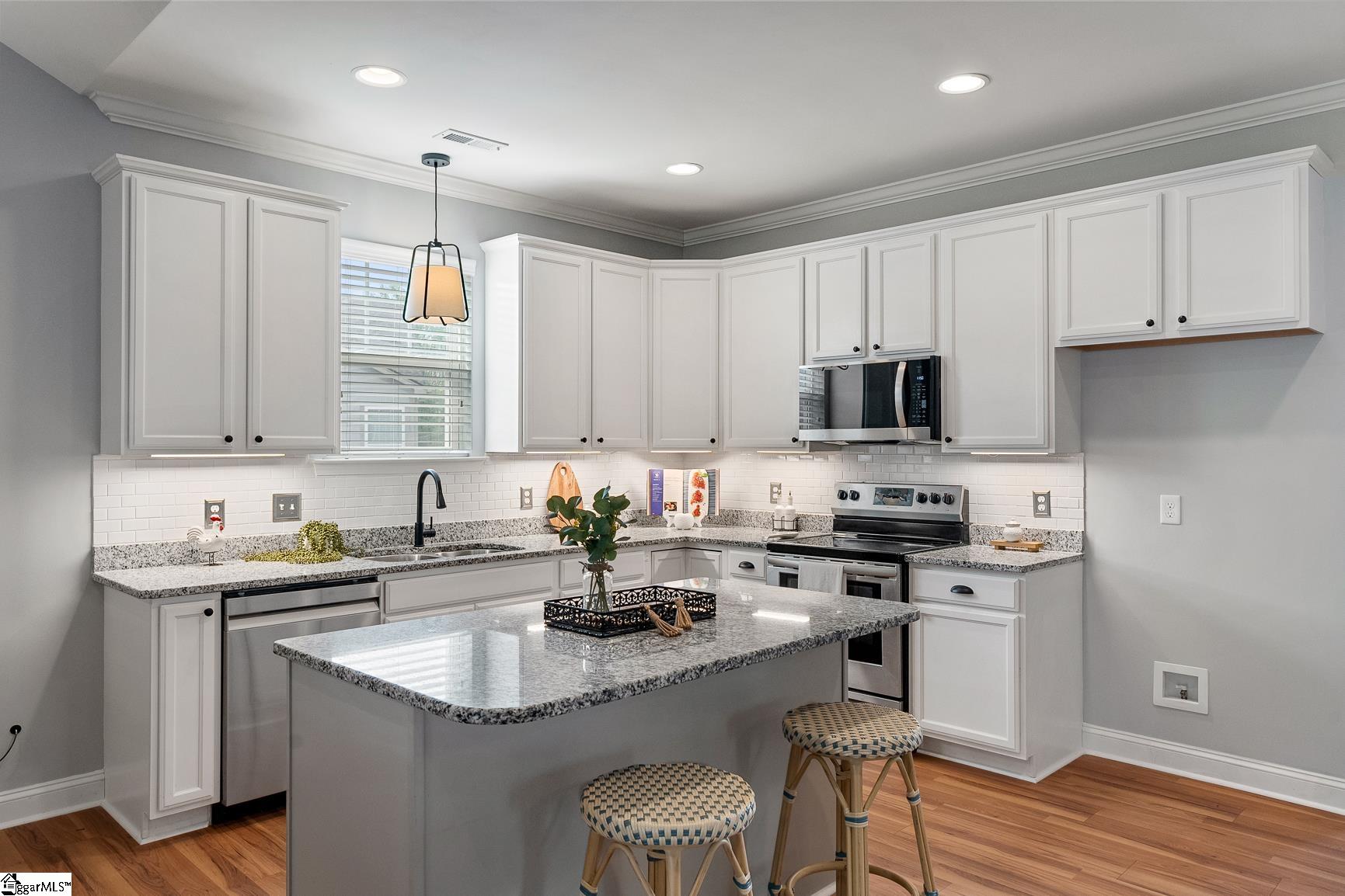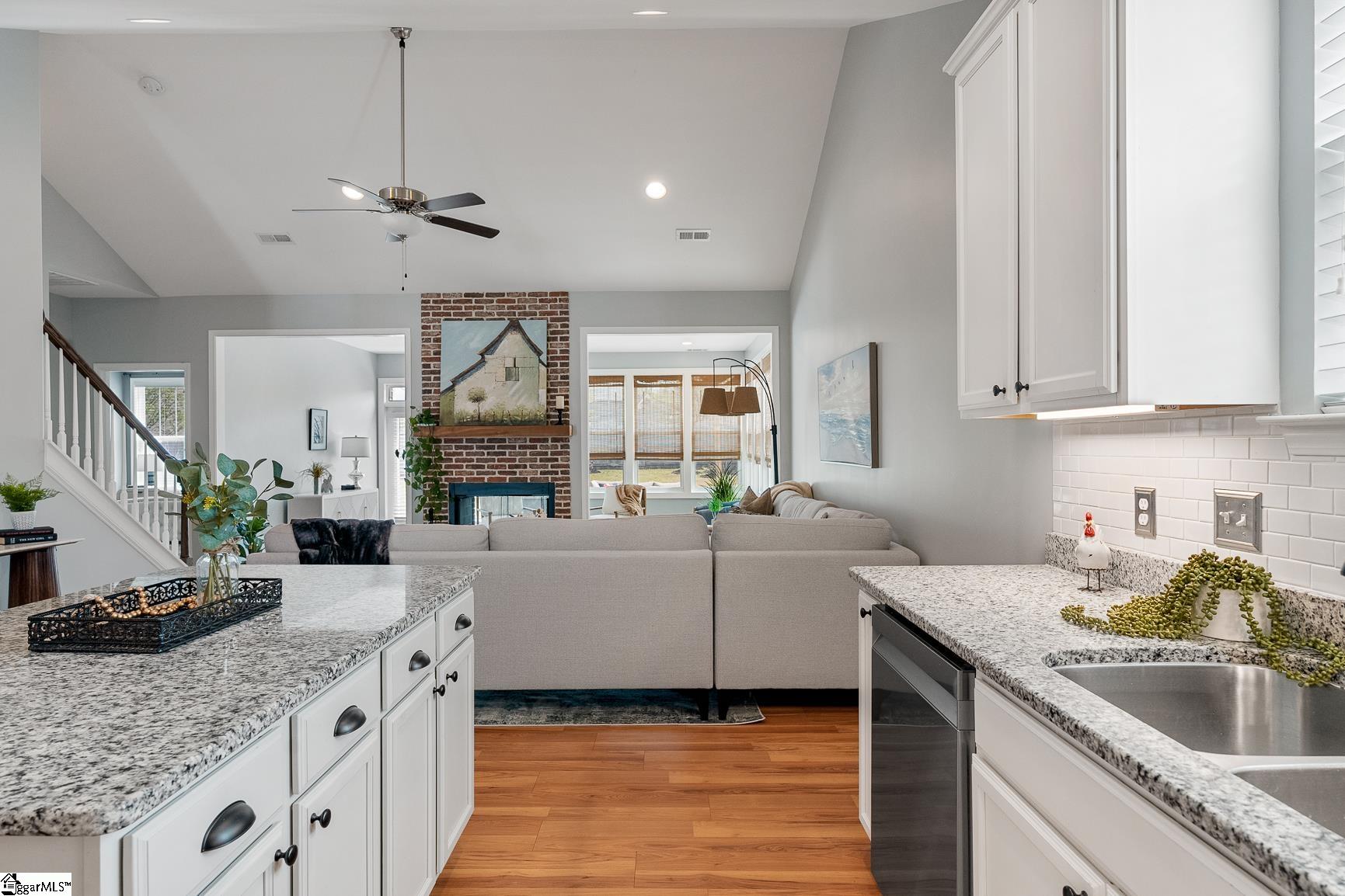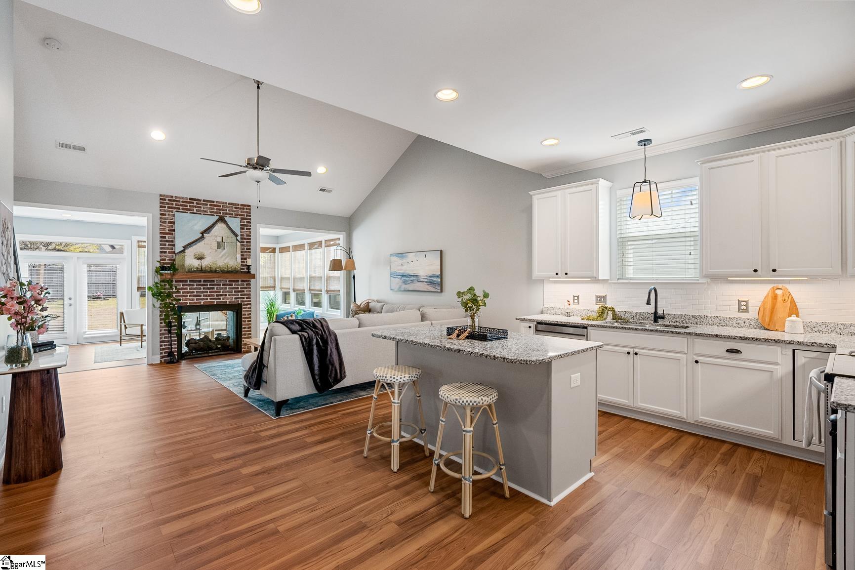 Welcome to 1104 Draycott Road,where comfort, thoughtful updates, and everyday livability come together in one of Simpsonville's most convenient locations. This beautifully updated 4-bedroom, 3-bath home offers a highly desirable layout with three bedrooms on the main level and a private fourth bedroom with full bath upstairs, perfect for guests, a home office, or a quiet retreat. The heart of the home has been transformed to create a bright, open feel, with the living room seamlessly connected to the sunroom. A stunning double-sided fireplace, enhanced with a brick surround and new insert/logs, serves as a warm and inviting focal point between the two spaces. Recent updates throughout the home include new LVP flooring on the main level, fresh tile in all three bathrooms, a new kitchen backsplash, added under-cabinet lighting with timer, and recessed lighting in the living room and kitchen. The kitchen has also been elevated with newly installed cabinet hardware, adding a clean and modern touch. Step outside to enjoy a beautiful patio, perfect for entertaining or relaxing in your own backyard retreat. Located just 5 minutes from downtown Simpsonville, you'll love the convenience of nearby shopping, dining, and everyday amenities. As an added bonus, Frontier fiber internet is installed, with free activation and two months of service included for the buyer. With its thoughtful upgrades, flexible layout, this home is ready to be enjoyed.