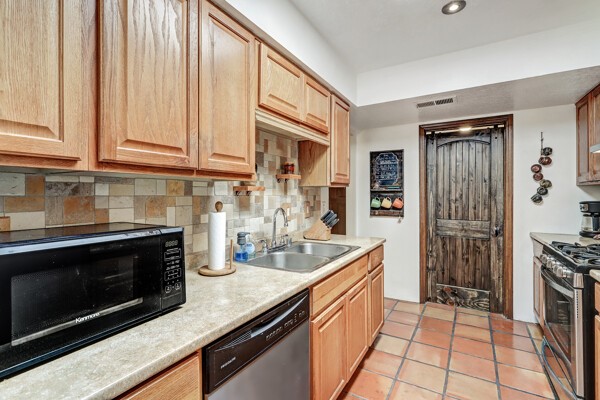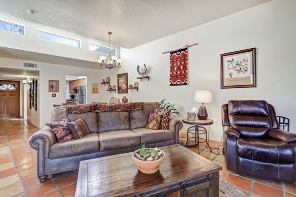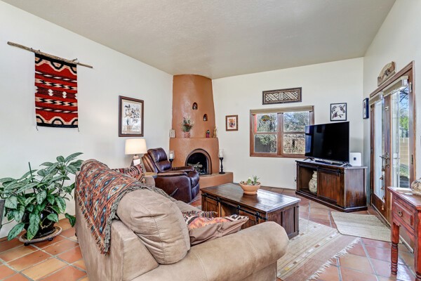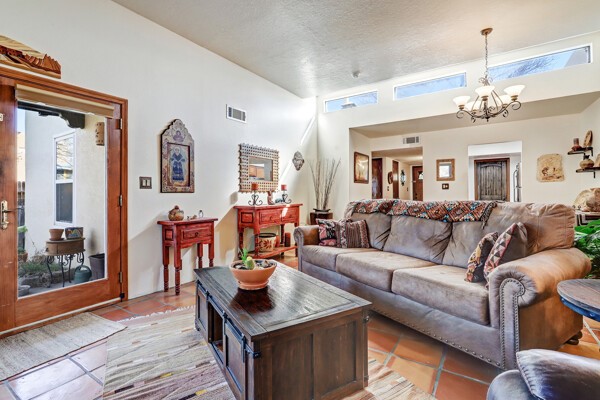 Truly charming townhouse walking to the Rodeo grounds, Genoveva Chavez Community Center and close to many shopping locations. This home boasts an open living/dining area with tons of natural light. Passive solar design, saltillo floors throughout and wood burning kiva fireplace complete the coziness. Landscaped fenced backyard and front courtyard are not on drip irrigation. When the temps get warm, the a/c will keep you cool!
