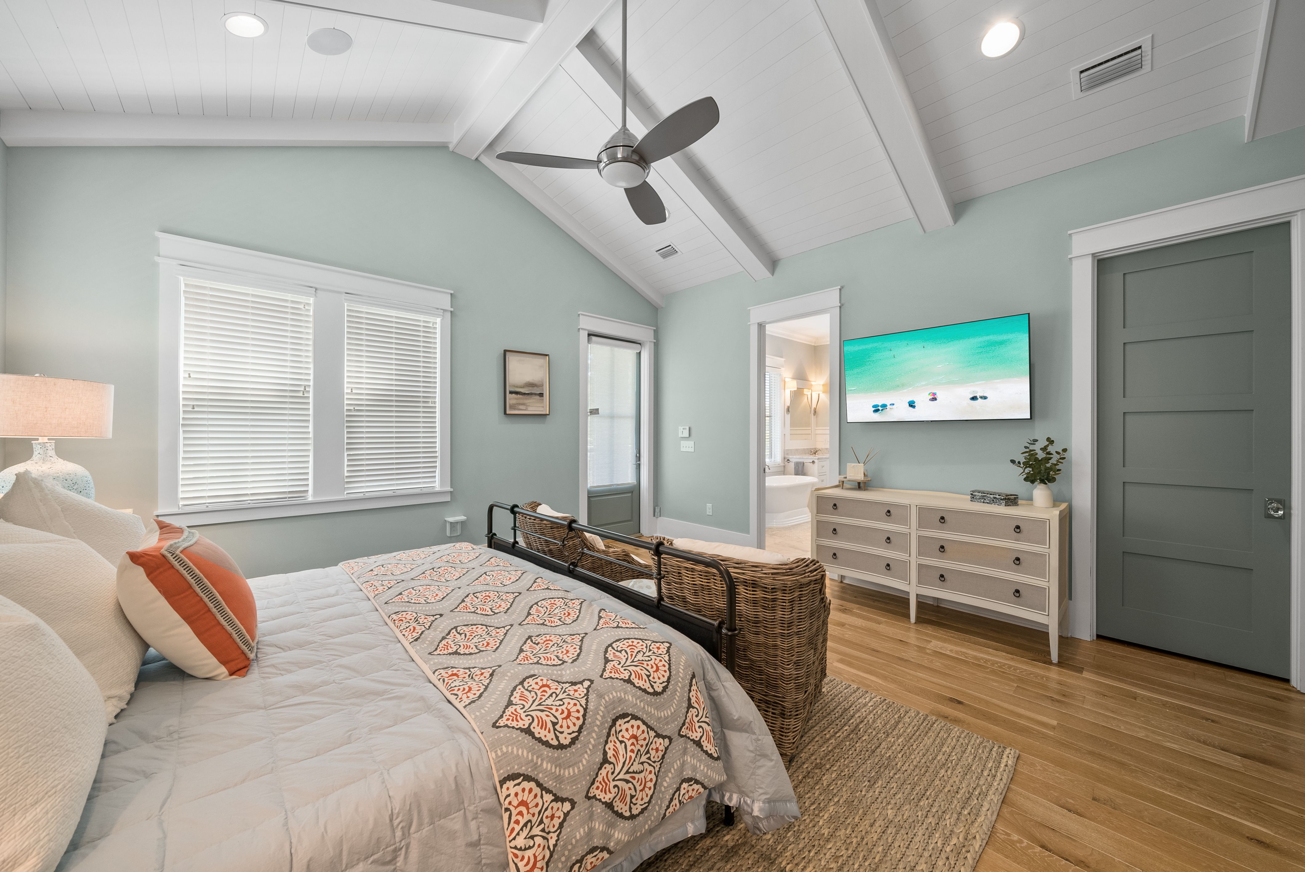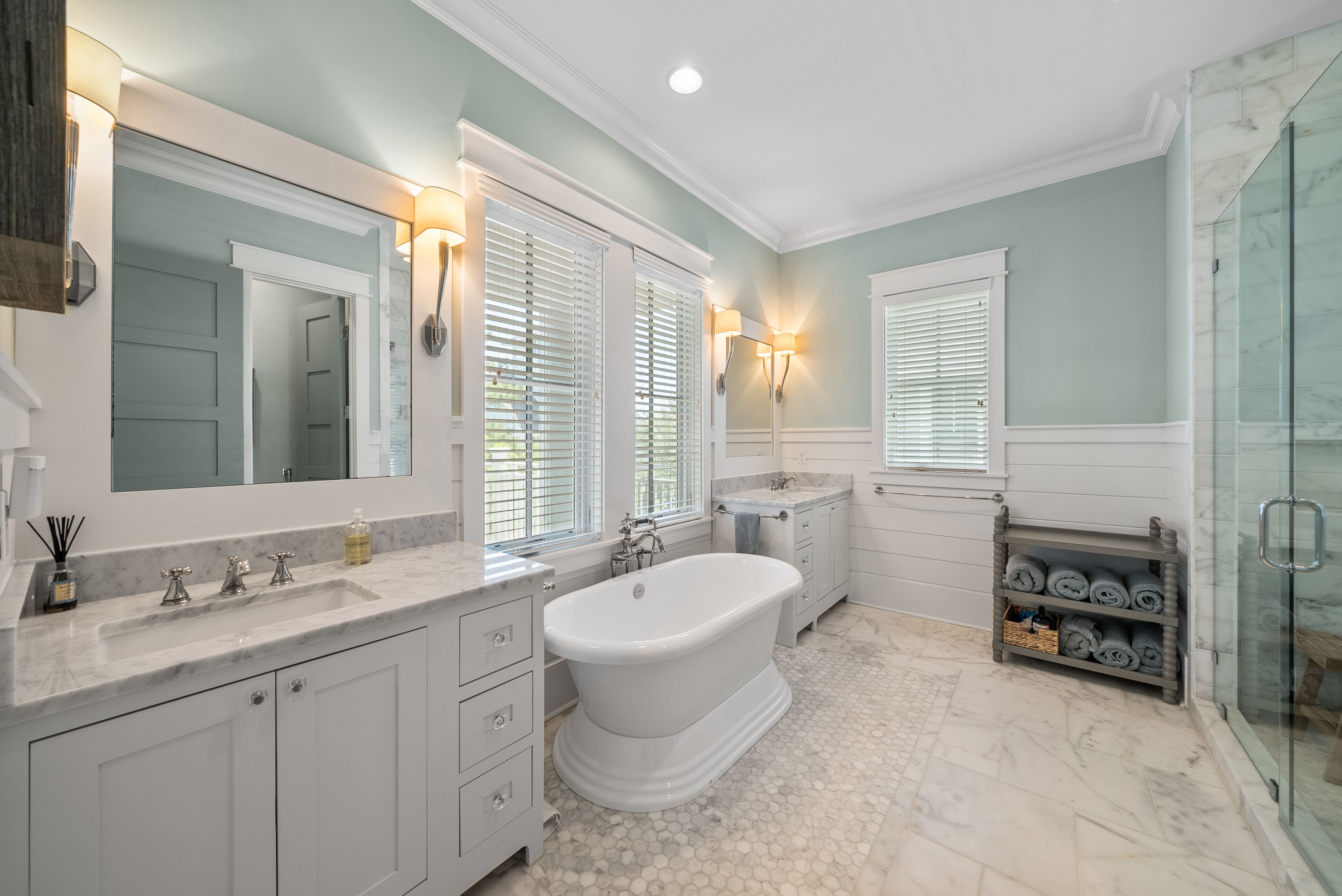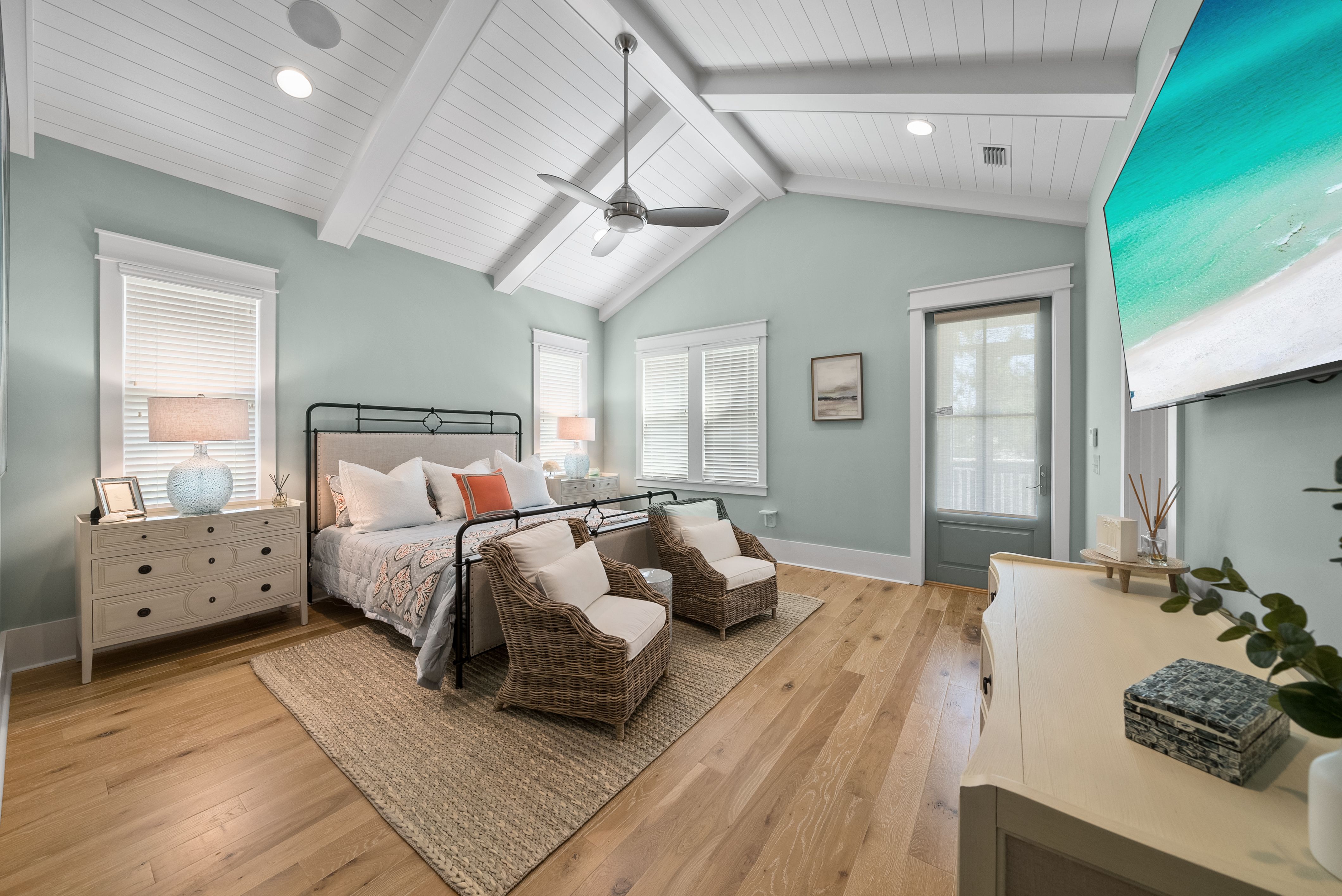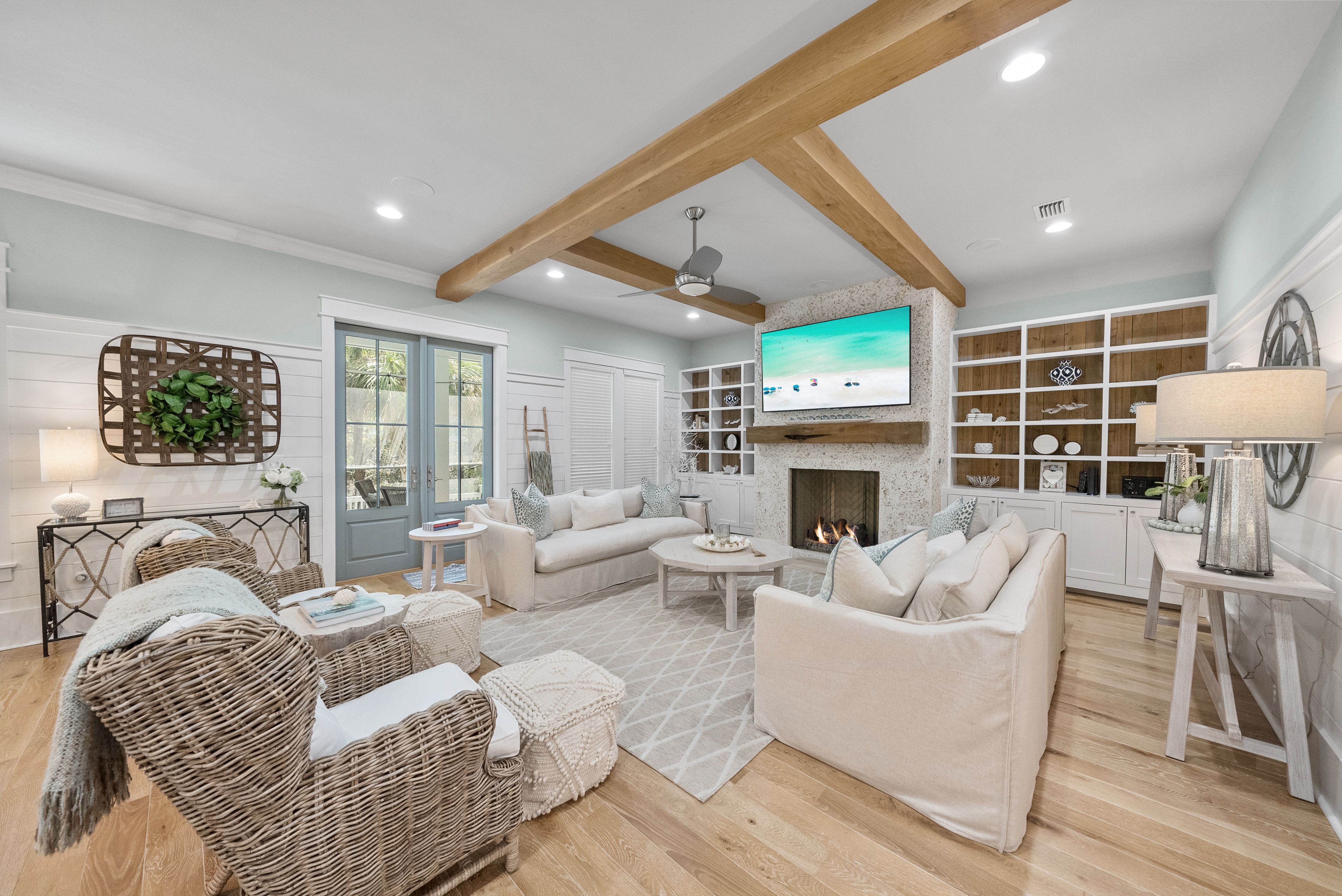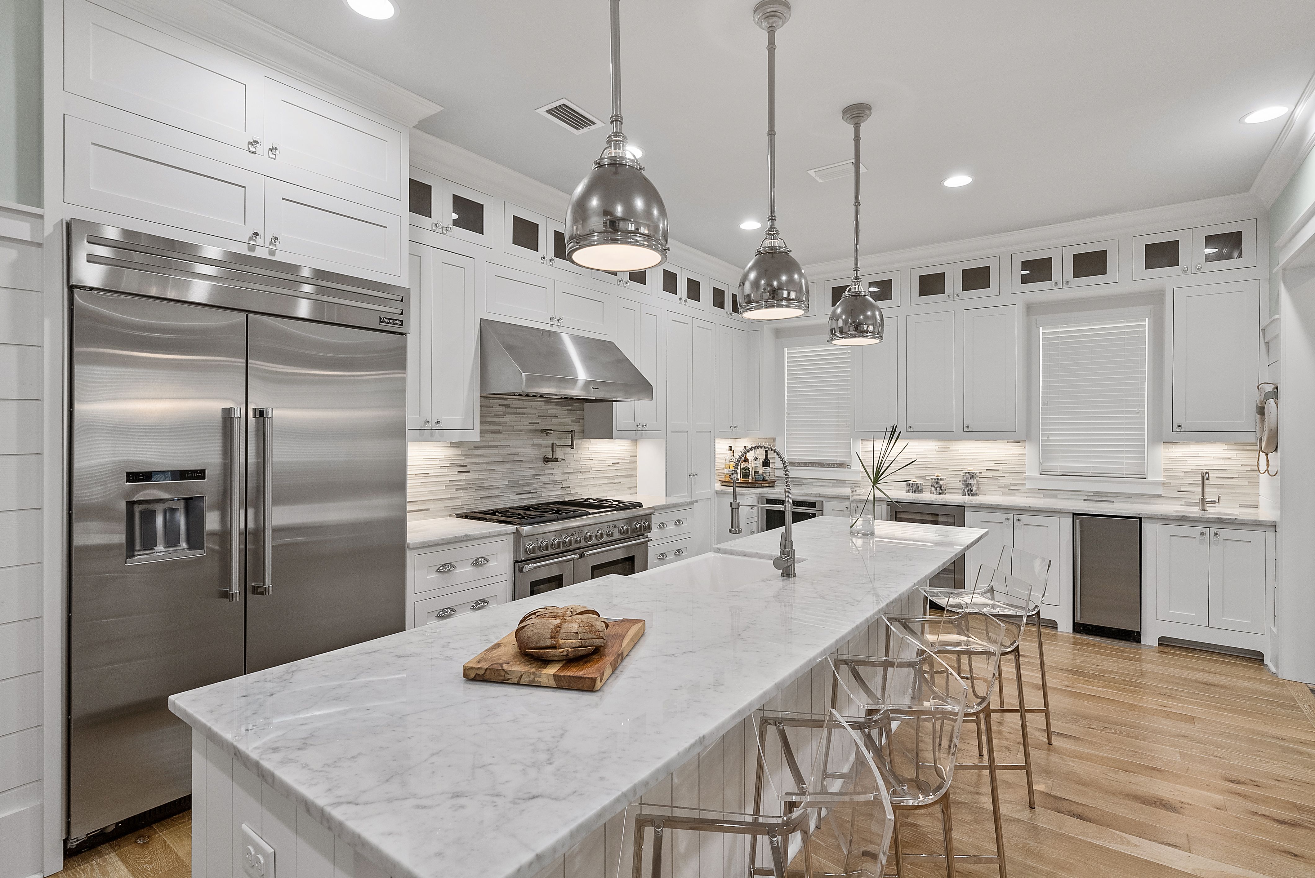 Live every day like you’re on vacation in this stunning five-bedroom, seven-bath beach cottage with a private carriage house and two-car garage, nestled in sought-after WaterSound Bridges. Thoughtfully designed with timeless coastal charm and high-end finishes, this residence offers spacious indoor and outdoor living areas, perfect for relaxation and entertaining. The gourmet kitchen is a chef’s dream, featuring Thermador appliances, gleaming Carrara marble countertops, custom cabinetry, a built-in wine fridge, and an ice maker. A hidden walk-in pantry offers additional storage, while the oversized marble-topped island provides ample space for meal prep and casual dining. The open-concept design flows seamlessly into the inviting living room, where exposed wood beams, a stone fireplace with a reclaimed wood mantel, and built-in shelving create a warm yet sophisticated atmosphere. Designed for seamless indoor-outdoor living, this home features multiple porches at the front and back, ideal for enjoying morning coffee or evening sunsets. A screened porch with an outdoor kitchen, built-in grill, and cozy sitting area extends the entertaining space, while the private splash pool with a tranquil waterfall feature offers the ultimate place to unwind. After a day on the beach, rinse off in the convenient outdoor shower before retreating inside. The primary suite is a luxurious haven, complete with vaulted ceilings, a private balcony, and a spa-like en suite bath. The master bathroom features Carrara marble floors, a freestanding soaking tub, dual vanities, and a glass-enclosed walk-in shower with intricate tilework. Each of the five bedrooms is beautifully appointed, with ensuite baths, ample natural light, and refined coastal design elements. The private carriage house offers independent guest accommodations, featuring a full kitchen, living area, bedroom, and private balcony, making it perfect for visiting guests, extended family, or rental opportunities. This home is equipped with a whole-home Generac generator, ensuring reliability year-round. Located just minutes from the pristine white-sand beaches of 30A, where days can be spent surfing, sunbathing, or enjoying twilight bonfires, this home captures the essence of luxury coastal living. Whether you’re seeking a primary residence, vacation home, or investment property, this WaterSound Bridges retreat is an extraordinary opportunity to own a piece of 30A paradise.