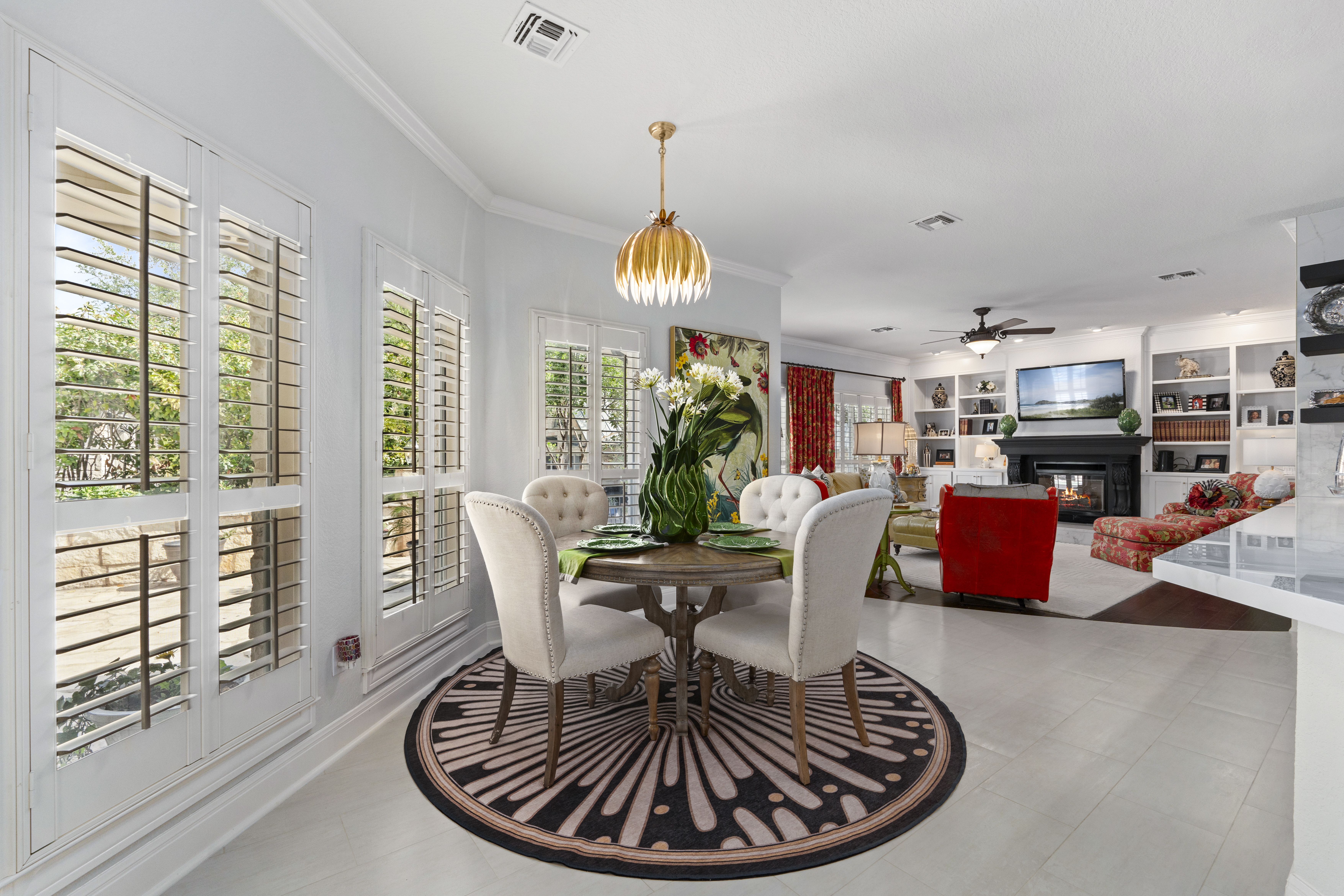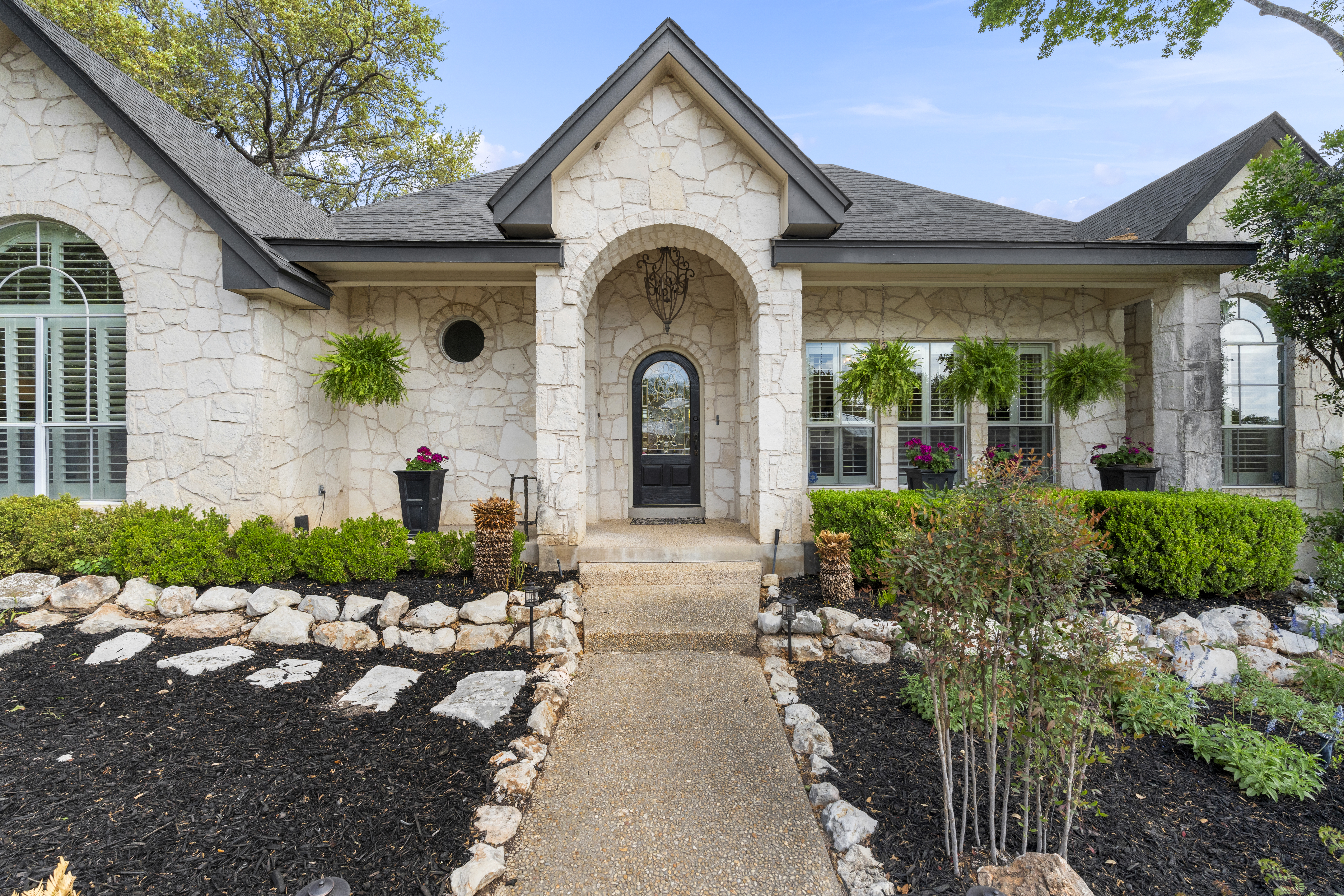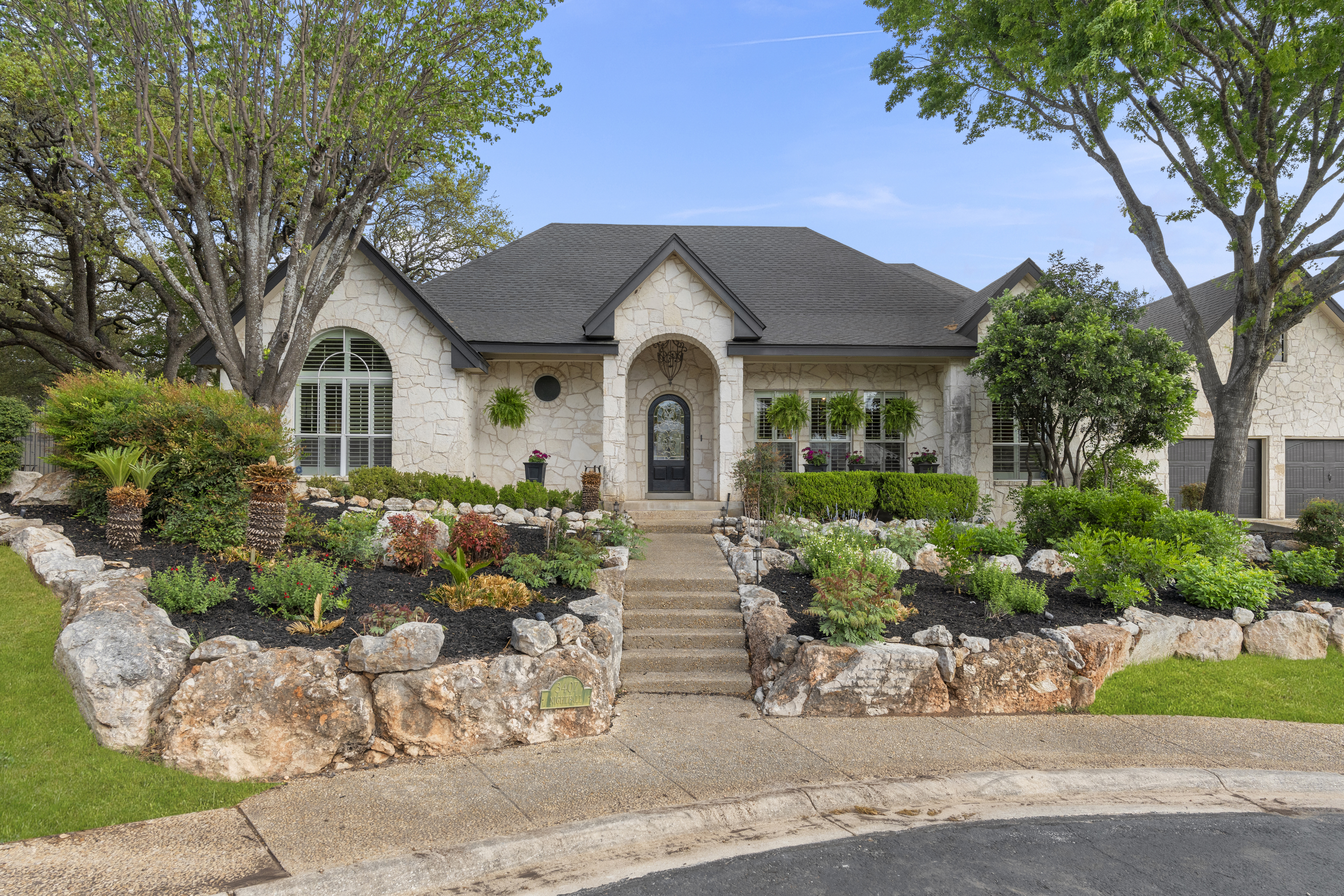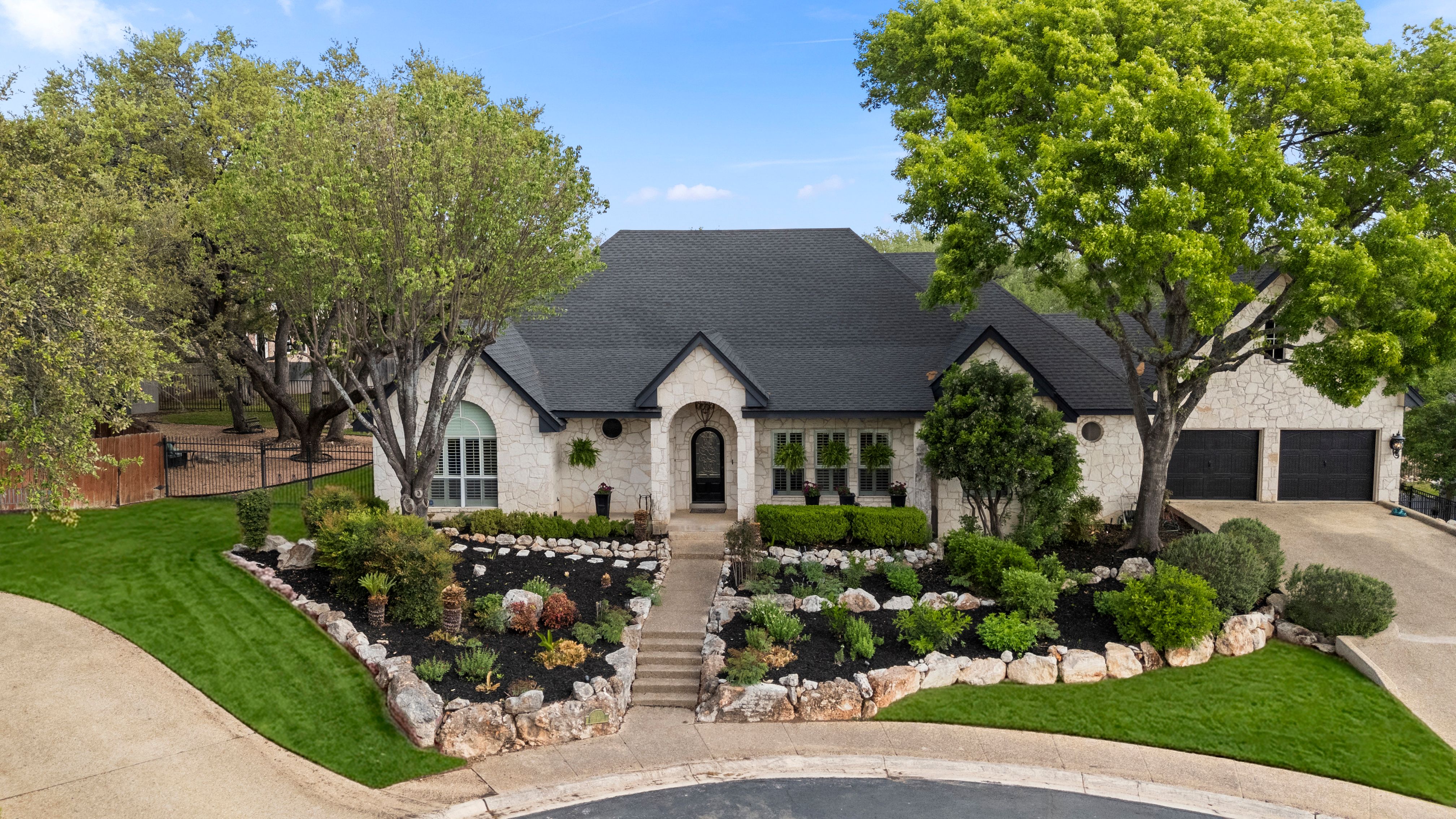 Set on an oversized cul-de-sac lot within the guard-gated Emerald Forest community, this thoughtfully updated single-story offers privacy, functionality, and elegance. A covered front porch provides a welcoming entry with majestic views. Inside, beautifully upgraded elements accent the home. The designer kitchen anchors the main living spaces and opens to breakfast area and family room, where high ceilings, natural light, and a fireplace create a warm, inviting atmosphere. Formal living and dining provide space for all. Plantation shutters are installed throughout. The primary suite offers outdoor access to backyard offering a quiet retreat. Secondary room connected to the primary and complete with a spacious closet-provides flexibility for a 3rd bedroom, private office, exercise, or flex room. A well-sized laundry room offers additional storage with extensive cabinetry, sink, and space for additional refrigeration. Outdoor living is equally considered, with a covered patio and an expansive flagstone terrace featuring a built-in fireplace, ideal for both entertaining and everyday enjoyment. Mature and lush landscaping and a fully fenced yard enhance the property and contributes to a quiet, established feel. The home is a true single story with no interior steps and subtle accessibility features in place. Emerald Forest is one of North San Antonio's most established gated communities, with wonderful amenities such as pool, tennis, walking trails, all with guarded access and entry from both Bulverde Road and Loop 1604.