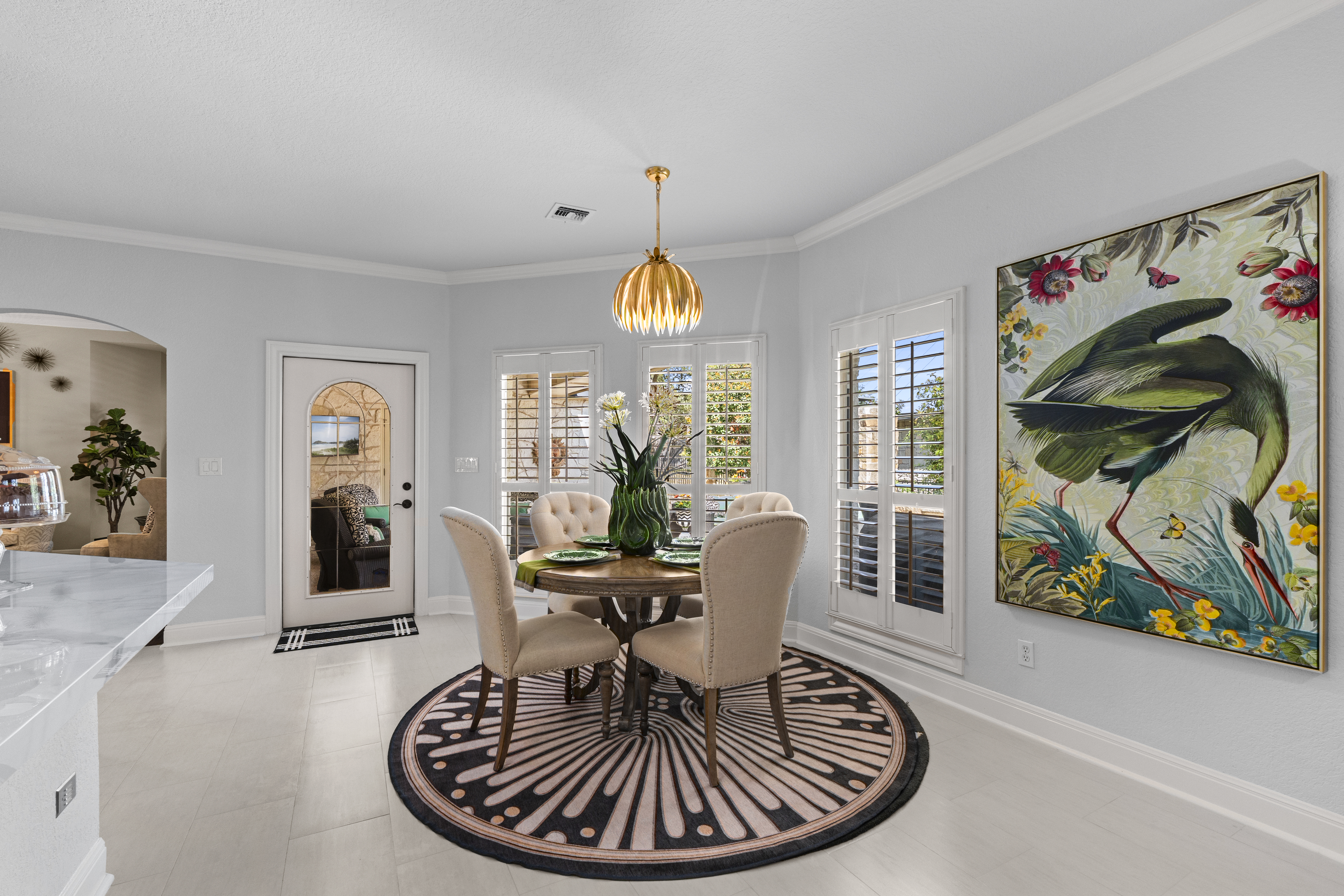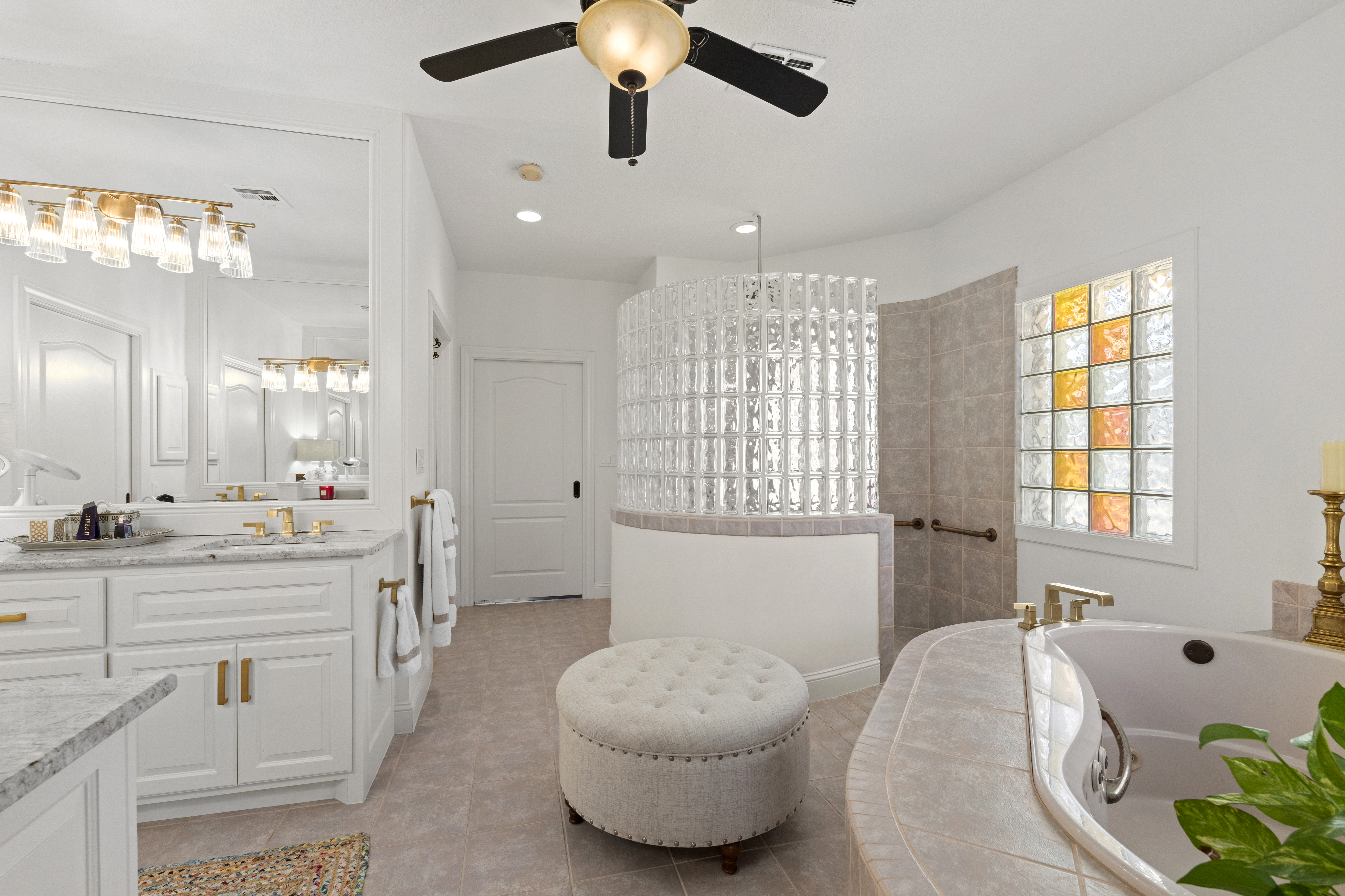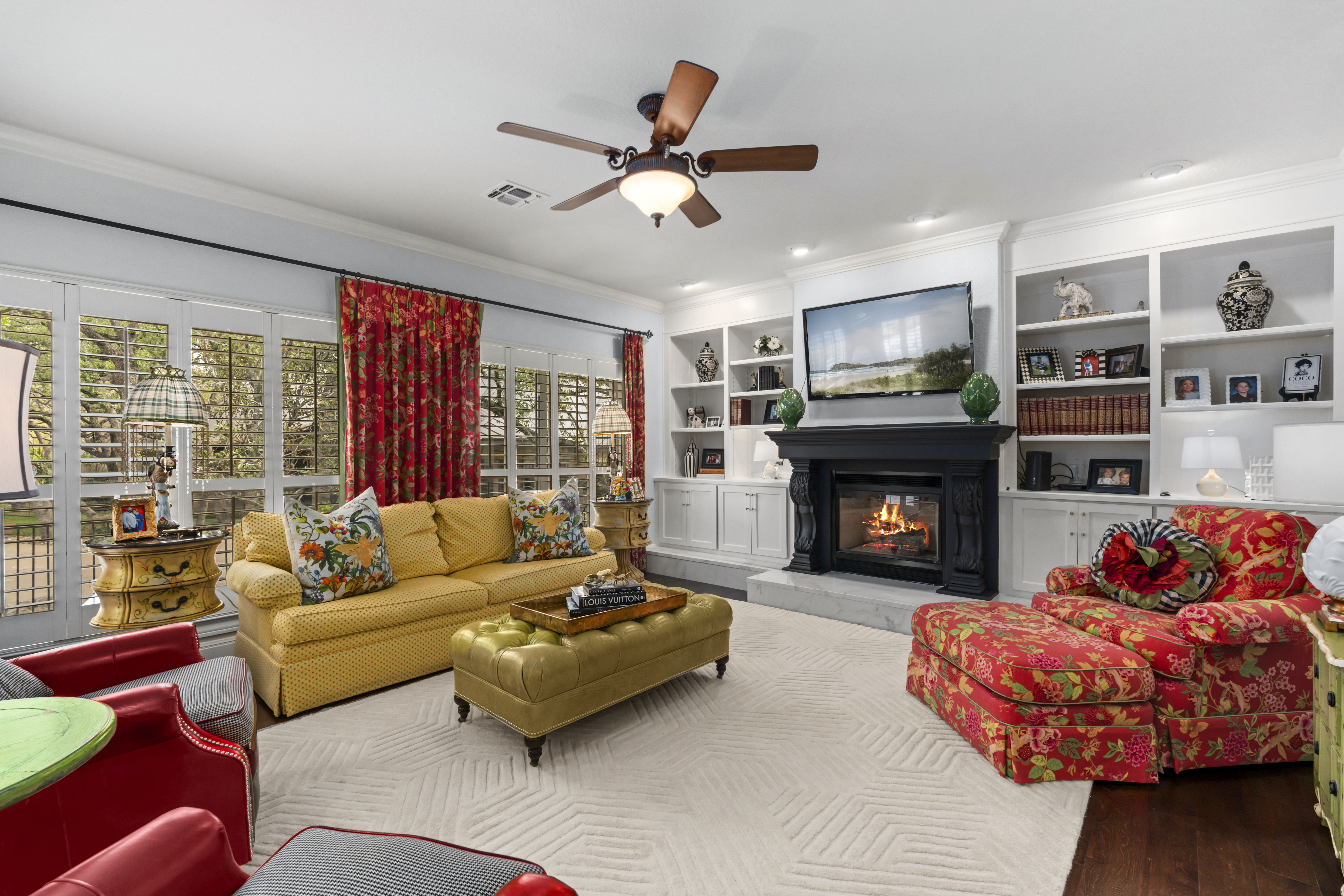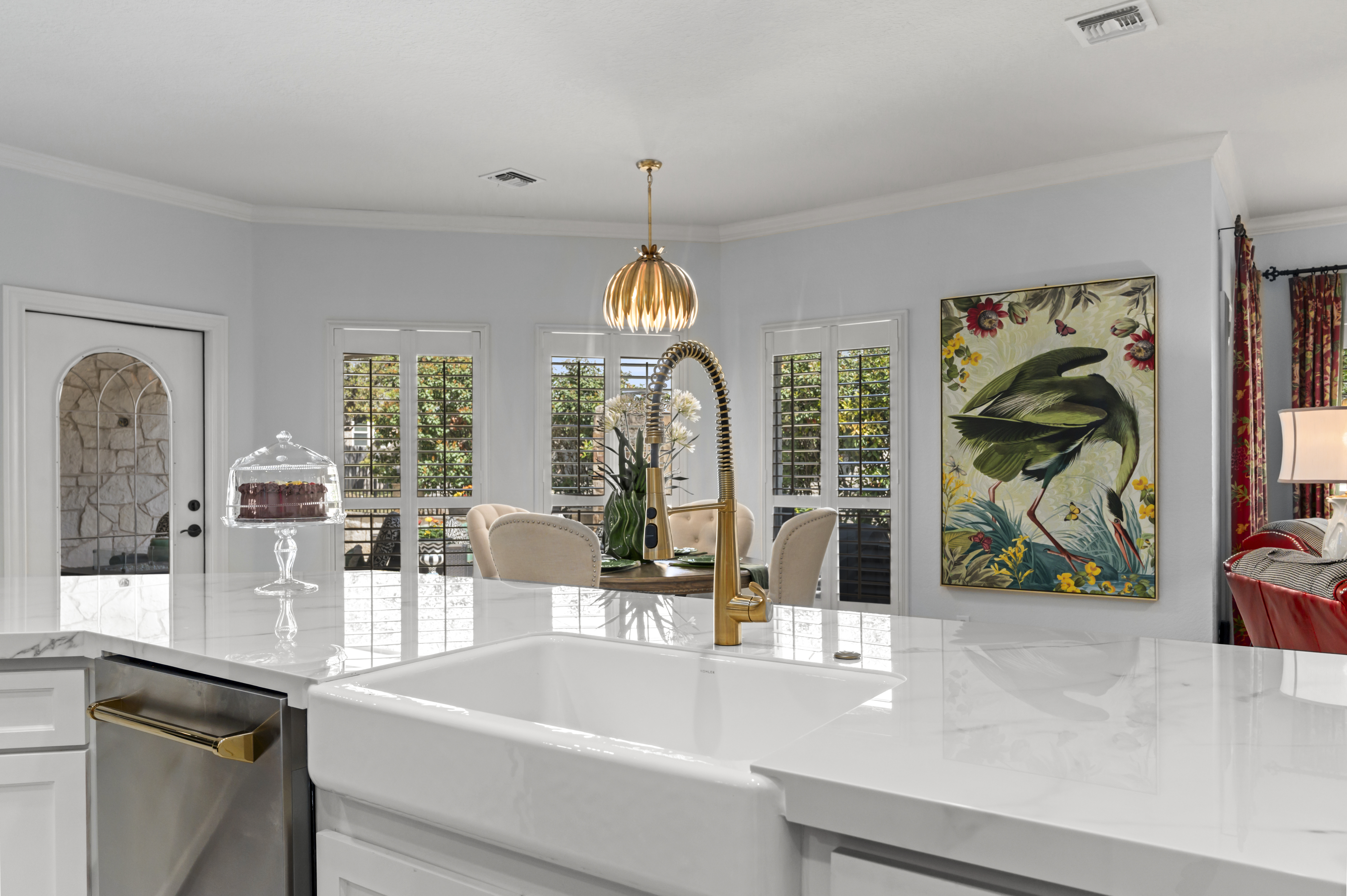 Set on an oversized cul-de-sac lot within the guard-gated Emerald Forest community, this thoughtfully updated single-story offers privacy, functionality, and elegance. A covered front porch provides a welcoming entry with majestic views. Inside, beautifully upgraded elements accent the home. The designer kitchen anchors the main living spaces and opens to breakfast area and family room, where high ceilings, natural light, and a fireplace create a warm, inviting atmosphere. Formal living and dining provide space for all. Plantation shutters are installed throughout. The primary suite offers outdoor access to backyard offering a quiet retreat. Secondary room connected to the primary and complete with a spacious closet-provides flexibility for a 3rd bedroom, private office, exercise, or flex room. A well-sized laundry room offers additional storage with extensive cabinetry, sink, and space for additional refrigeration. Outdoor living is equally considered, with a covered patio and an expansive flagstone terrace featuring a built-in fireplace, ideal for both entertaining and everyday enjoyment. Mature and lush landscaping and a fully fenced yard enhance the property and contributes to a quiet, established feel. The home is a true single story with no interior steps and subtle accessibility features in place. Emerald Forest is one of North San Antonio's most established gated communities, with wonderful amenities such as pool, tennis, walking trails, all with guarded access and entry from both Bulverde Road and Loop 1604.