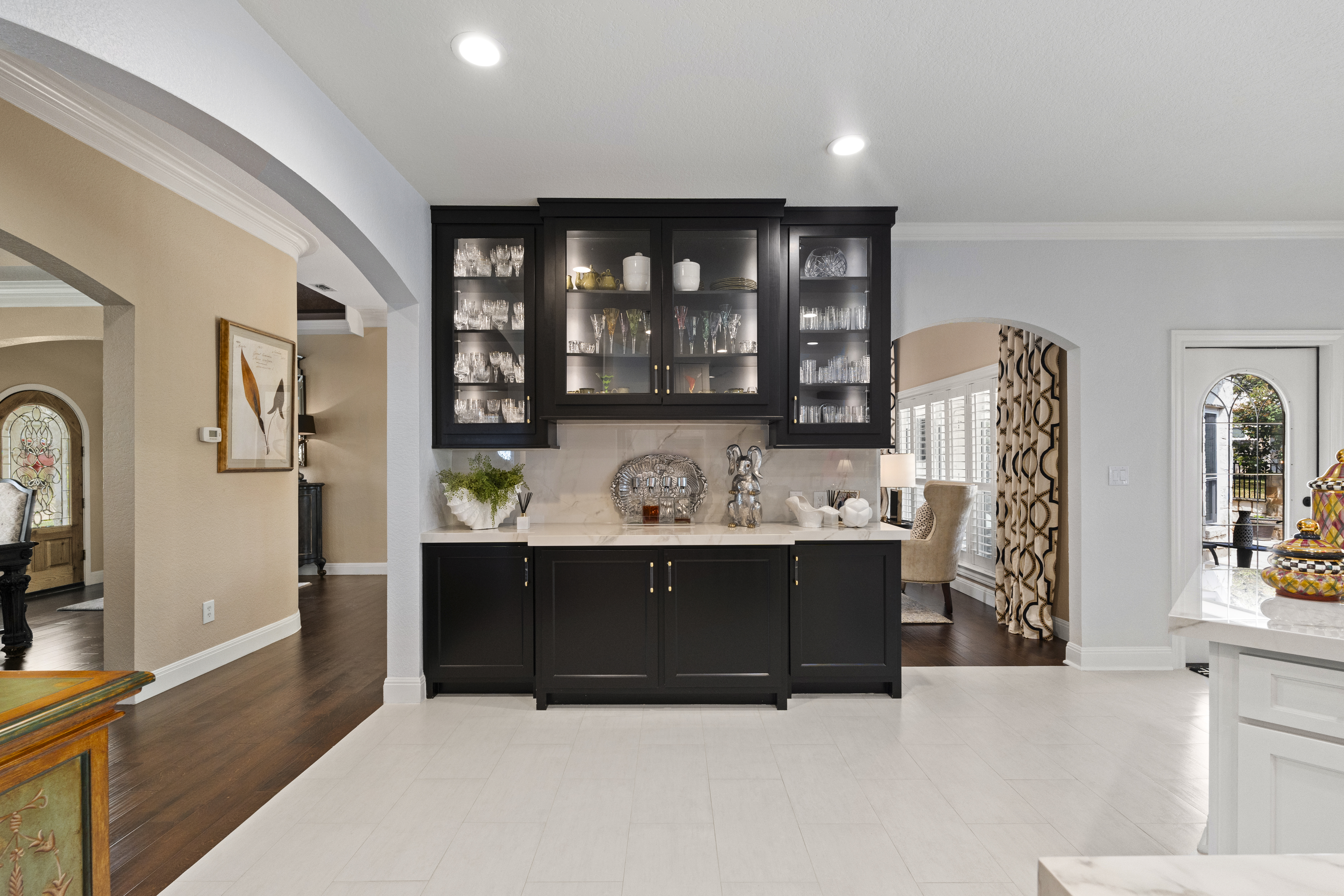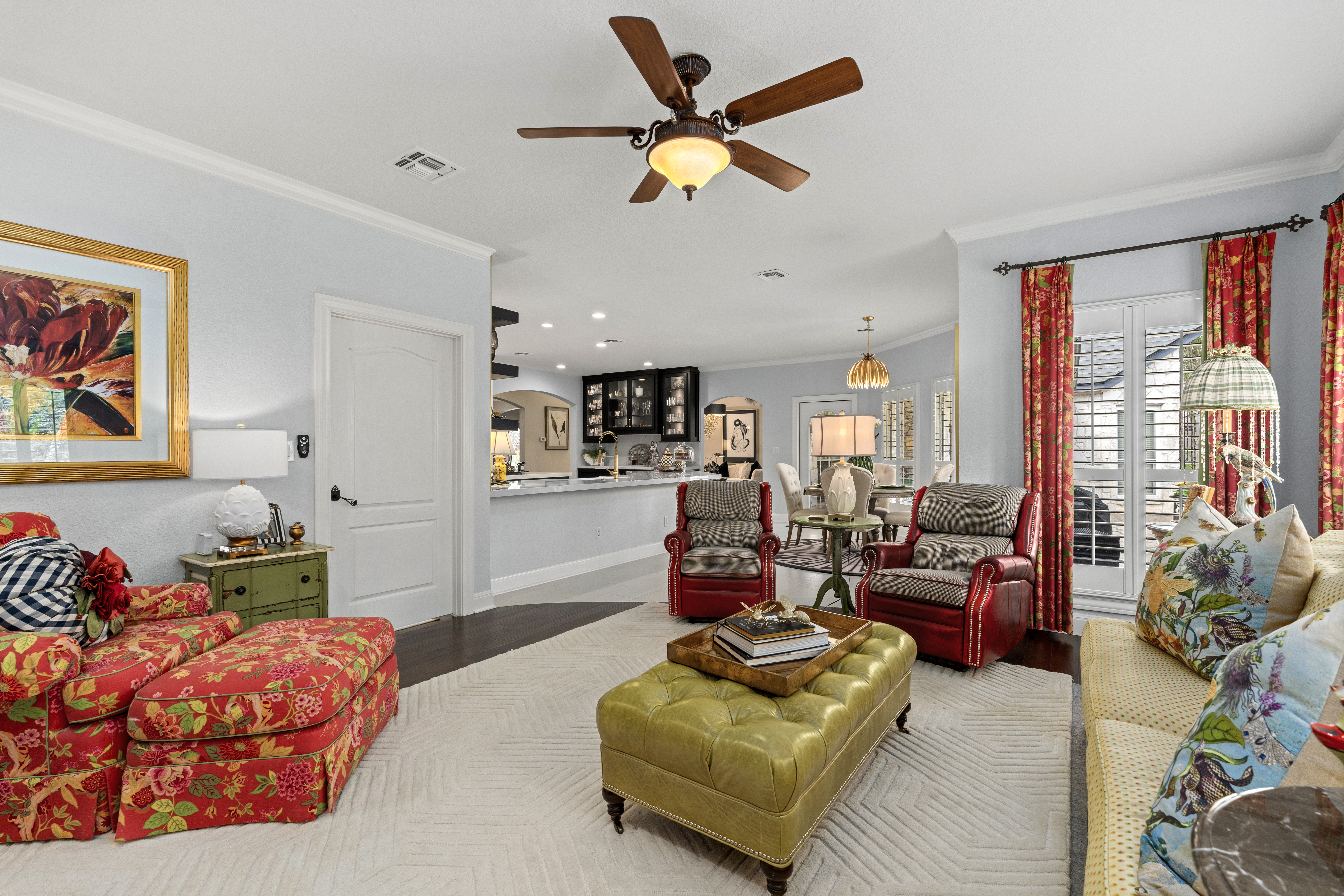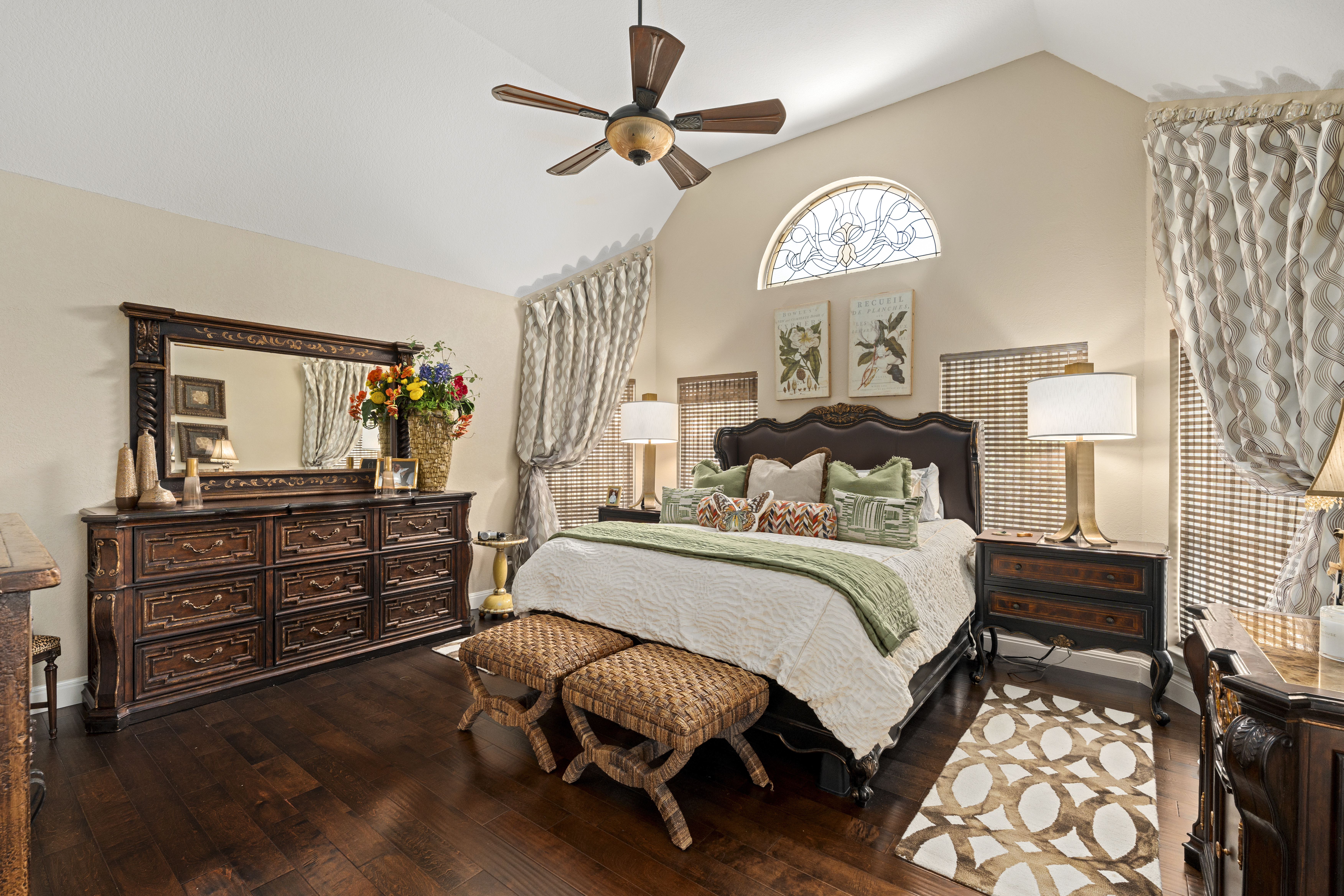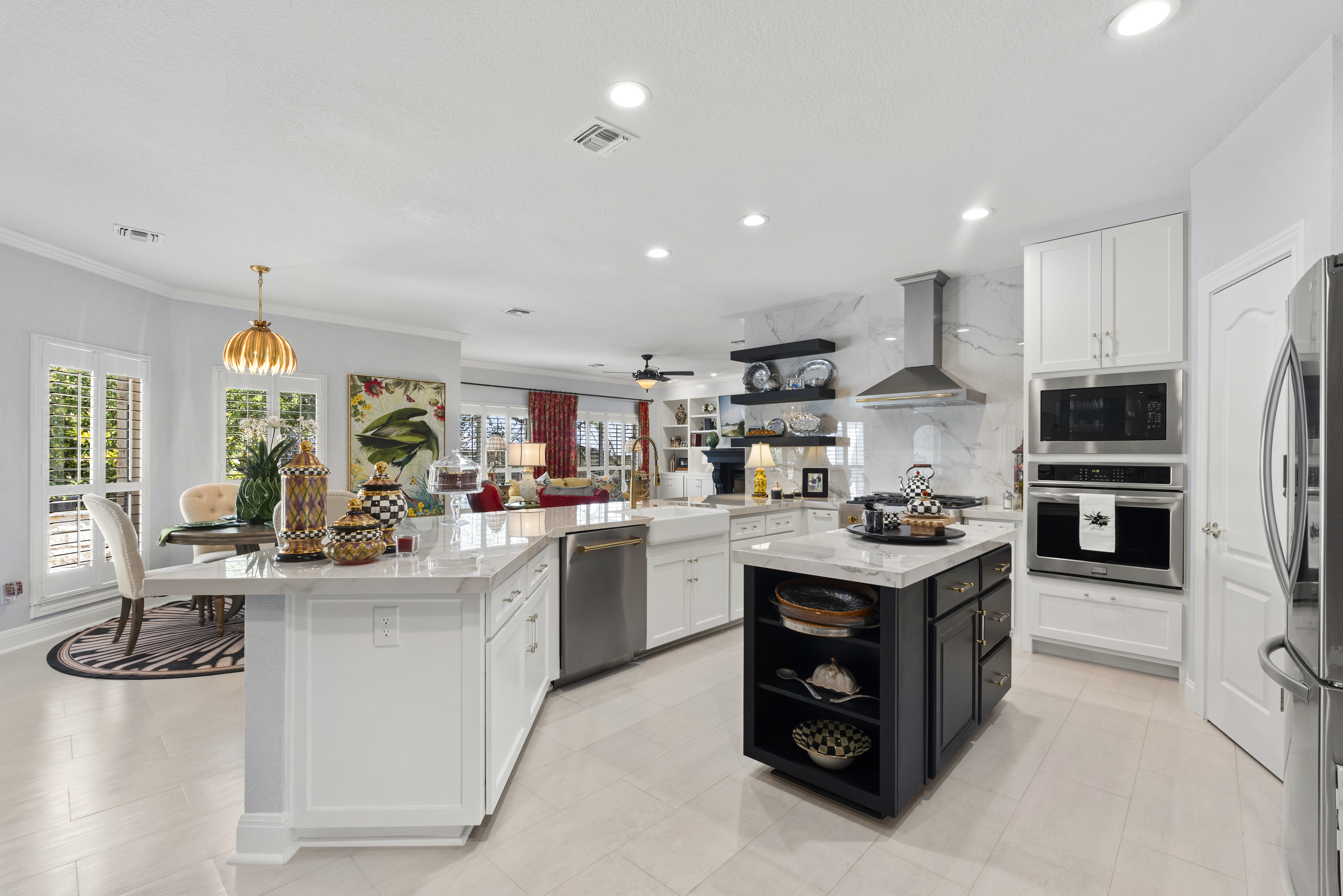 Set on an oversized cul-de-sac lot within the guard-gated Emerald Forest community, this thoughtfully updated single-story offers privacy, functionality, and elegance. A covered front porch provides a welcoming entry with majestic views. Inside, beautifully upgraded elements accent the home. The designer kitchen anchors the main living spaces and opens to breakfast area and family room, where high ceilings, natural light, and a fireplace create a warm, inviting atmosphere. Formal living and dining provide space for all. Plantation shutters are installed throughout. The primary suite offers outdoor access to backyard offering a quiet retreat. Secondary room connected to the primary and complete with a spacious closet-provides flexibility for a 3rd bedroom, private office, exercise, or flex room. A well-sized laundry room offers additional storage with extensive cabinetry, sink, and space for additional refrigeration. Outdoor living is equally considered, with a covered patio and an expansive flagstone terrace featuring a built-in fireplace, ideal for both entertaining and everyday enjoyment. Mature and lush landscaping and a fully fenced yard enhance the property and contributes to a quiet, established feel. The home is a true single story with no interior steps and subtle accessibility features in place. Emerald Forest is one of North San Antonio's most established gated communities, with wonderful amenities such as pool, tennis, walking trails, all with guarded access and entry from both Bulverde Road and Loop 1604.
