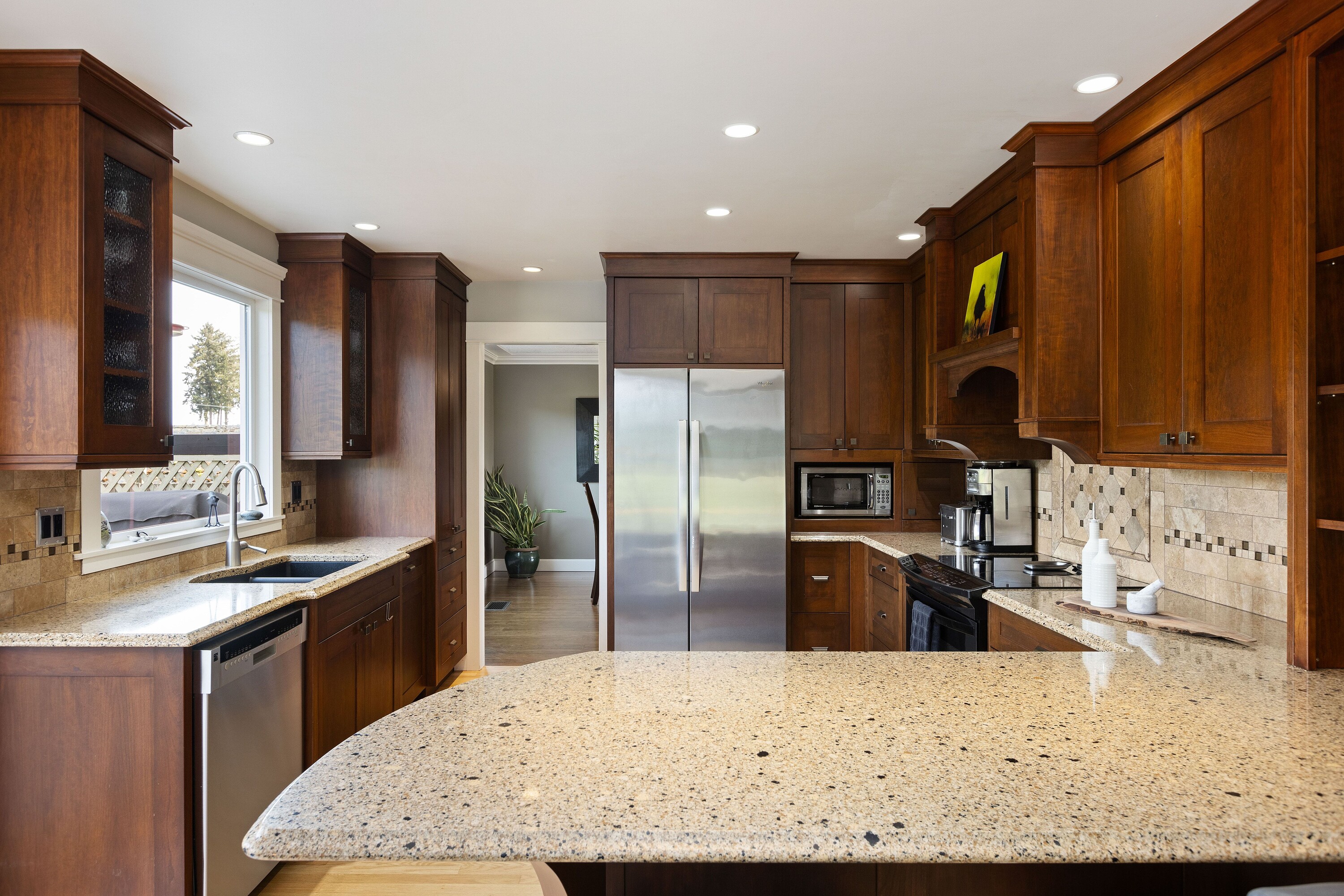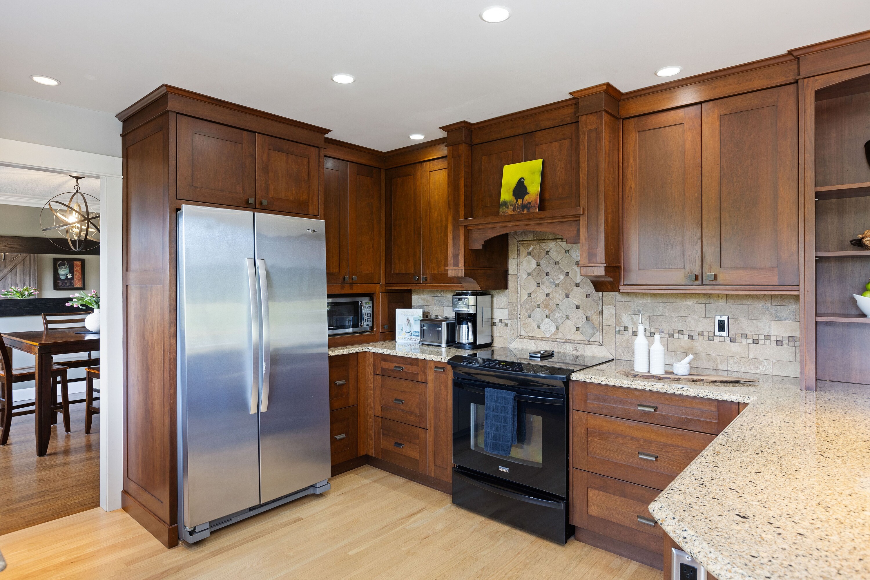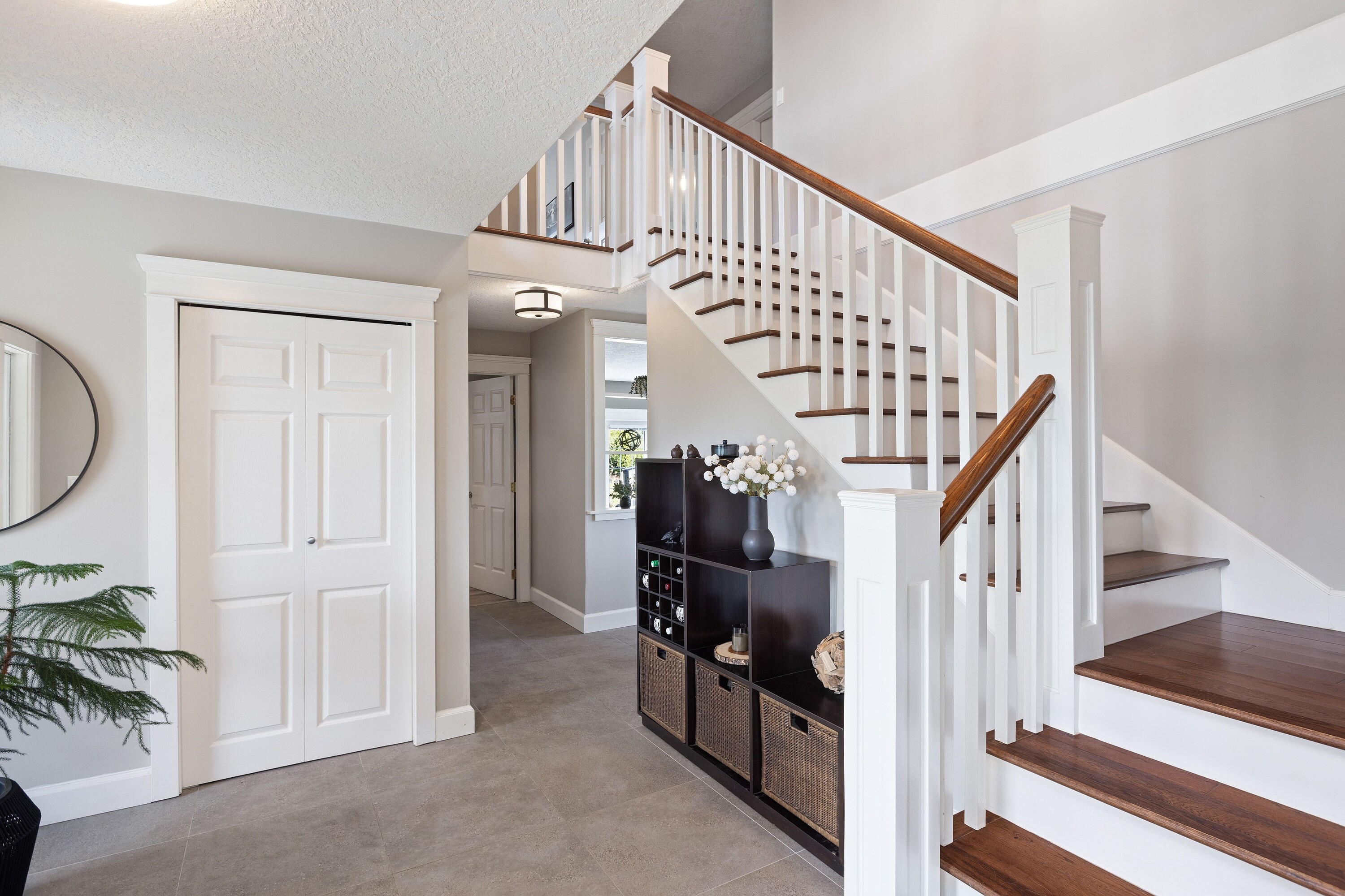 Gorgeous family home. Tucked in a quiet cul-de-sac which backs onto farmland, this immaculate residence is set on a beautifully landscaped 12,000 plus square foot lot. A lovingly maintained 3,293 square foot four-bedroom home blends timeless design with thoughtful updates for today’s family living. The ideal layout offers a welcoming entry with attractive stairwell. Elegant adjoining living and dining rooms with hardwood floors, huge picture window and fireplace. The heart of the home is a tasteful kitchen which opens seamlessly to the inviting family room with gas fireplace. Ductless heat pumps offer efficient heating/cooling. Upstairs, the generous primary suite has a four-piece ensuite and dual walk-in closets.Three additional spacious bedrooms, a versatile rec room and built-in office nook for flexibility. The fenced yard is a private retreat offering lush landscaping with irrigation plus expansive decks and patios for family barbecues. RV parking too, all in a family-friendly community.