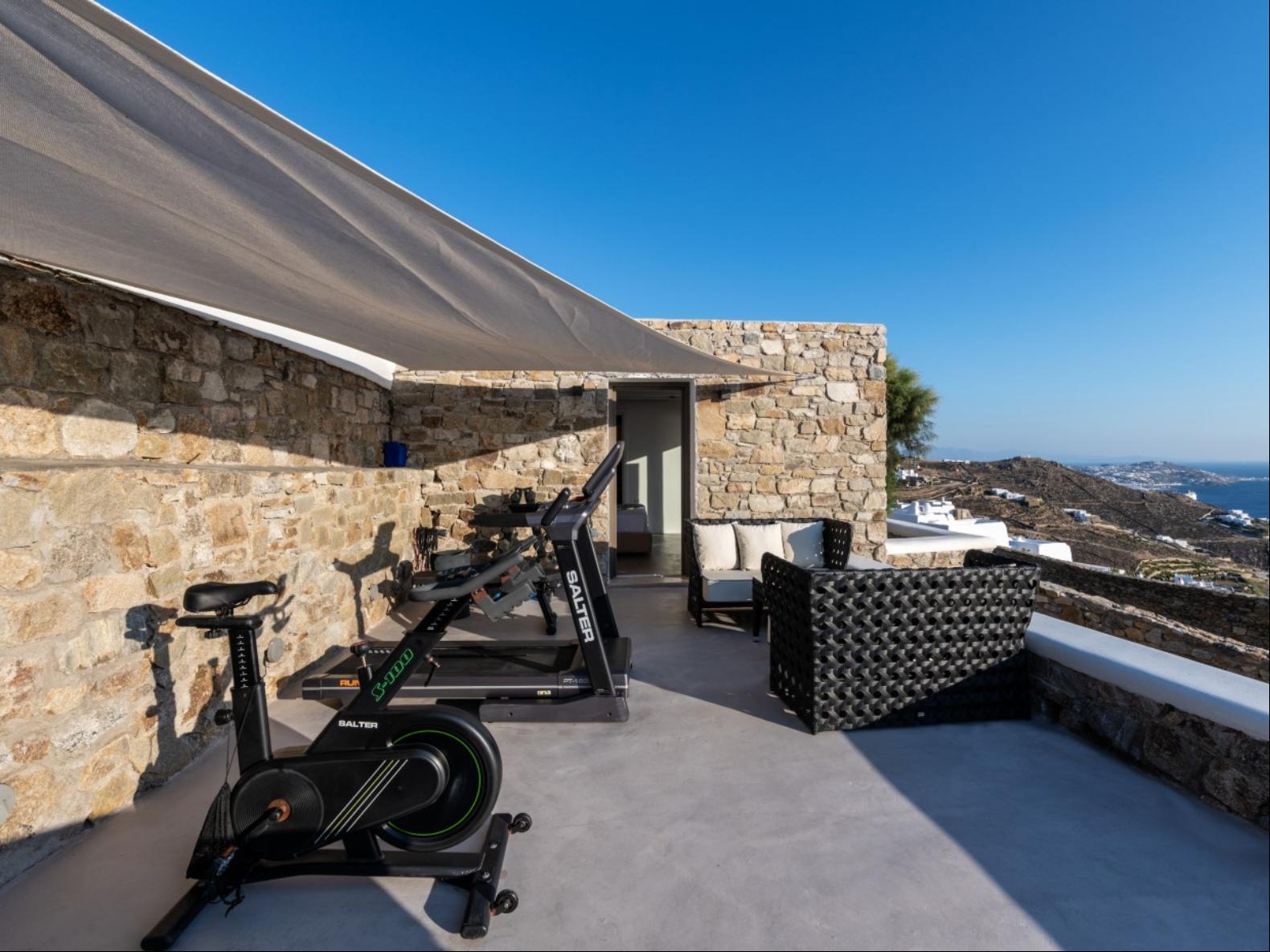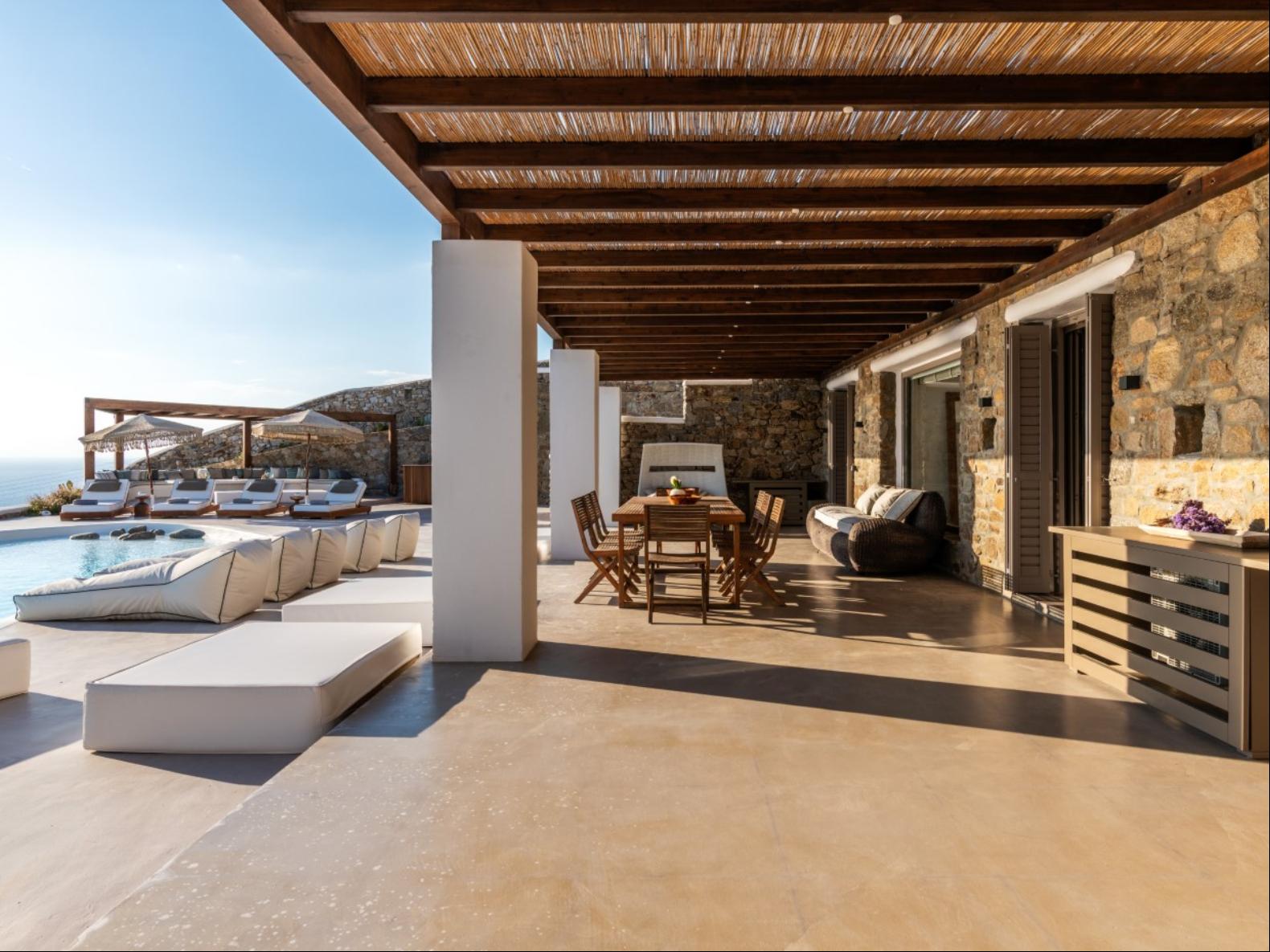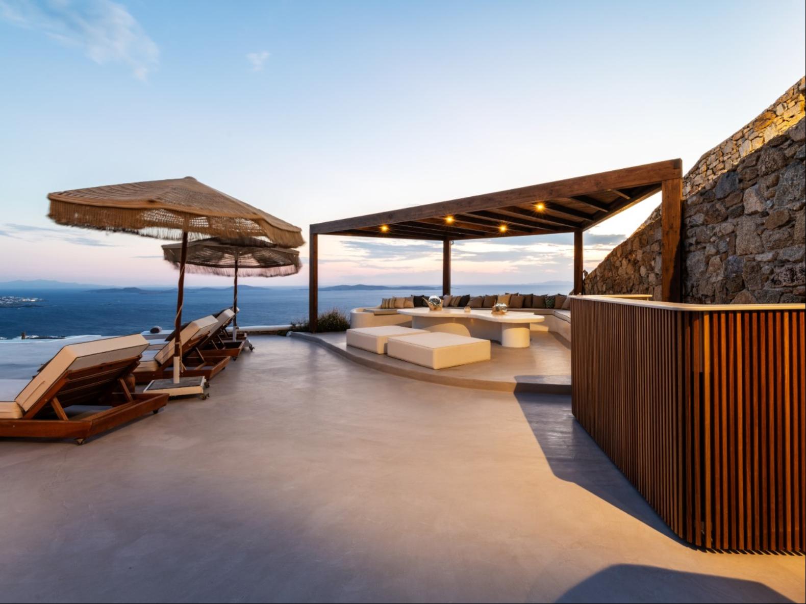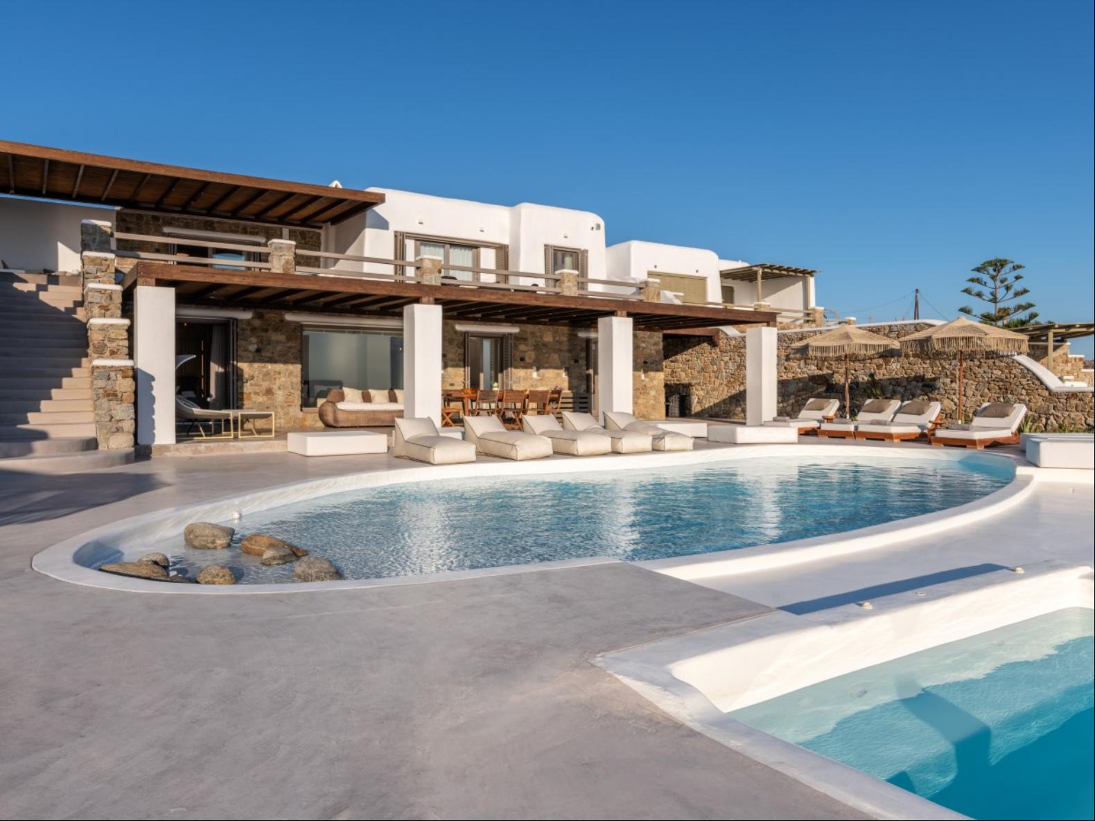 Perched in Fanari, this private haven boasts awe-inspiring sea vistas and unforgettable sunsets, combining seclusion with easy access to Mykonos Town’s vibrant nightlife. The property has a total of 8 Bedrooms and 9 bathrooms and expands in three levels: the ground floor, the pool floor, and the lower floor.The design of the villa is modern, with minimal interiors in pastel colors. The rooms are airy with elegant en suite bathrooms and art deco elements. The ground level consists of an open plan fully equipped kitchen, with a dining table and cozy lounge corners in nude tones.The outdoor areas are designed to appeal to guests with a variety of amenities. The private infinity swimming pool plays a central role and the alfresco jacuzzi is there to offer you relaxation moments with your loved ones. One of the highlights of the space is the pool bar, ready to serve you and your guests at the unforgettable Mykonian nights. The outdoor area includes 2 shaded dining areas, 2 shaded outdoor lounge areas, and outdoor gym equipment for you to enjoy.In this exclusive estate, every corner is at your disposal!