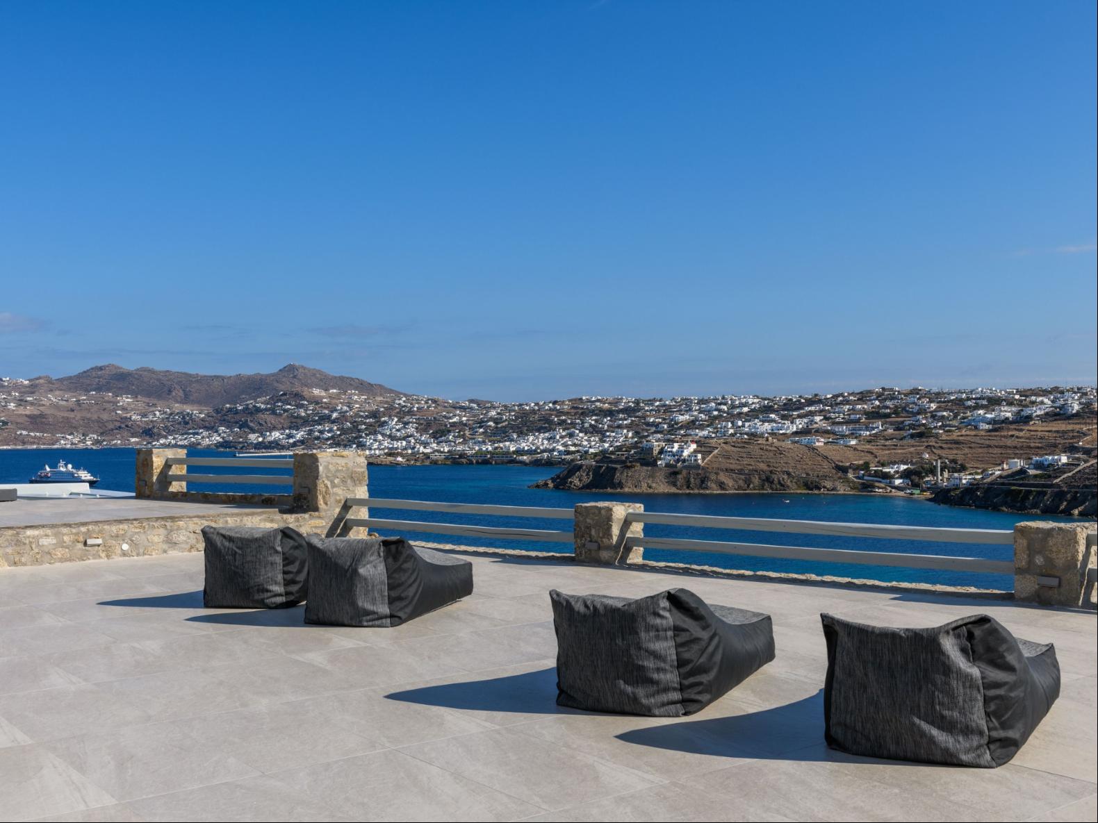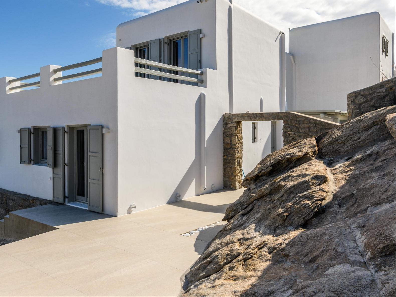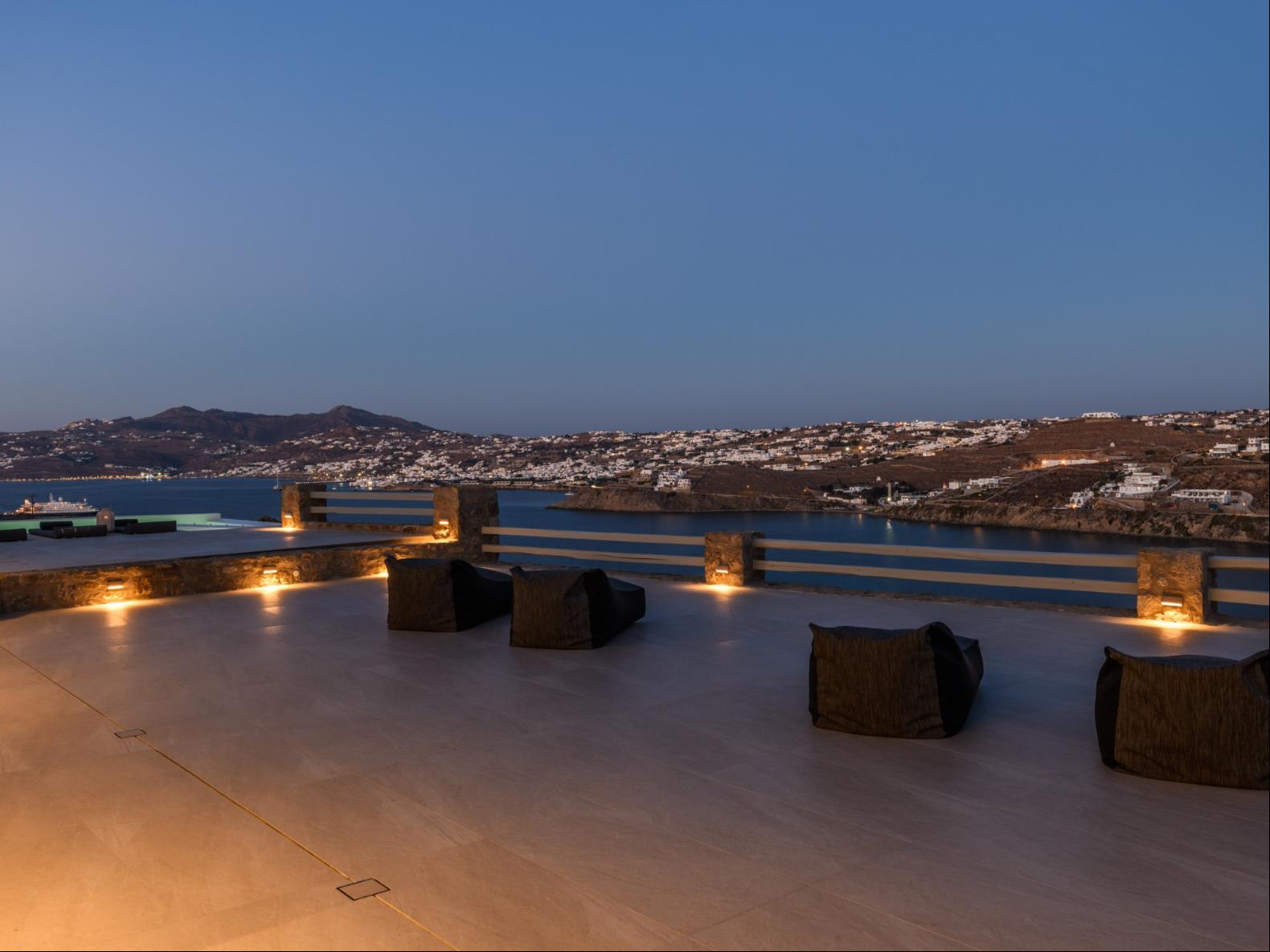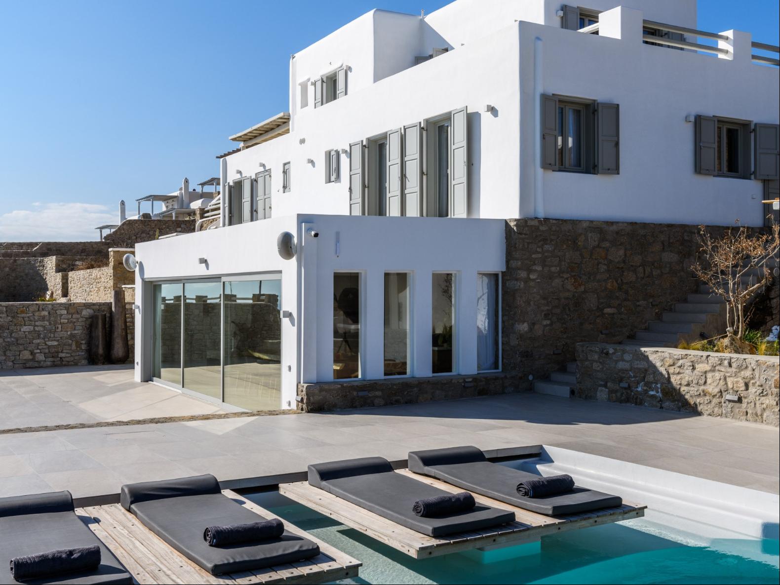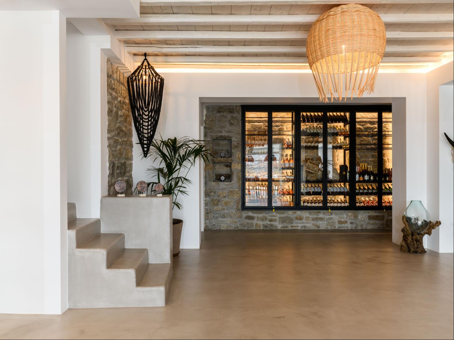 A newly built estate situated in the prime Kanalia area, just steps from the renowned Ornos Beach and Santa Marina Hotel. Perched on a hillside, it offers sweeping views of Korfos Bay and the iconic whitewashed houses of Mykonos Town. The property can accommodate 14 guests and consists of 3 levels in total. On the main level the guest can find the common area like the living room , the kitchen and the dinning area as well as 3 double bedrooms. On the same level you can enjoy the majestic wine cellar that decorates the main floor. On the lower level you can find 3 more double bedrooms and on the upper floor is locate the Master Bedroom. Enjoy breathtaking panoramas from this hillside estate, where the Aegean Sea stretches as far as the eye can see. Enjoy your private infinity pool after a long day at the near by famous beach clubs of Mykonos and spend chill afternoons under the warm Greek sun with a tropical cocktail in your hand!