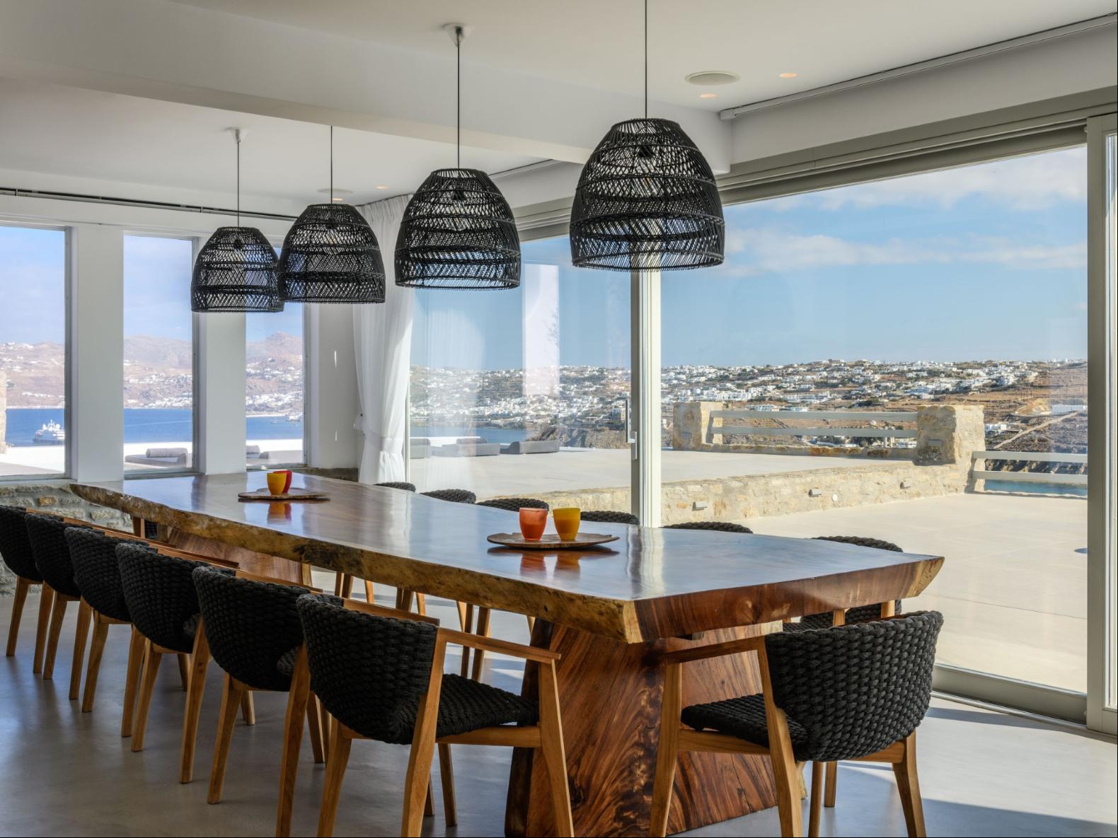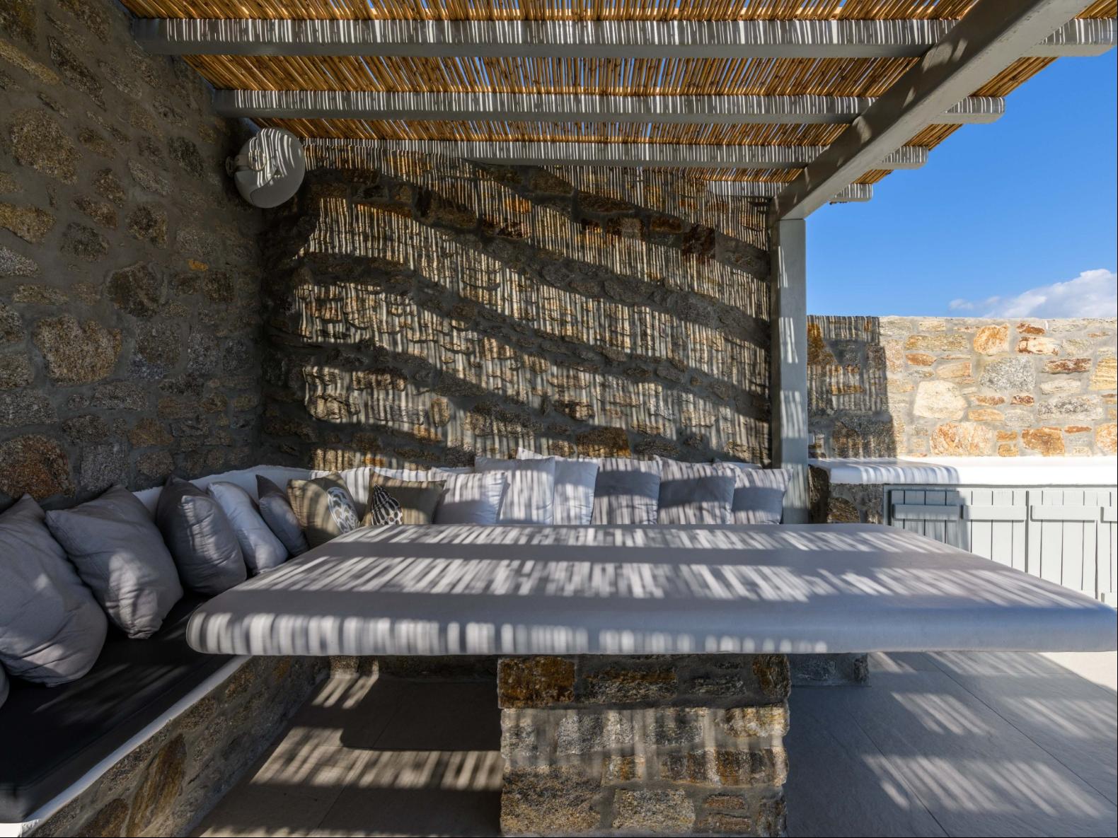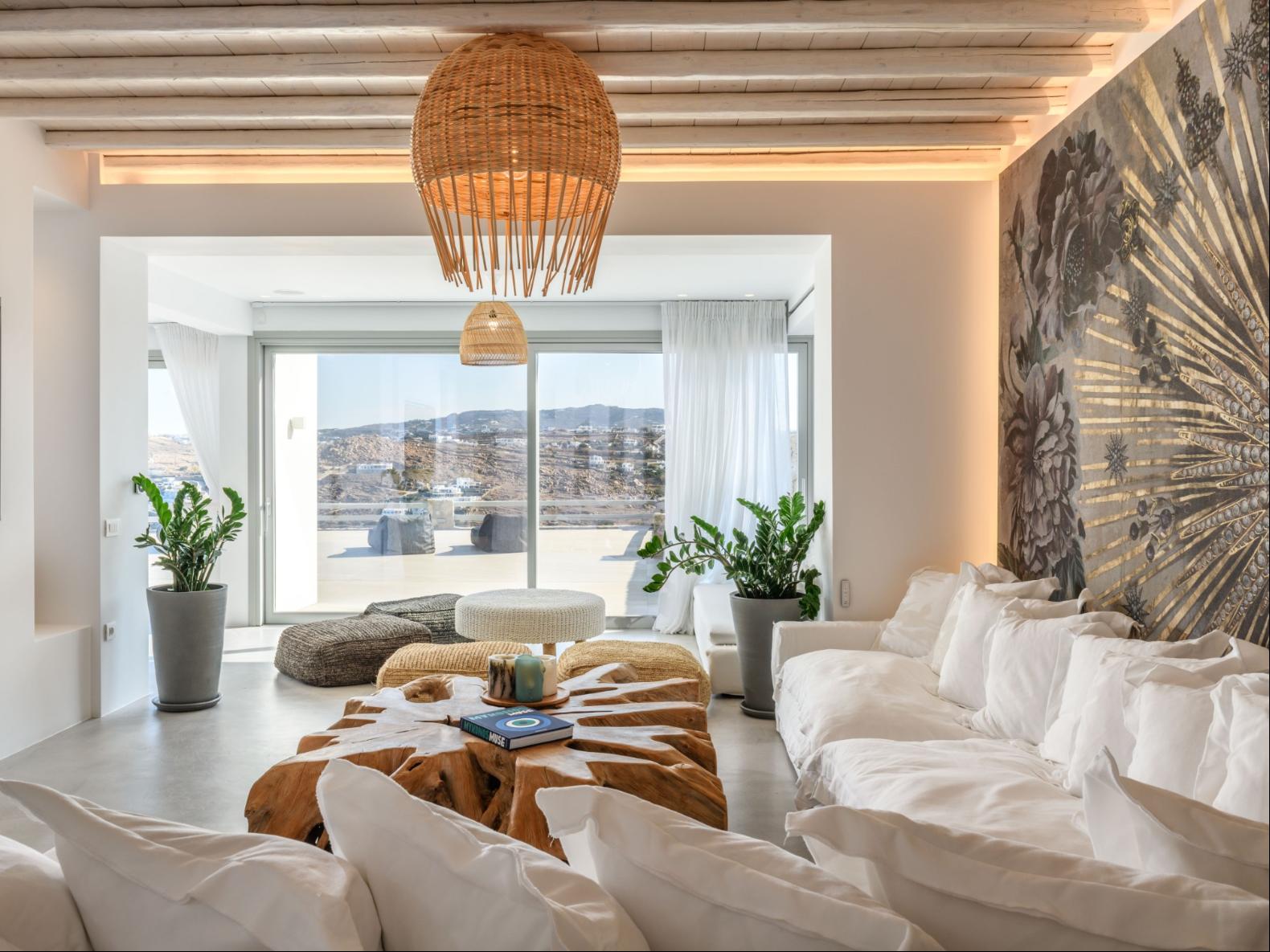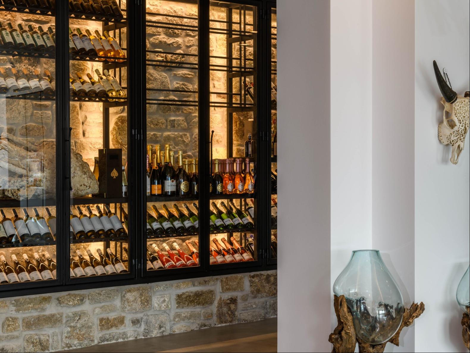 A newly built estate situated in the prime Kanalia area, just steps from the renowned Ornos Beach and Santa Marina Hotel. Perched on a hillside, it offers sweeping views of Korfos Bay and the iconic whitewashed houses of Mykonos Town. The property can accommodate 14 guests and consists of 3 levels in total. On the main level the guest can find the common area like the living room , the kitchen and the dinning area as well as 3 double bedrooms. On the same level you can enjoy the majestic wine cellar that decorates the main floor. On the lower level you can find 3 more double bedrooms and on the upper floor is locate the Master Bedroom. Enjoy breathtaking panoramas from this hillside estate, where the Aegean Sea stretches as far as the eye can see. Enjoy your private infinity pool after a long day at the near by famous beach clubs of Mykonos and spend chill afternoons under the warm Greek sun with a tropical cocktail in your hand!