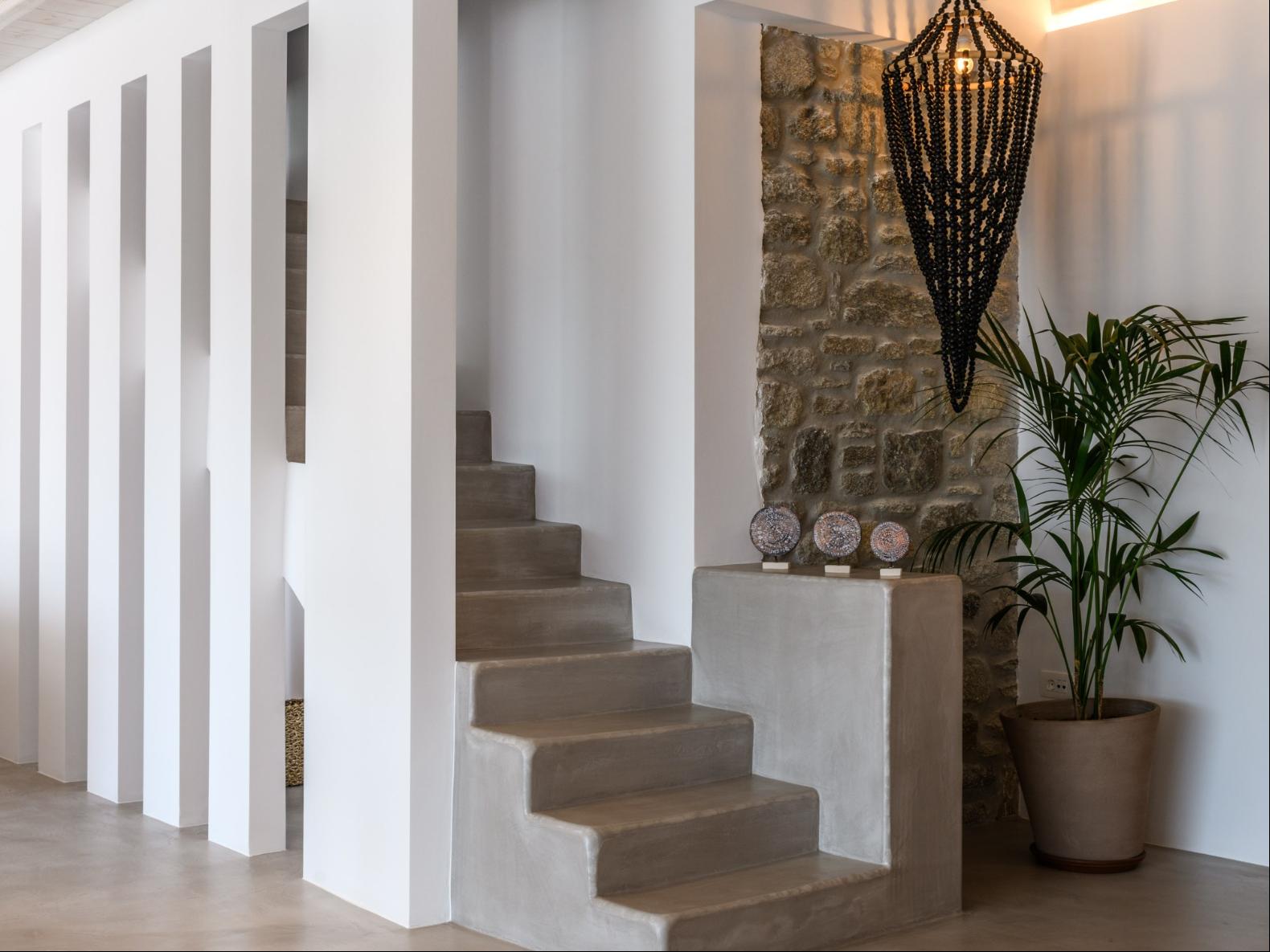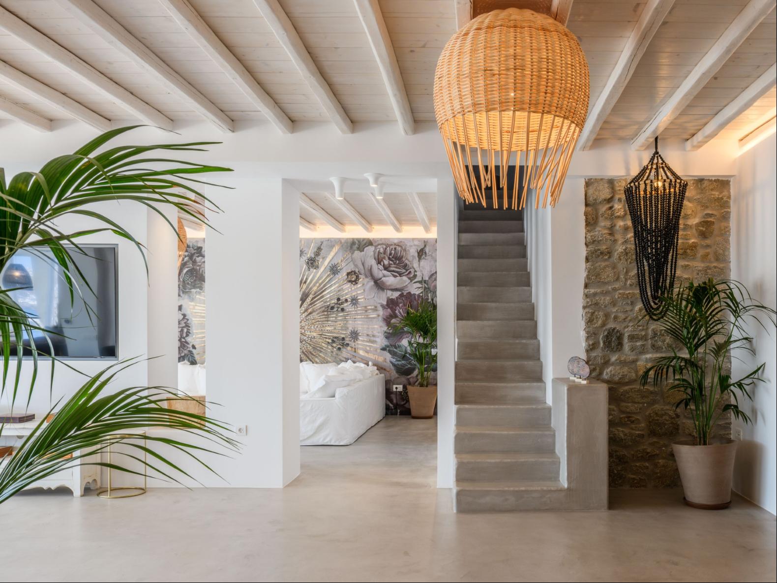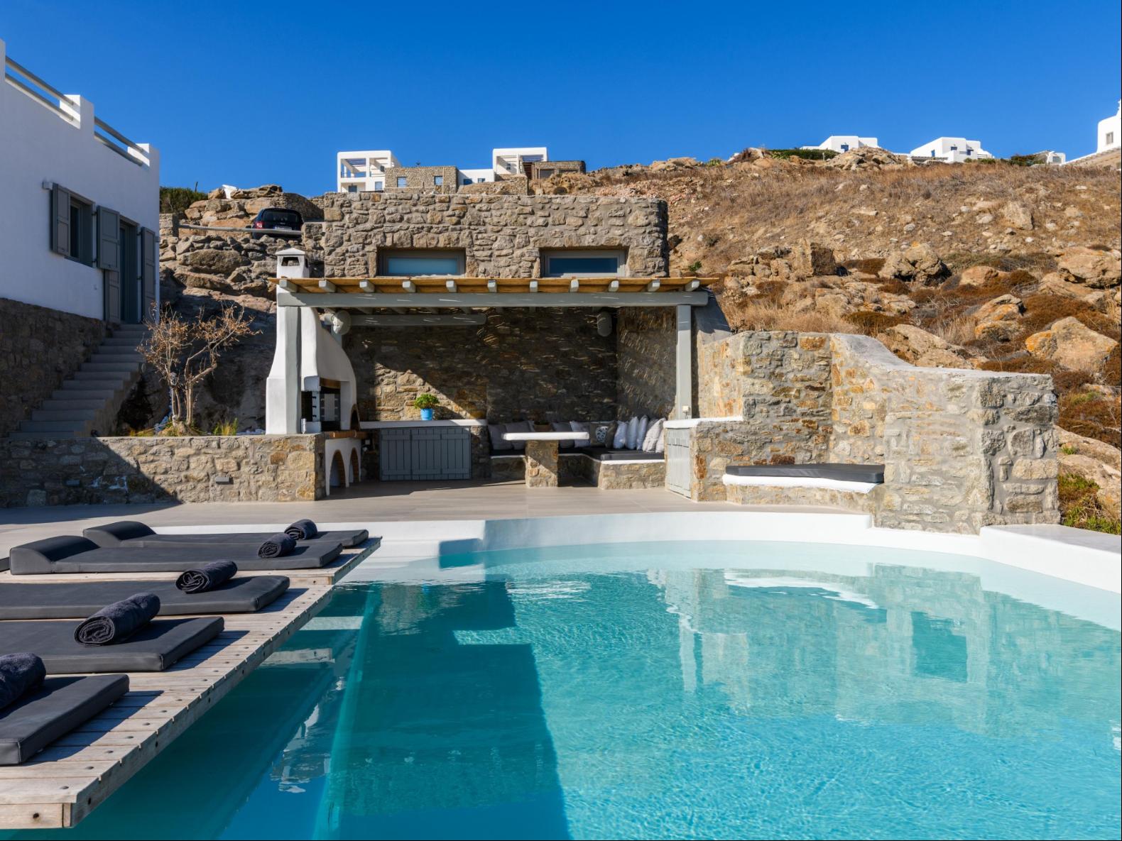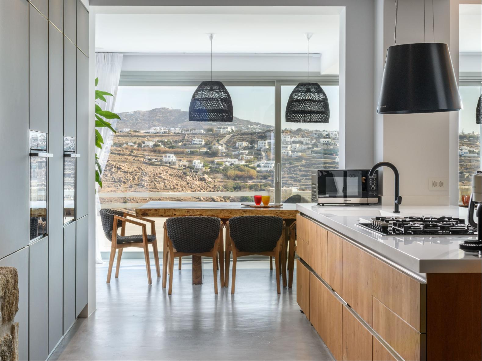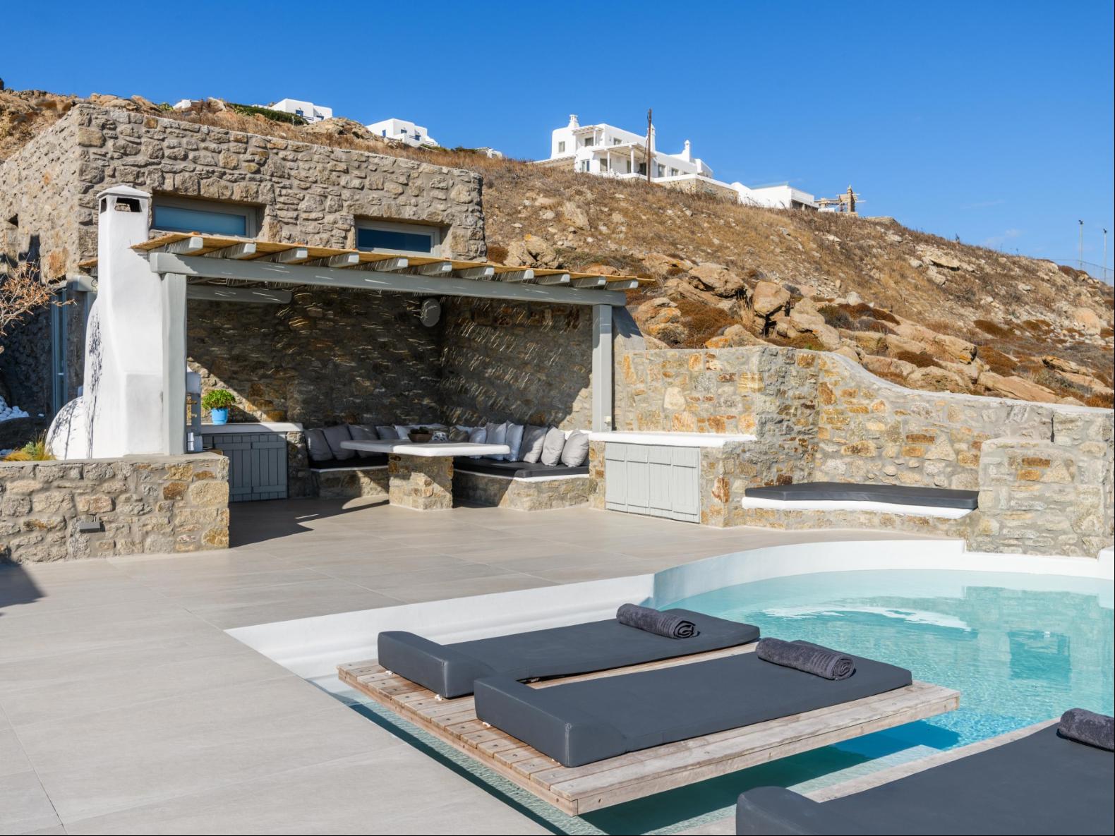 A newly built estate situated in the prime Kanalia area, just steps from the renowned Ornos Beach and Santa Marina Hotel. Perched on a hillside, it offers sweeping views of Korfos Bay and the iconic whitewashed houses of Mykonos Town. The property can accommodate 14 guests and consists of 3 levels in total. On the main level the guest can find the common area like the living room , the kitchen and the dinning area as well as 3 double bedrooms. On the same level you can enjoy the majestic wine cellar that decorates the main floor. On the lower level you can find 3 more double bedrooms and on the upper floor is locate the Master Bedroom. Enjoy breathtaking panoramas from this hillside estate, where the Aegean Sea stretches as far as the eye can see. Enjoy your private infinity pool after a long day at the near by famous beach clubs of Mykonos and spend chill afternoons under the warm Greek sun with a tropical cocktail in your hand!