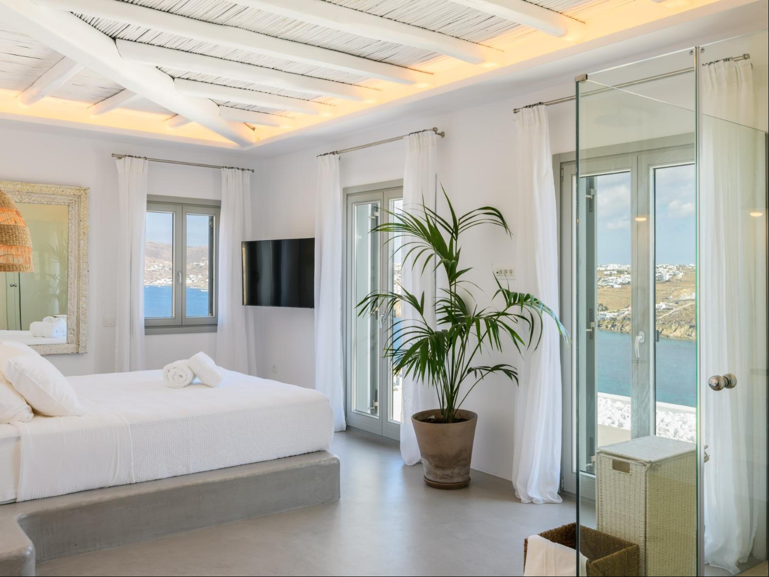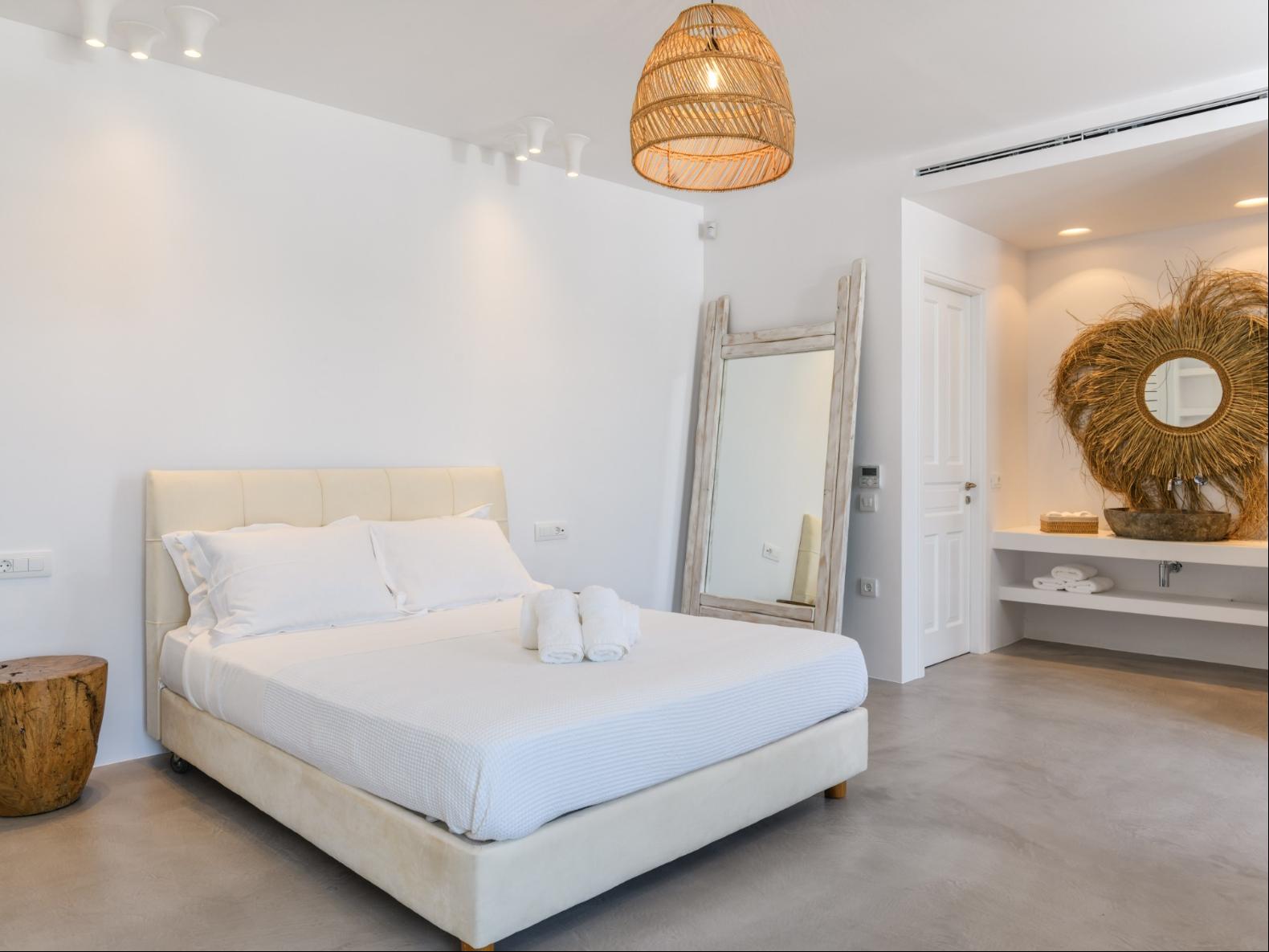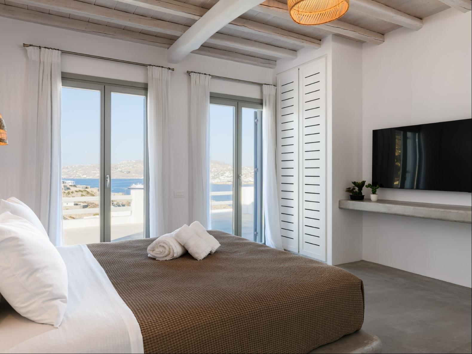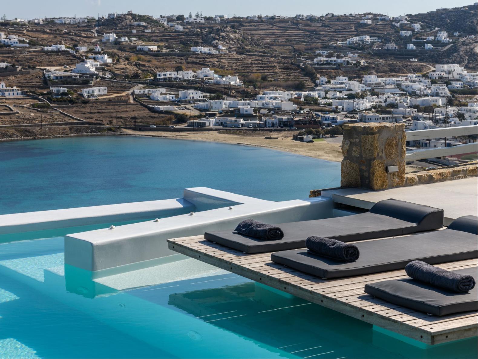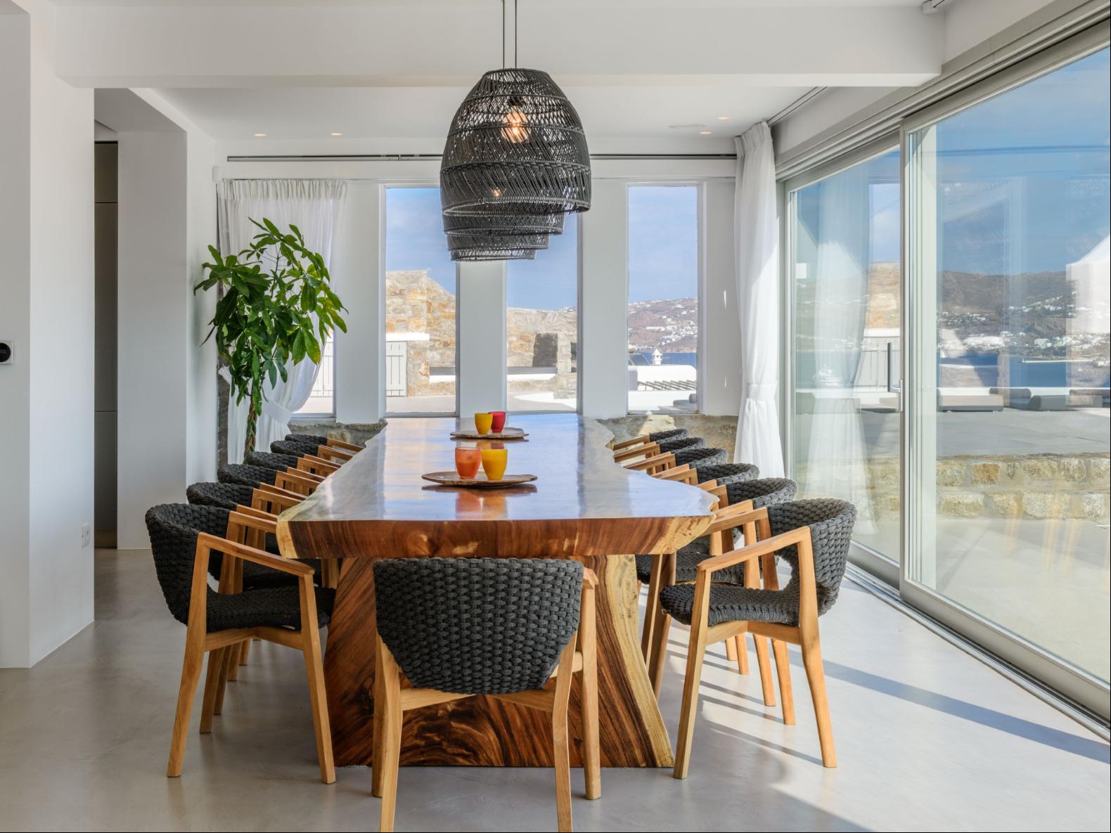 A newly built estate situated in the prime Kanalia area, just steps from the renowned Ornos Beach and Santa Marina Hotel. Perched on a hillside, it offers sweeping views of Korfos Bay and the iconic whitewashed houses of Mykonos Town. The property can accommodate 14 guests and consists of 3 levels in total. On the main level the guest can find the common area like the living room , the kitchen and the dinning area as well as 3 double bedrooms. On the same level you can enjoy the majestic wine cellar that decorates the main floor. On the lower level you can find 3 more double bedrooms and on the upper floor is locate the Master Bedroom. Enjoy breathtaking panoramas from this hillside estate, where the Aegean Sea stretches as far as the eye can see. Enjoy your private infinity pool after a long day at the near by famous beach clubs of Mykonos and spend chill afternoons under the warm Greek sun with a tropical cocktail in your hand!