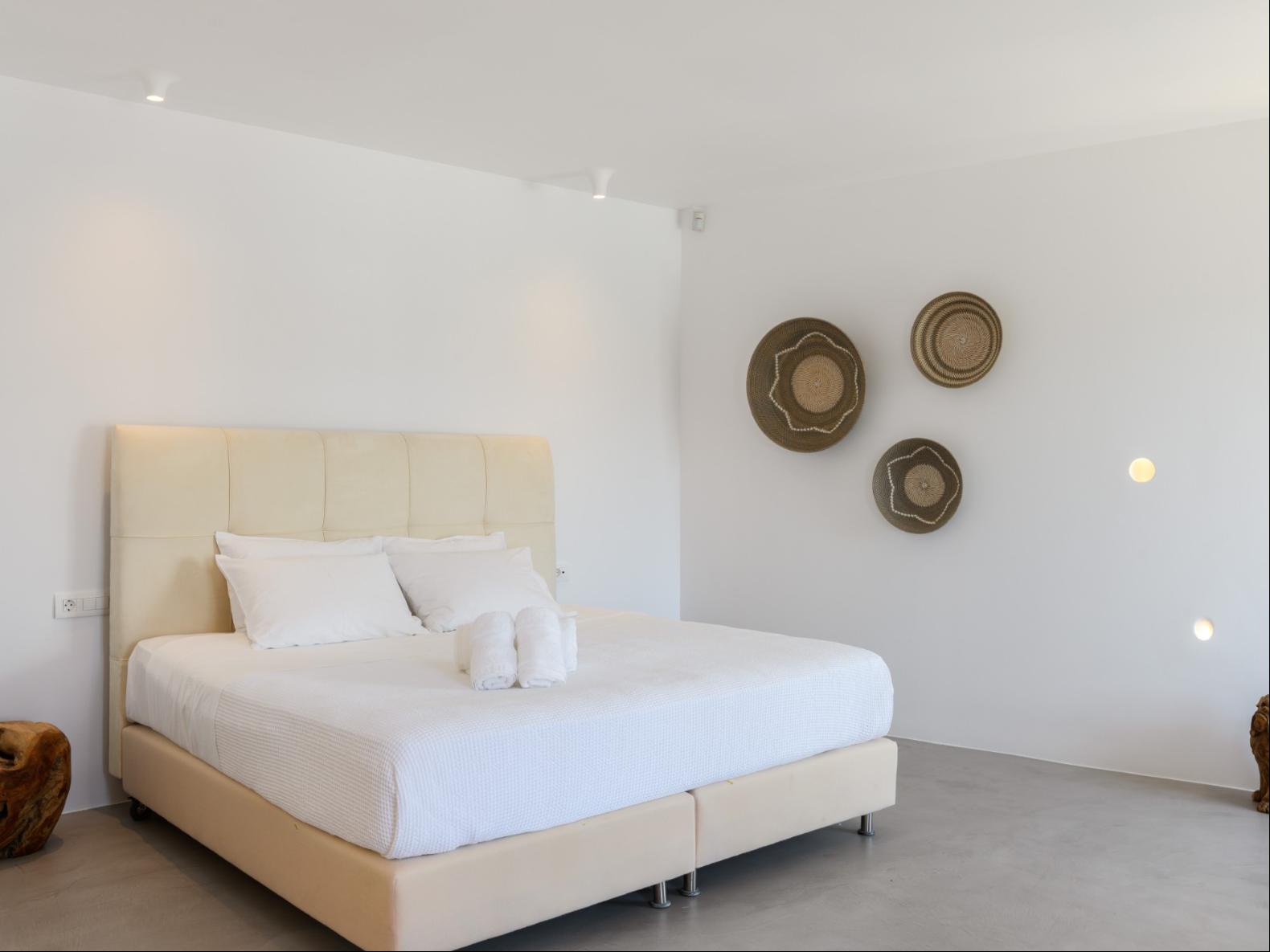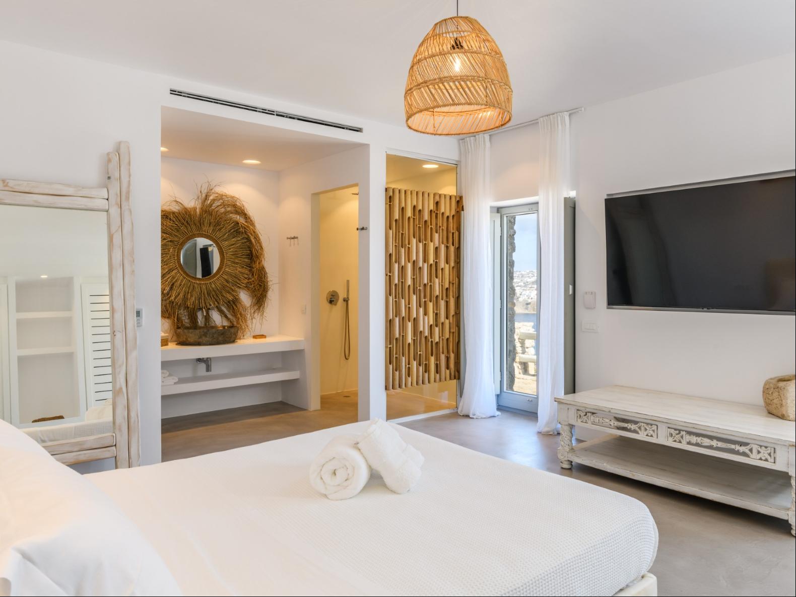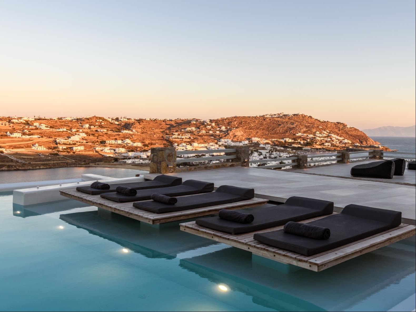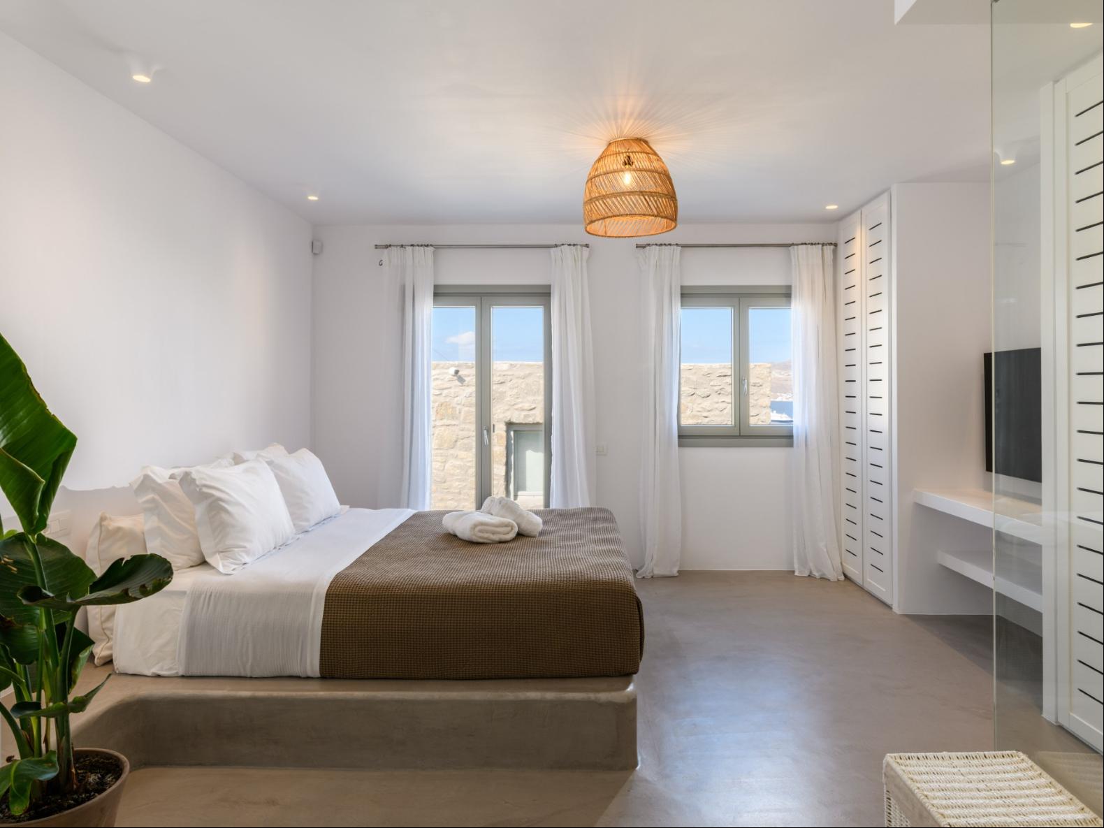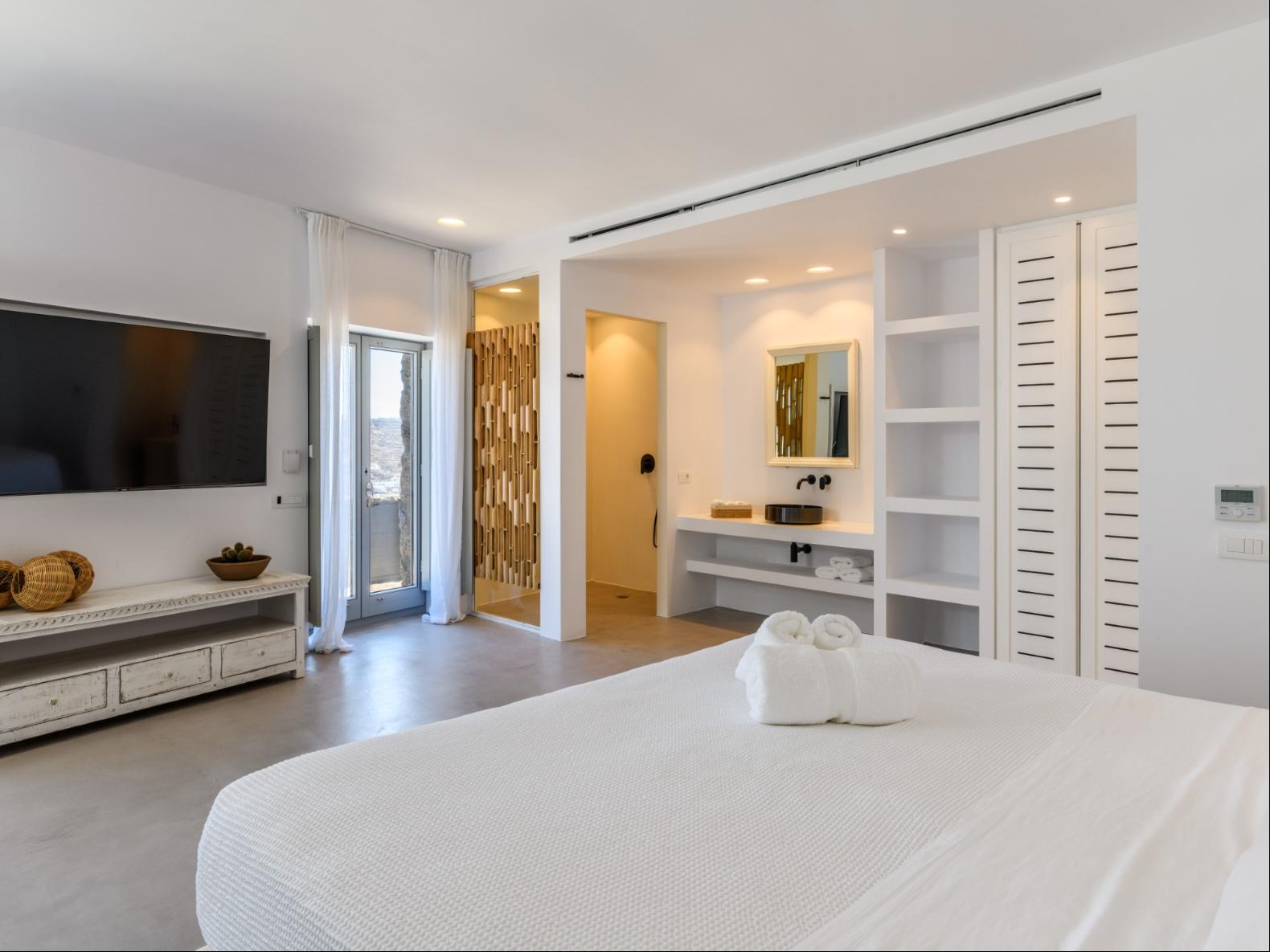 A newly built estate situated in the prime Kanalia area, just steps from the renowned Ornos Beach and Santa Marina Hotel. Perched on a hillside, it offers sweeping views of Korfos Bay and the iconic whitewashed houses of Mykonos Town. The property can accommodate 14 guests and consists of 3 levels in total. On the main level the guest can find the common area like the living room , the kitchen and the dinning area as well as 3 double bedrooms. On the same level you can enjoy the majestic wine cellar that decorates the main floor. On the lower level you can find 3 more double bedrooms and on the upper floor is locate the Master Bedroom. Enjoy breathtaking panoramas from this hillside estate, where the Aegean Sea stretches as far as the eye can see. Enjoy your private infinity pool after a long day at the near by famous beach clubs of Mykonos and spend chill afternoons under the warm Greek sun with a tropical cocktail in your hand!