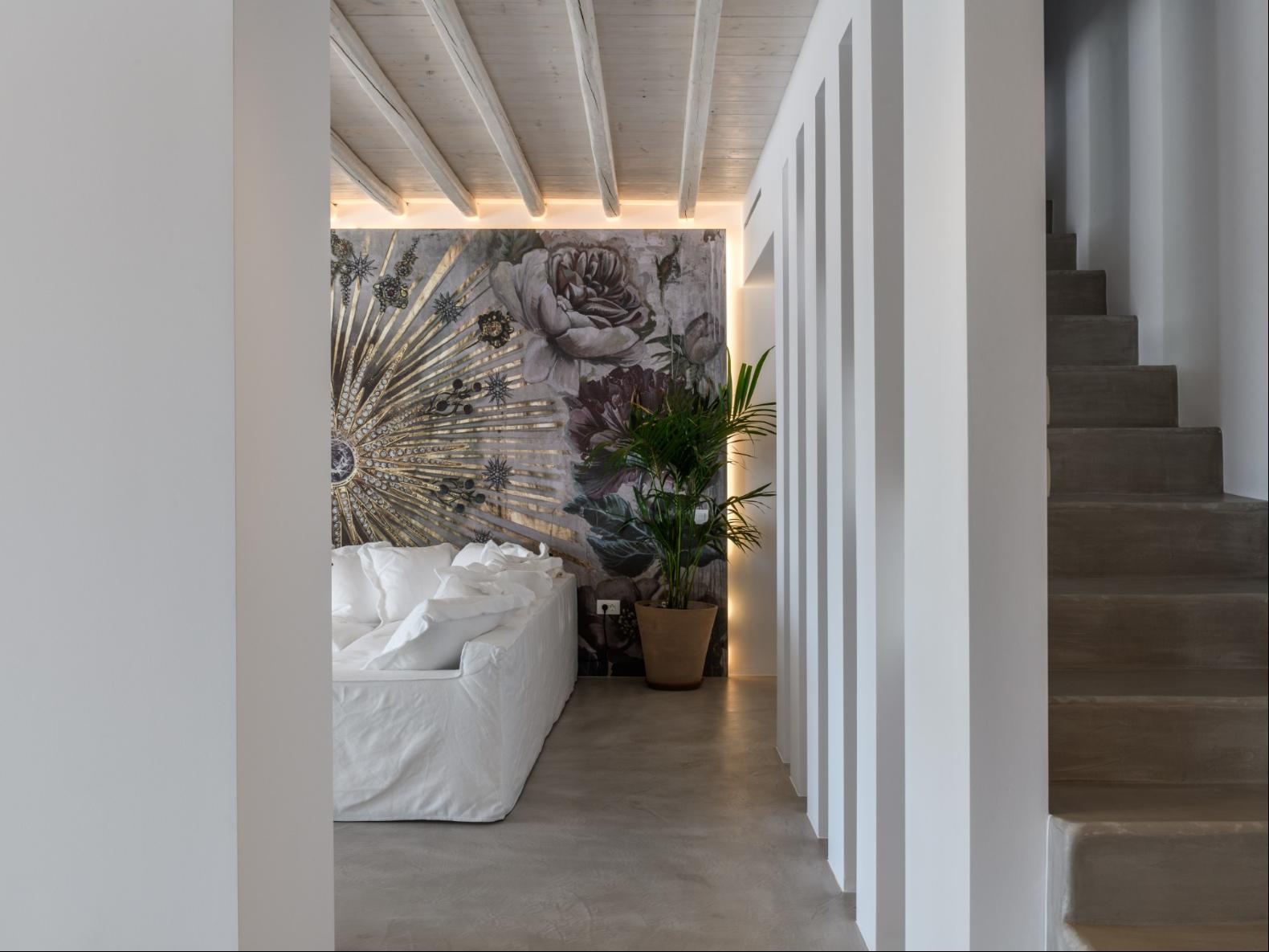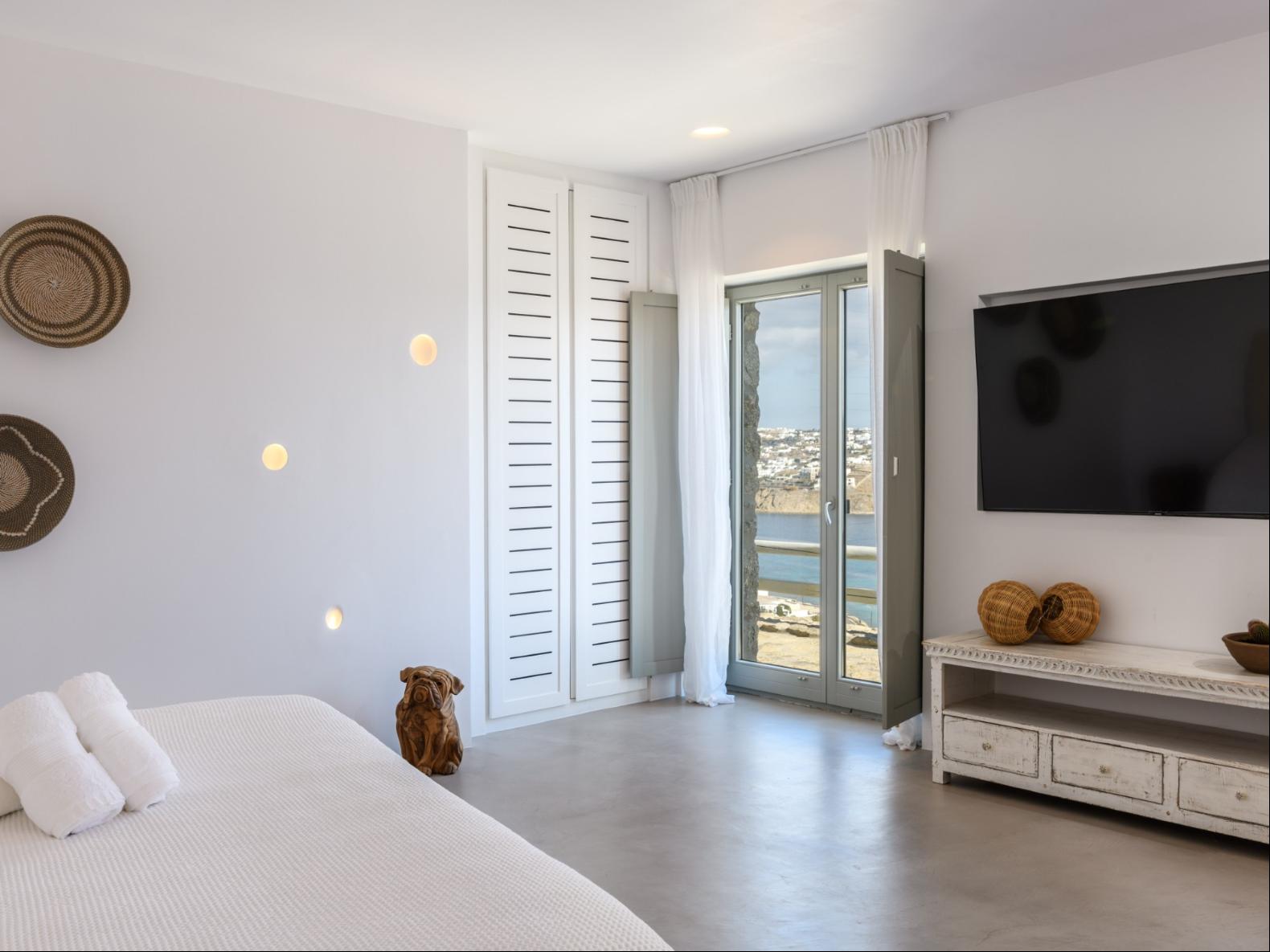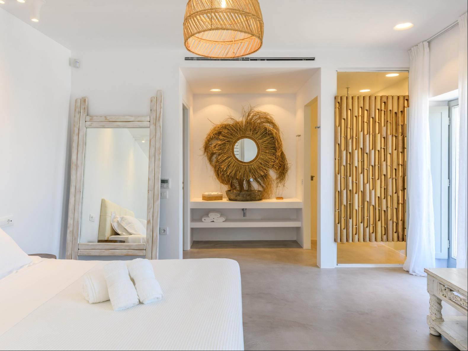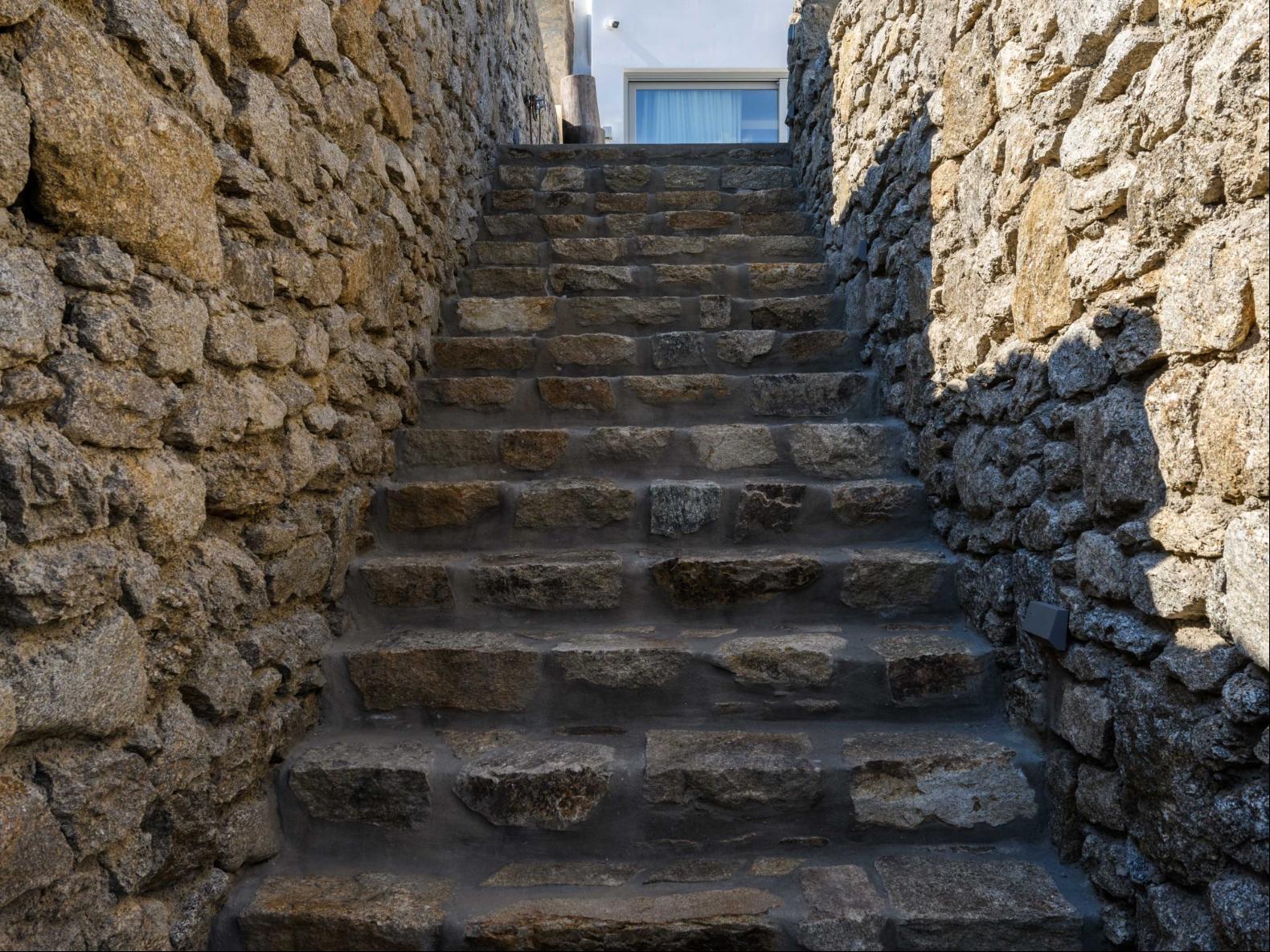 A newly built estate situated in the prime Kanalia area, just steps from the renowned Ornos Beach and Santa Marina Hotel. Perched on a hillside, it offers sweeping views of Korfos Bay and the iconic whitewashed houses of Mykonos Town. The property can accommodate 14 guests and consists of 3 levels in total. On the main level the guest can find the common area like the living room , the kitchen and the dinning area as well as 3 double bedrooms. On the same level you can enjoy the majestic wine cellar that decorates the main floor. On the lower level you can find 3 more double bedrooms and on the upper floor is locate the Master Bedroom. Enjoy breathtaking panoramas from this hillside estate, where the Aegean Sea stretches as far as the eye can see. Enjoy your private infinity pool after a long day at the near by famous beach clubs of Mykonos and spend chill afternoons under the warm Greek sun with a tropical cocktail in your hand!