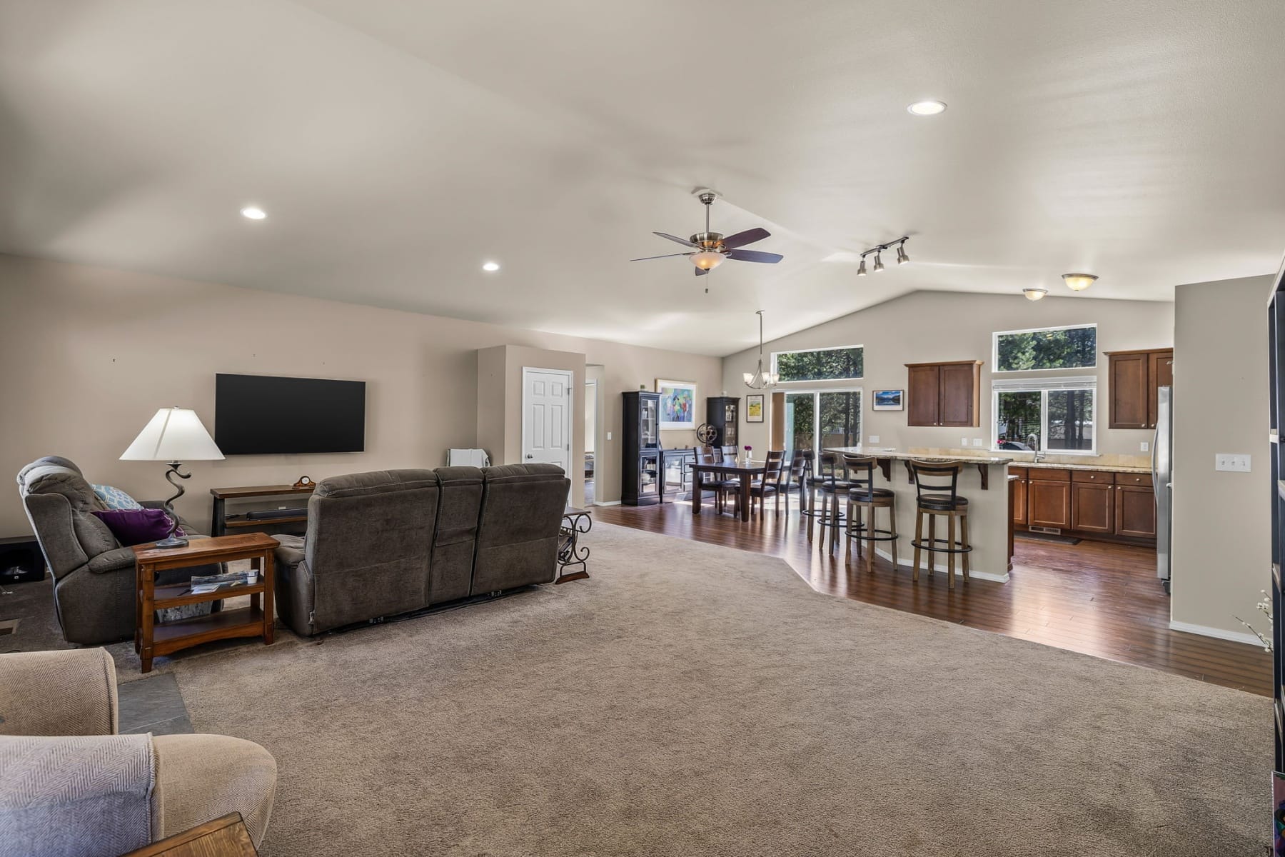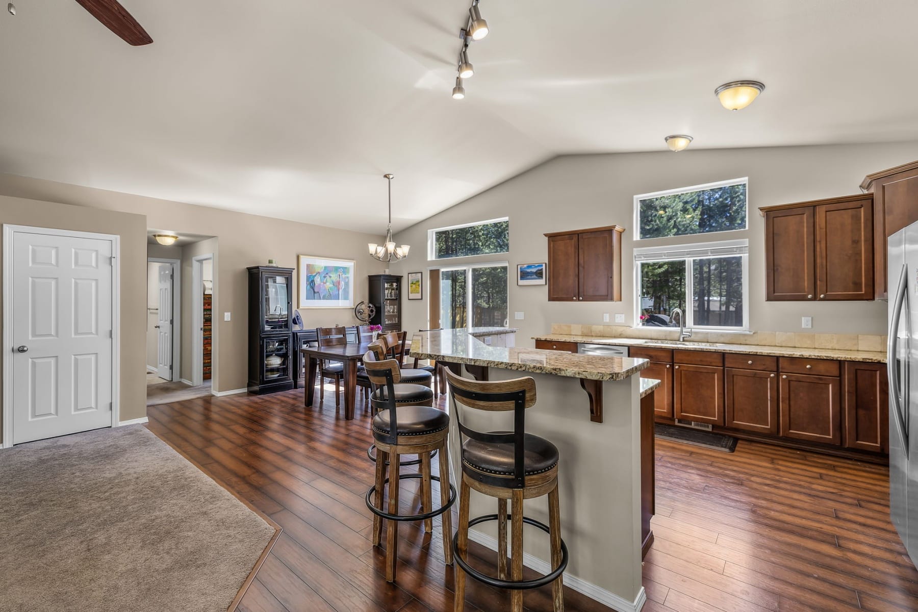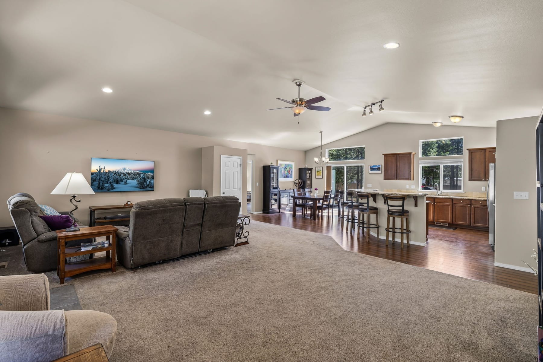 Discover the space & flexibility you've been looking for in this single level home on 1.01 acres in La Pine, Central Oregon. Located on a paved road, this 3 bedroom, 2 bathroom home offers 1,780 sq ft of functional living designed for comfort & ease. The open floor plan features vaulted ceilings & natural light. The kitchen is built for daily living & hosting with cherry cabinets, stainless steel appliances, pantry, island, & soft close drawers with slide out shelving. The primary suite offers an oversized closet, dual vanities & skylight. Two additional bedrooms are positioned on the opposite side for privacy. Outside, a 32x40 shop, RV parking with hookups, & circular asphalt driveway provide versatility. The 1.01 acre lot offers room to expand or relax, with a Trex deck for outdoor living near Bend & Sunriver.