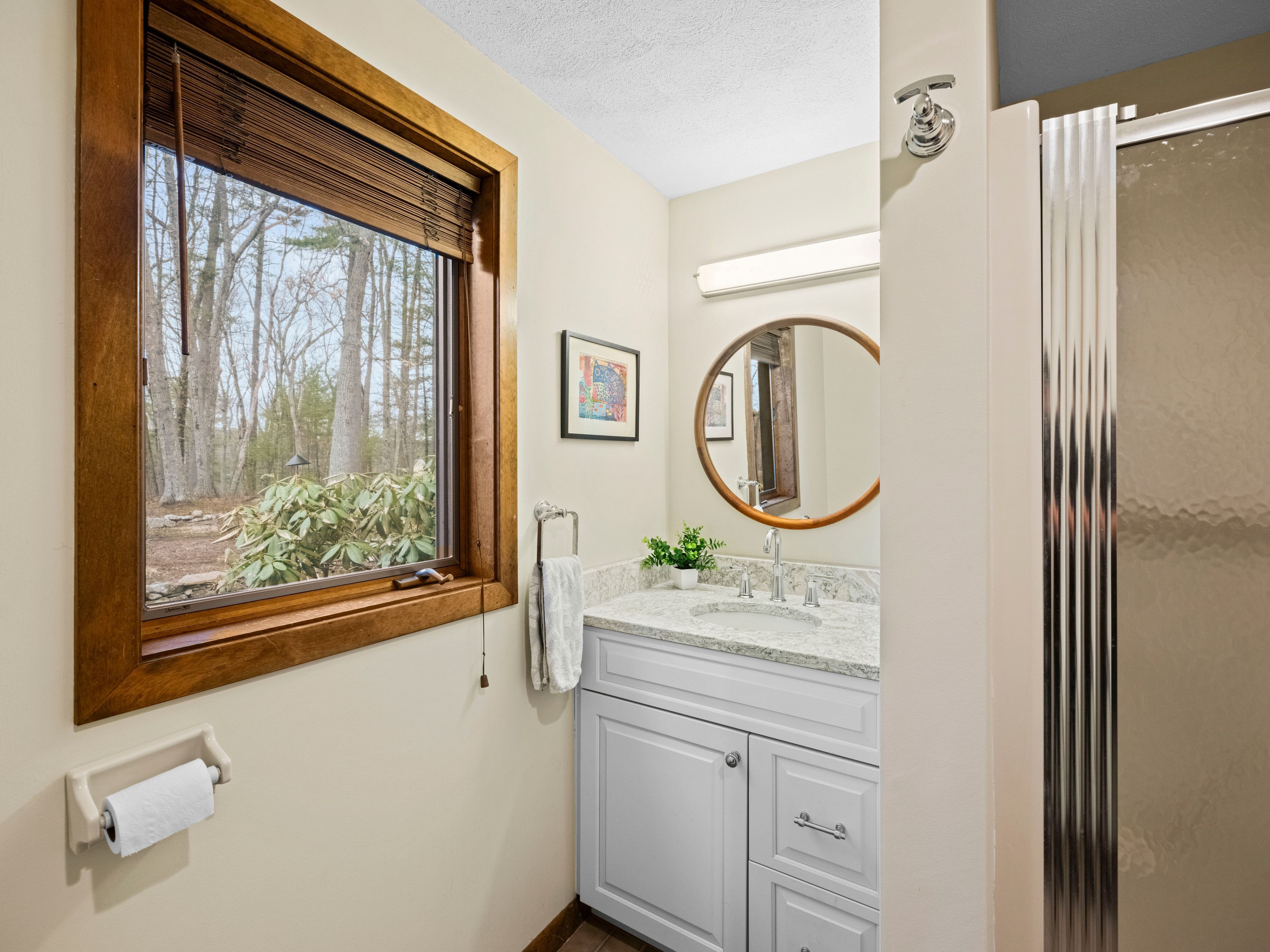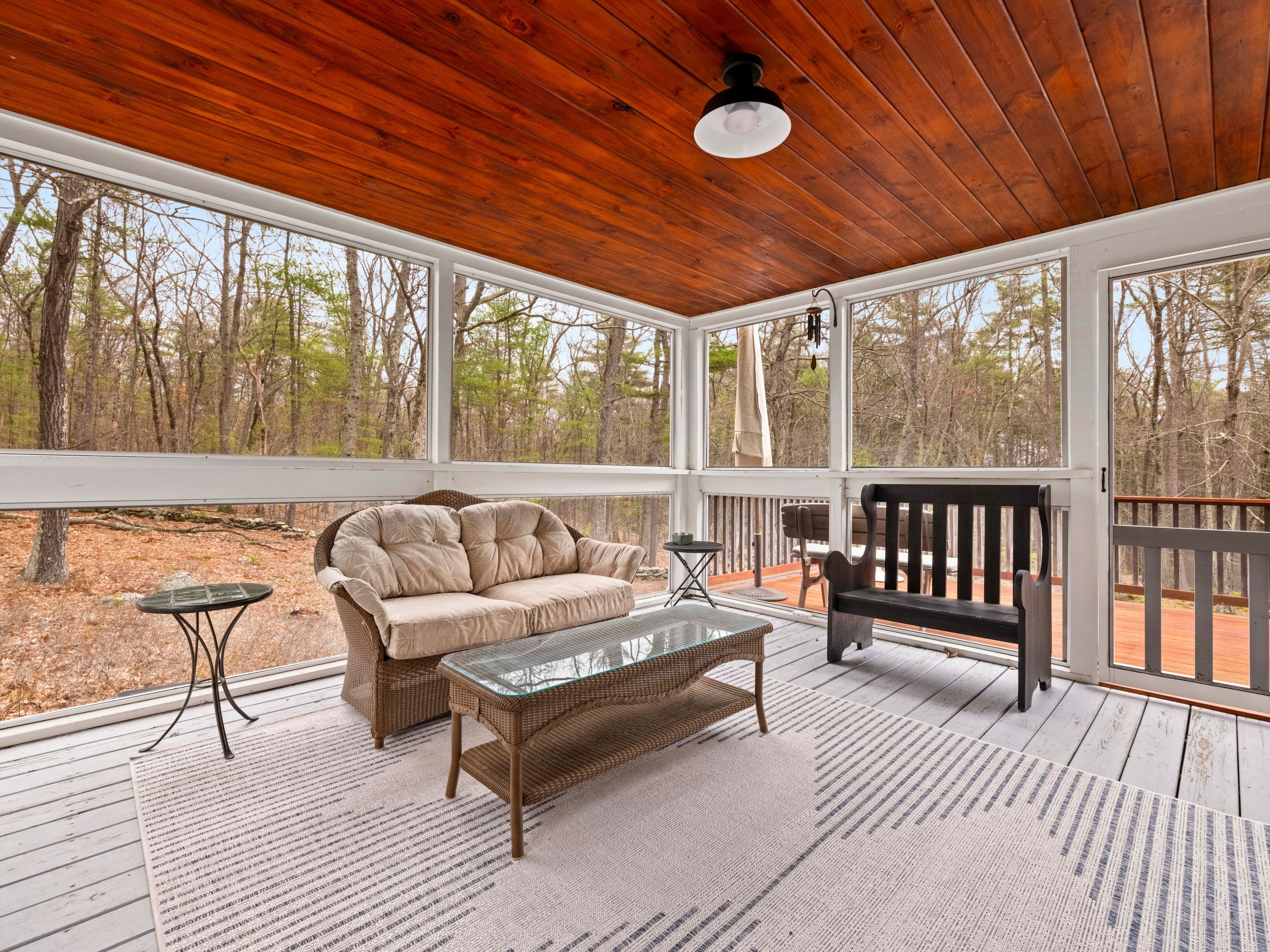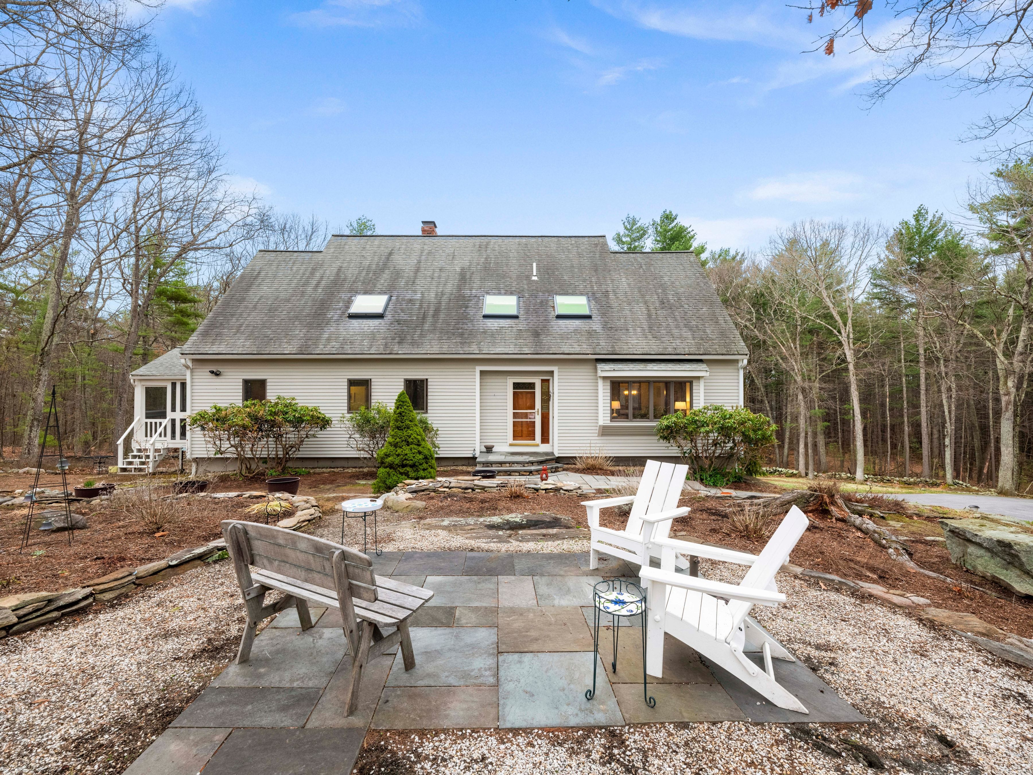 Tucked away on a scenic, wooded setting, this thoughtfully designed Contemporary Cape offers a harmonious blend of comfort and functionality. This sun-filled home features an updated kitchen showcasing granite counter tops, stainless steel appliances, and ample cabinetry, ideal for everyday living and entertaining. A fireplaced family room provides slider access to an enclosed porch, which has direct access to a mahogany deck. Upstairs, the primary suite offers a peaceful retreat, complemented by a well-proportioned full en-suite bathroom. Two additional bedrooms and a laundry room complete the second floor. Enjoy outdoor living in beautifully maintained grounds with stone walls and garden areas. Additional highlights include central air, a two-car garage, and a walk-out basement offering expansion potential. Conveniently located near trails, conservation land, local amenities and a top-rated school system.