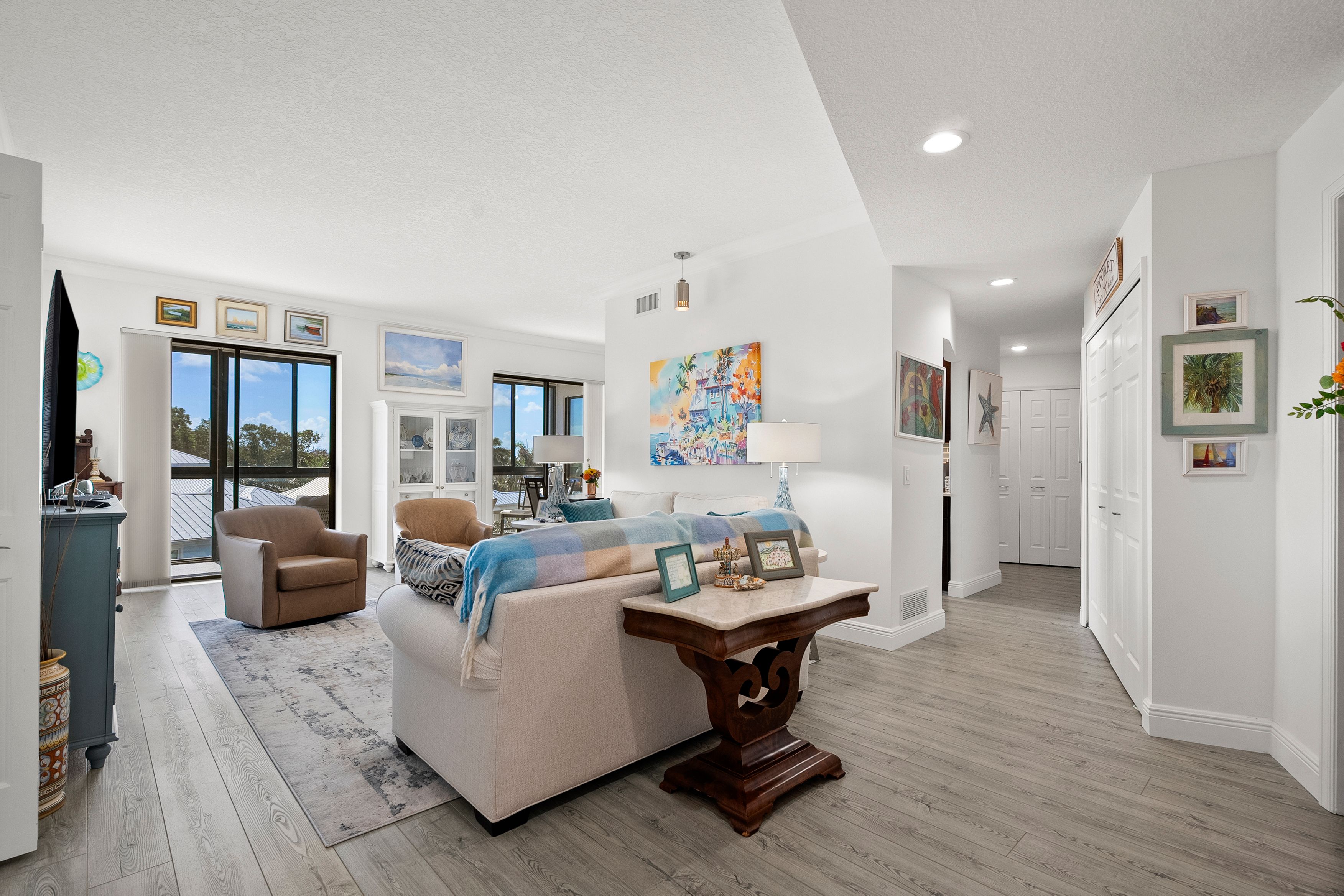 Experience easy coastal living in this updated 2 bedroom/2bathroom end-unit condo with scenic St. Lucie River views in the gated, marina-front community of Four Winds on the River in downtown Stuart. Located on the 4th floor at the end of a quiet hallway, this light-filled residence offers privacy and a desirable east-facing exposure. Desirable foor-to-ceiling updates completed in recent years include quartz countertops, kitchen backsplash, custom solid wood kitchen cabinetry, updated baths, modern fixtures, and coastal finishes. Two impact glass enclosed lanais provide year-round indoor-outdoor living space - ideal for morning sunrises and any time of day relaxation. Elevator access, covered parking, and resort-style amenities: waterfront pool, clubhouse, tennis, pickleball, and marina with boat slips available. Minutes to downtown Stuart dining, shopping, and entertainment. Perfect as a primary residence, seasonal getaway, or lock-and-leave waterfront condo. Your best life awaits you here!