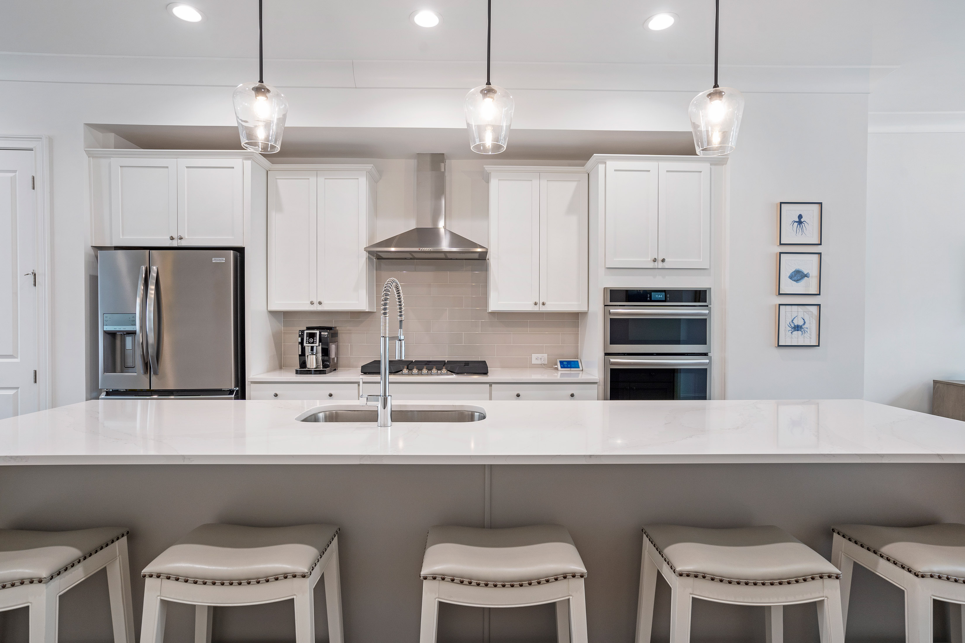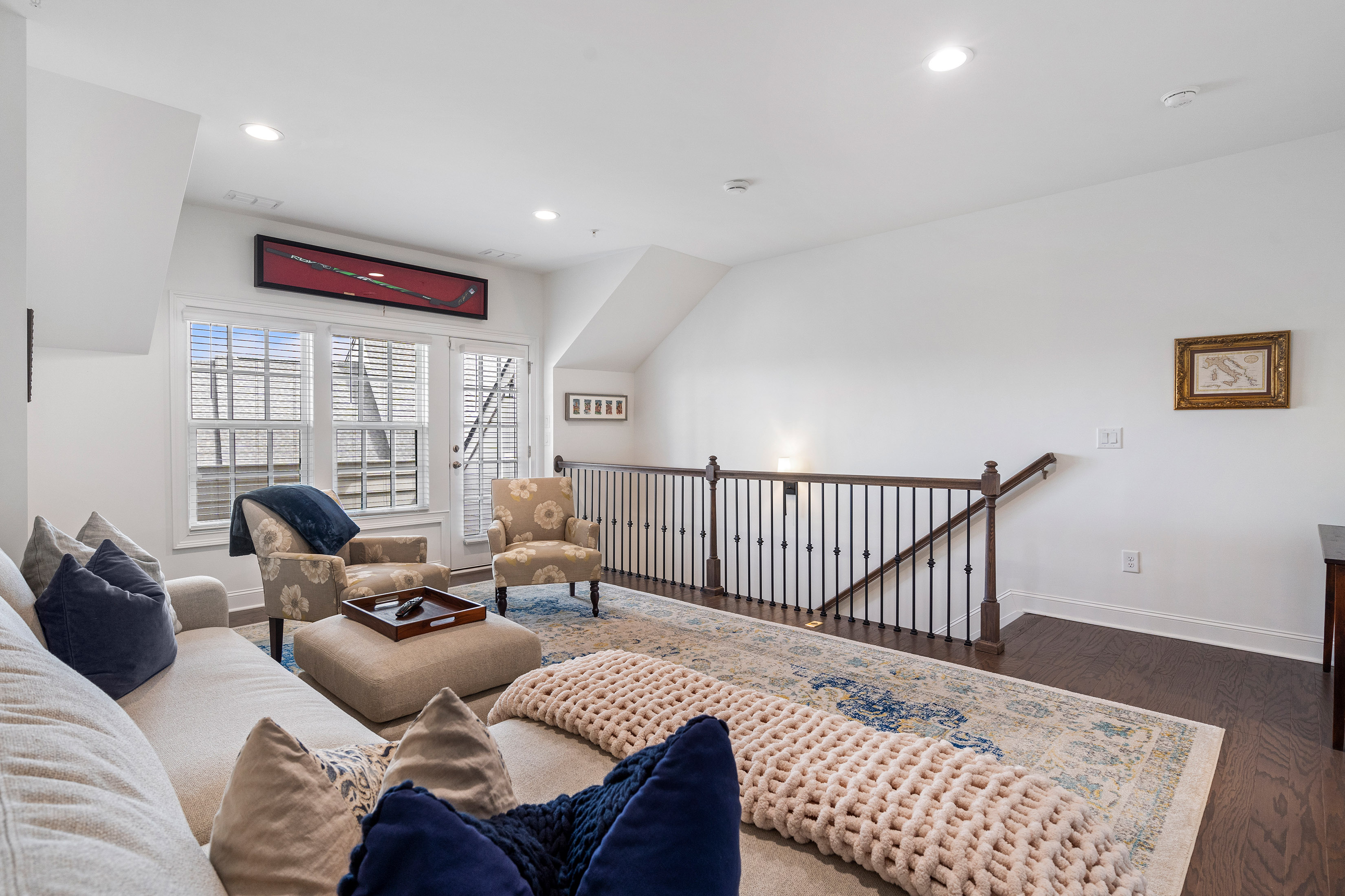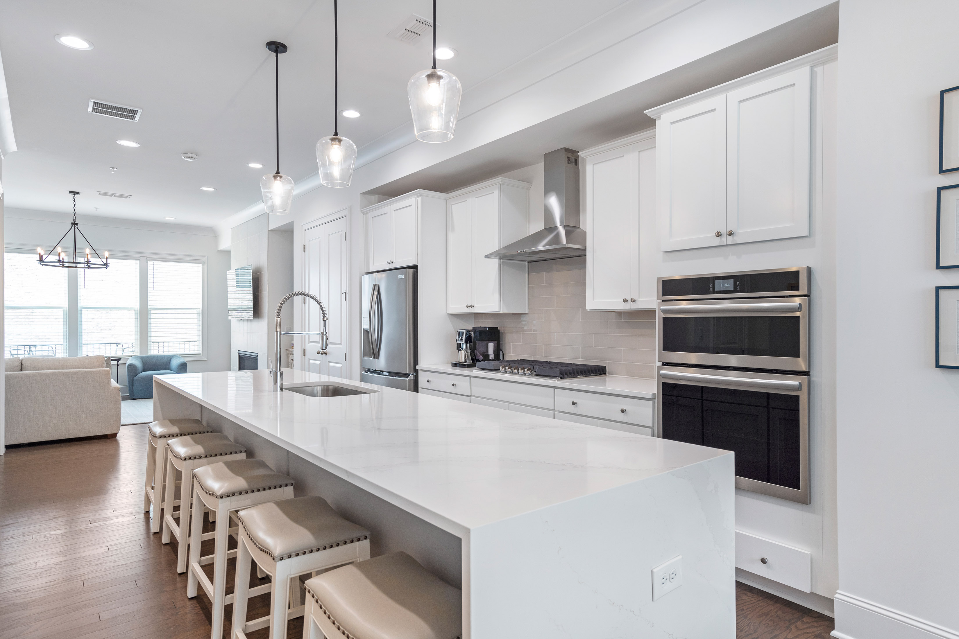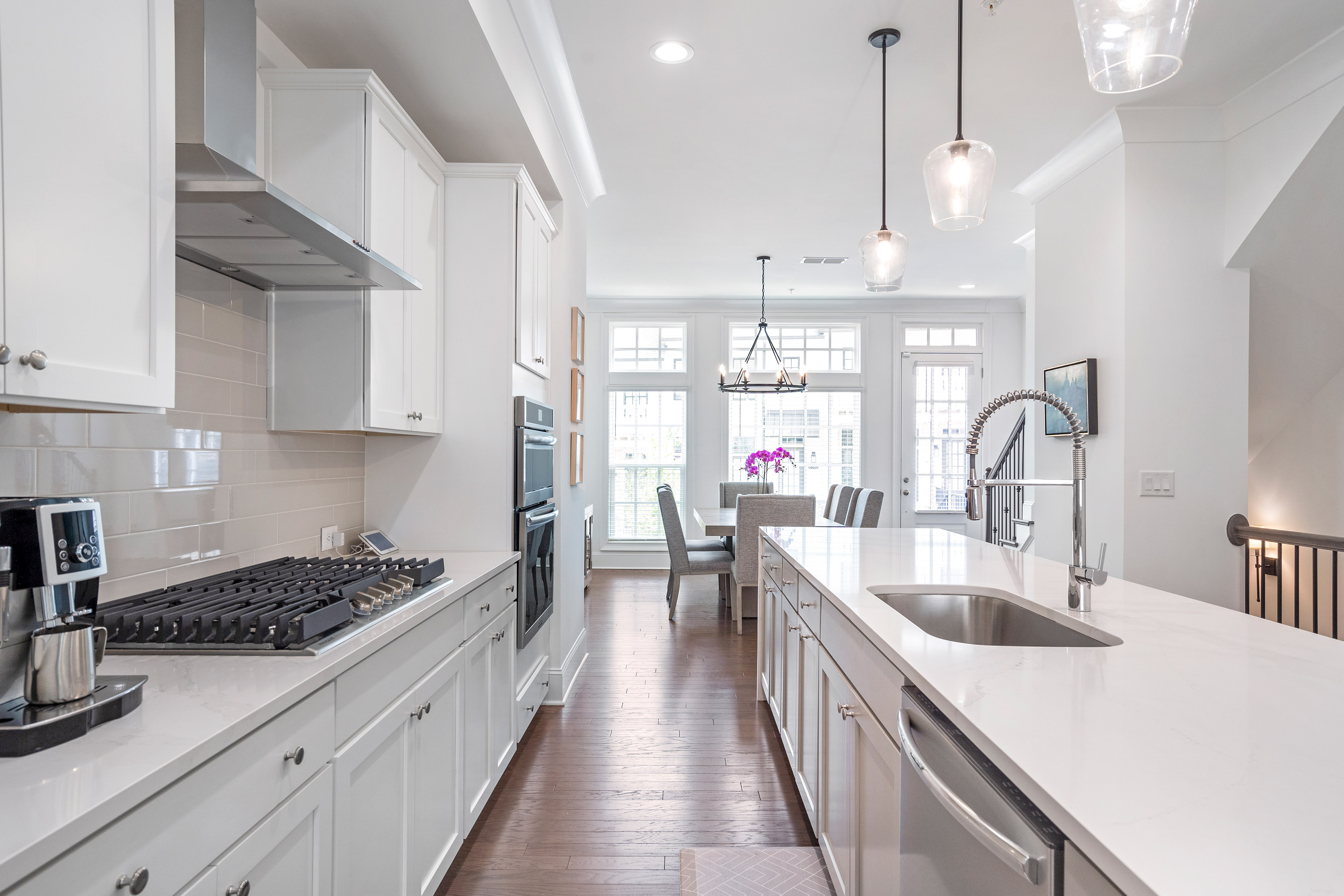 Positioned in one of Aria’s most sought-after settings, this exceptional residence offers a rare blend of privacy, sophistication, and effortless livability. Overlooking expansive green space, the home enjoys an extraordinary sense of openness, along with the convenience of true walk-in main-level living, guest parking just steps from the entrance, and the added distinction of a private driveway. The main level is designed for both elegant everyday living and effortless entertaining, with beautifully curated spaces that feel both refined and welcoming. At the heart of the home, the kitchen pairs modern style with thoughtful functionality, featuring Frigidaire appliances, custom cabinetry, an upgraded sink, designer lighting, and a striking waterfall-edge island that serves as both a centerpiece and gathering space. Filled with natural light, the open living area is anchored by a gas fireplace flanked by custom shelving and flows effortlessly onto a spacious deck, creating a refined indoor-outdoor connection. Hardwood floors, clean architectural lines, and carefully selected finishes bring warmth and sophistication to every space. Upstairs, the primary suite offers a serene retreat with a spa-inspired bath and a beautifully customized walk-in closet. A second en-suite bedroom on this level provides exceptional comfort and privacy for guests or family. The top floor expands the home’s versatility with a sophisticated media or lounge space, a full bath, and access to a private covered balcony—perfect for relaxed evenings or elevated entertaining. On the terrace level, a private bedroom suite offers remarkable flexibility for guests, a home office, fitness studio, or wellness space. Just off the garage, the entry area has been designed as a polished and functional drop zone for everyday organization. Additional highlights include elevator-ready construction, with the shaft currently serving as valuable extra storage, walk-in closets in every bedroom, and thoughtfully integrated storage solutions throughout. Every detail reflects a careful balance of luxury and practicality. All of this is set within the prestigious Aria community, where residents enjoy resort-style amenities including multiple pools, a state-of-the-art fitness center, clubhouse, and immediate access to upscale dining, shopping, and everyday conveniences. Meticulously maintained and enhanced well beyond the original build, this is a rare opportunity to own a truly distinguished home in one of Aria’s most desirable locations.