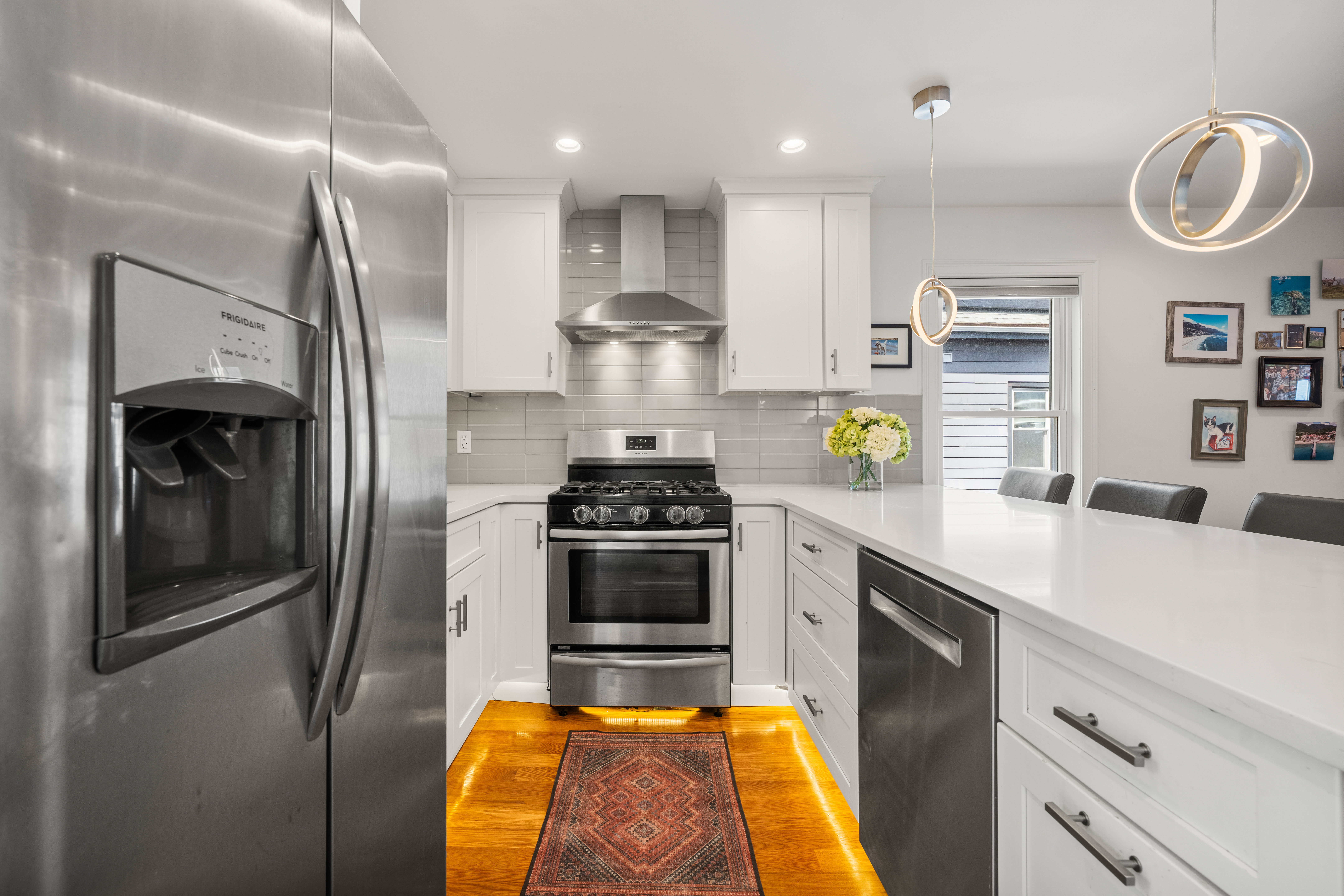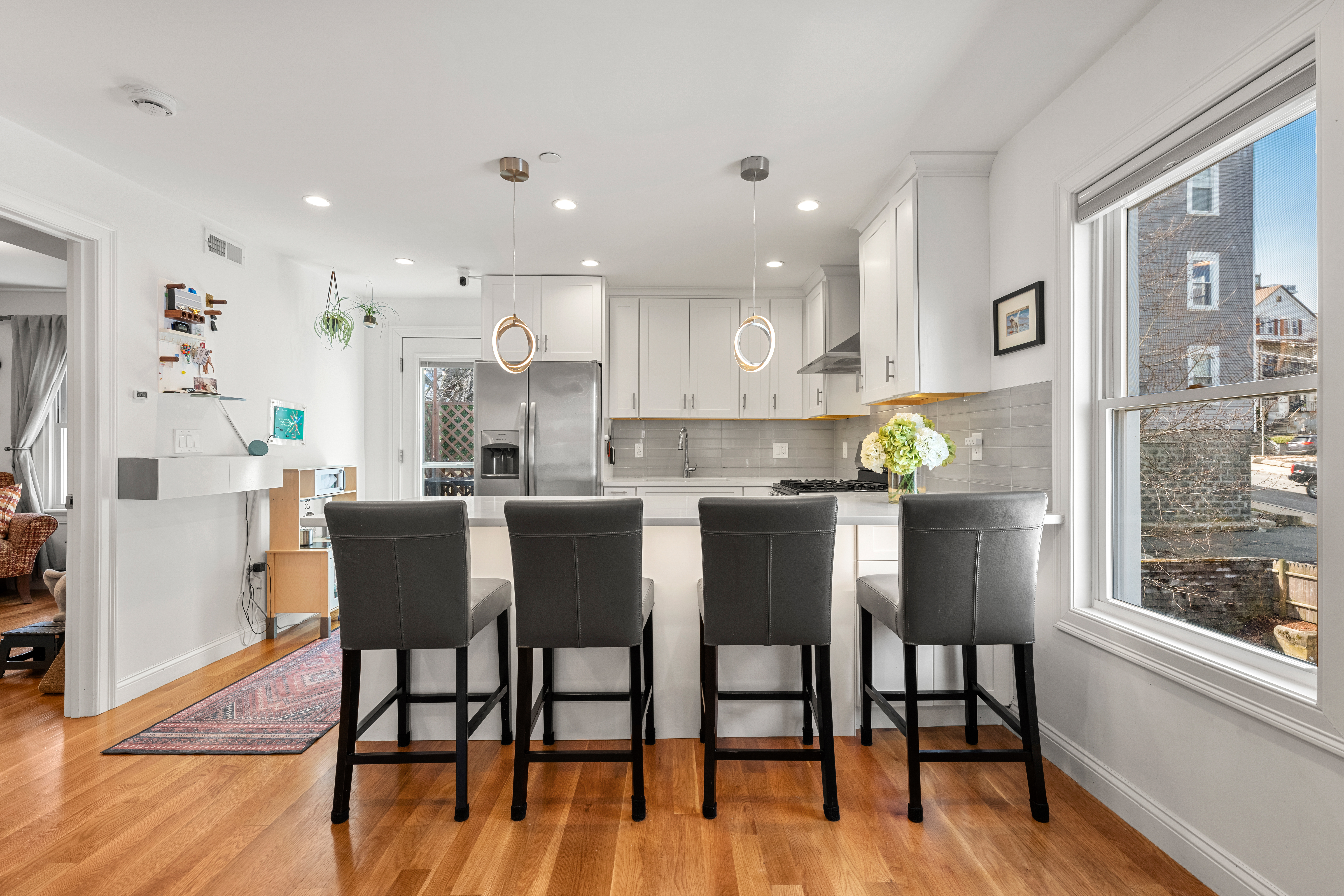 Welcome to 134 Heath St a stunning contemporary townhouse-style condo bathed in natural light! This beautifully renovated 2-bed, 2-bath home features an open floor plan with hardwood floors throughout. The chef's kitchen impresses with white shaker cabinets, quartz counters, stainless appliances, and stylish pendant lighting. The expansive primary suite offers a walk-in closet and a luxurious en suite with double vessel sinks and glass walk-in shower. Spacious second bedroom, in-unit laundry, central A/C, and two off-street parking spaces round out this turnkey package. Step outside to your private deck right off the kitchen, complete with a wired-in heater perfect for entertaining. Pet-friendly building with additional storage included. Located in desirable Winter Hill, just minutes to Union Square, Assembly Row, Magoun & Ball Squares, top restaurants, cafes, shops, and the Green Line at Gilman Square.