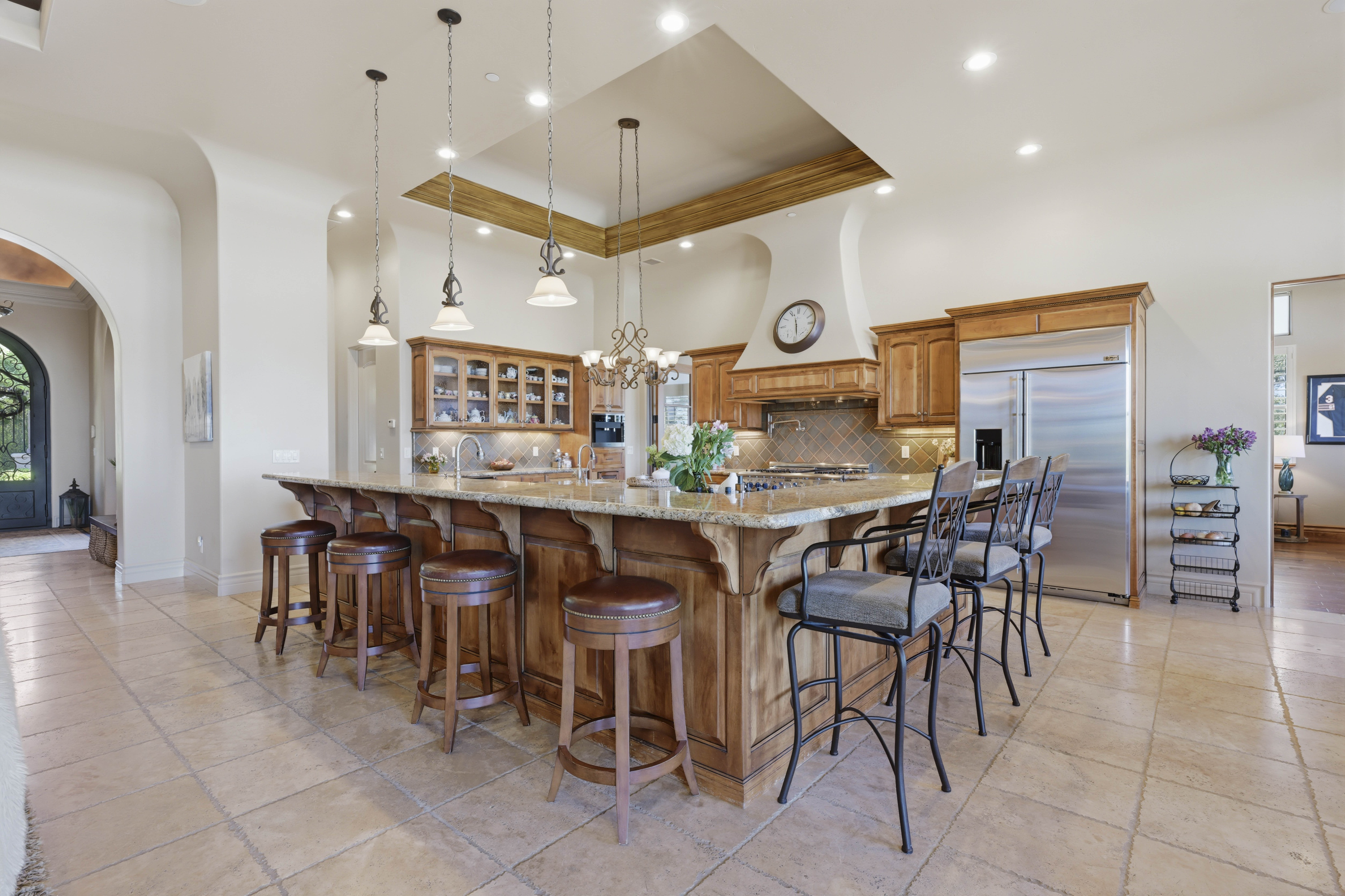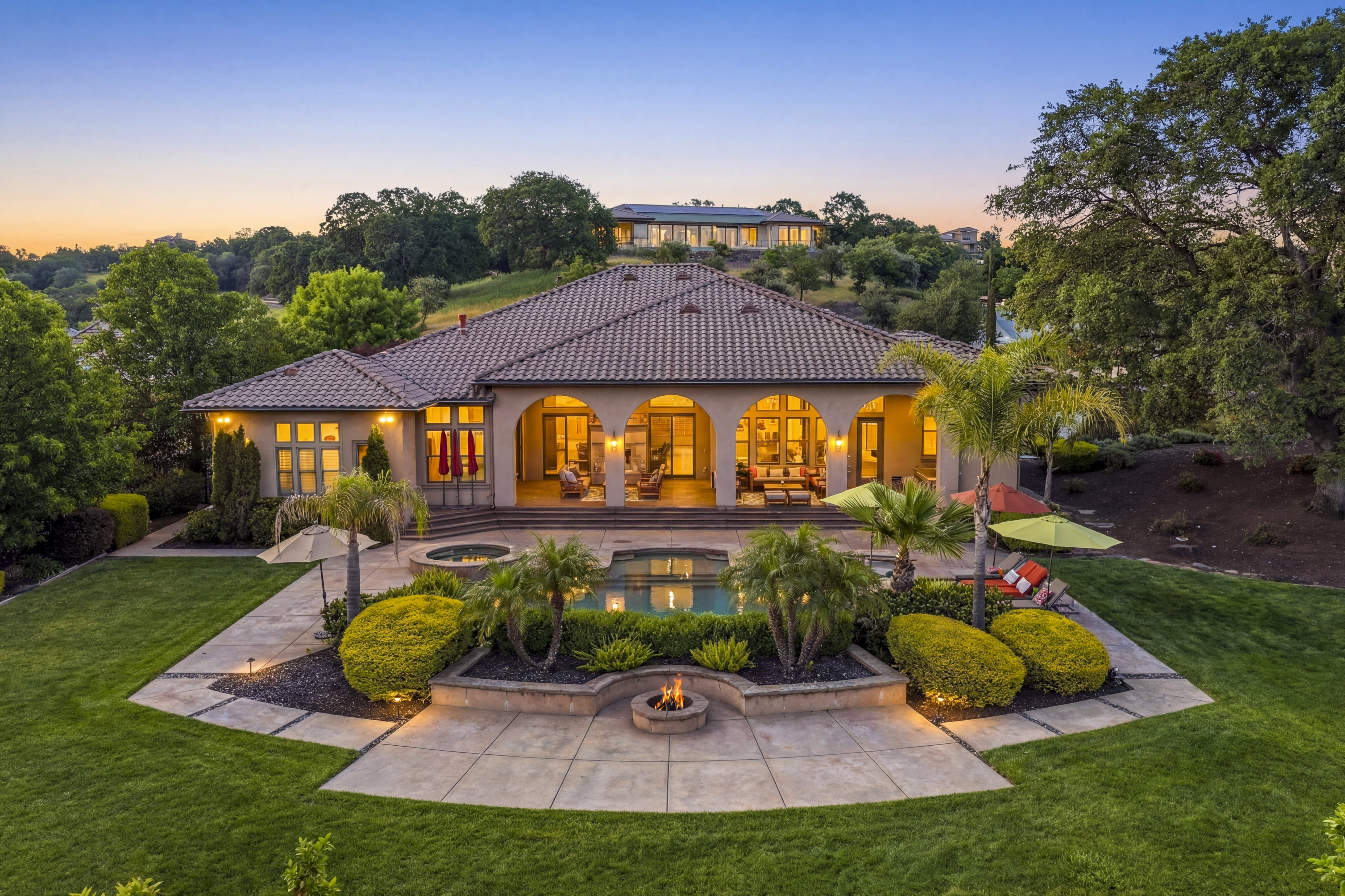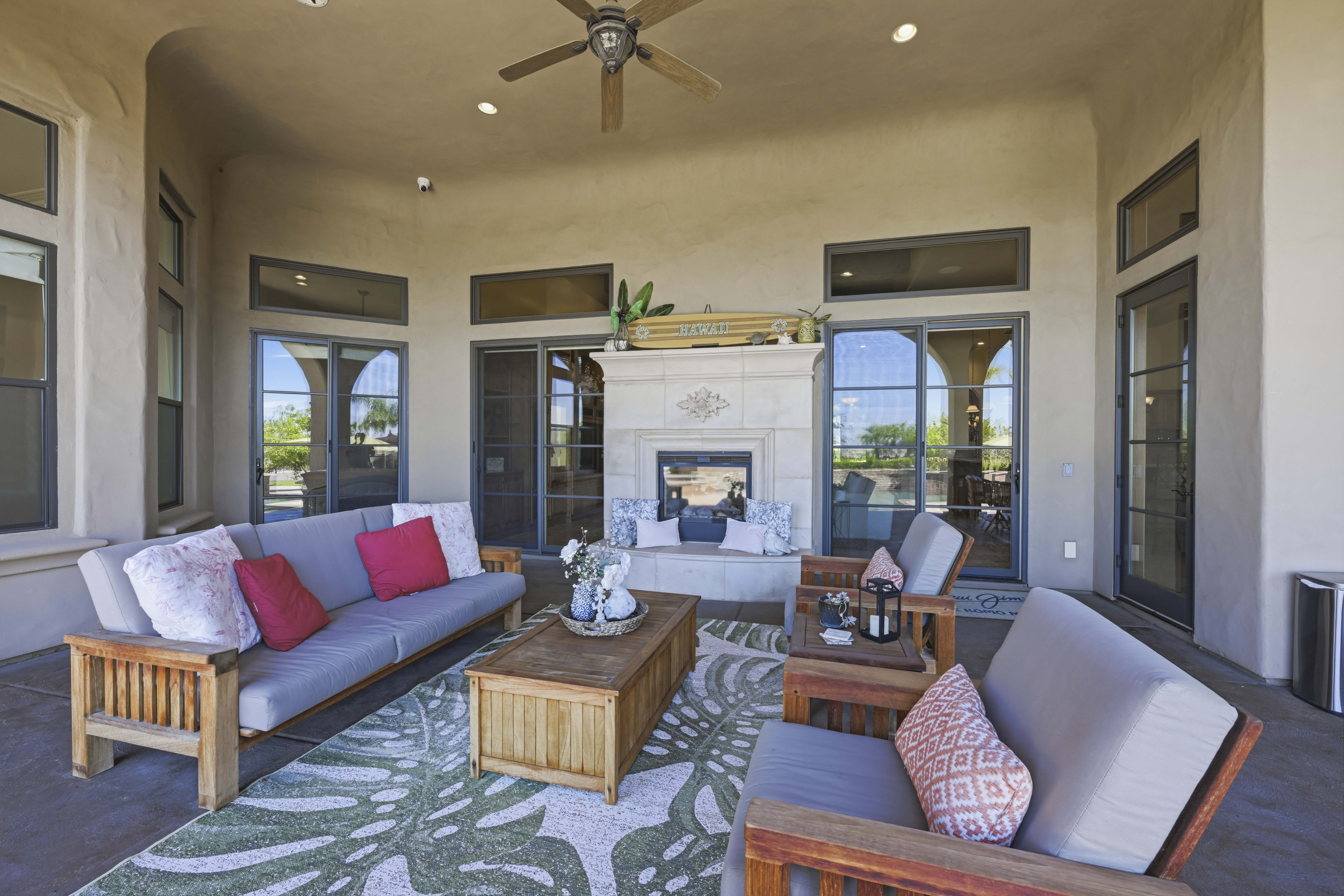 Set behind the guard gated entrance of Catta Verdera, this custom Santa Barbara inspired single level residence offers a rare blend of privacy, elegance, and effortless livability. A welcoming front courtyard with a tranquil fountain and iron and glass double doors sets the tone for the refined spaces within. The interior unfolds with high ceilings, most are triple crown molding, smooth imperfect walls, and natural light that moves softly throughout the home. The chef's kitchen serves as the central gathering place, featuring granite surfaces, professional grade appliances, including a Miele German espresso machine, multiple wine fridge, Thermador double oven, a butler's pantry, and an expansive island designed for connection and conversation. With five bedrooms and five plus baths, the layout supports multi-generational living, guests, or dedicated workspace. Four bedrooms are en suite. The primary suite enjoys direct access to the backyard and lives like a private retreat, complete with a fireplace, sitting area, and a spa inspired steam shower, jetted tub, and multiple shower heads. A separate guest suite with its own courtyard entrance offers ideal privacy for visitors. Set on a flat, fully usable over an acre lot, the outdoor spaces elevate everyday living. The backyard captures sweeping city views and dramatic sunsets, while the Pebble Tec heated pool, cascading water feature, in pool dining table, and elevated spa create a true resort experience. A covered patio, surround sound, outdoor kitchen, and stone fireplace extend the living space year-round. Additional amenities include a spacious fully finished multi vehicle garage, with one bay dedicated as a climate-controlled fitness room, a circular driveway, and prepaid solar for added efficiency. The theater room, designed for effortless entertaining. Warm wood beams, rich flooring, and natural light create an inviting setting, while the ceiling mounted projector and large screen and surround sound offer a true theater experience. A custom bar with granite surfaces and stainless appliances and a beer tap, makes hosting easy, and direct patio access, blends indoor comfort with outdoor living. Catta Verdera offers a lifestyle defined by natural beauty, privacy, and access to the nearby country club, golf course, walking paths, and community amenities. The expansive lot also provides potential for an ADU. A sense of calm sophistication describes life here. Come explore for yourself.