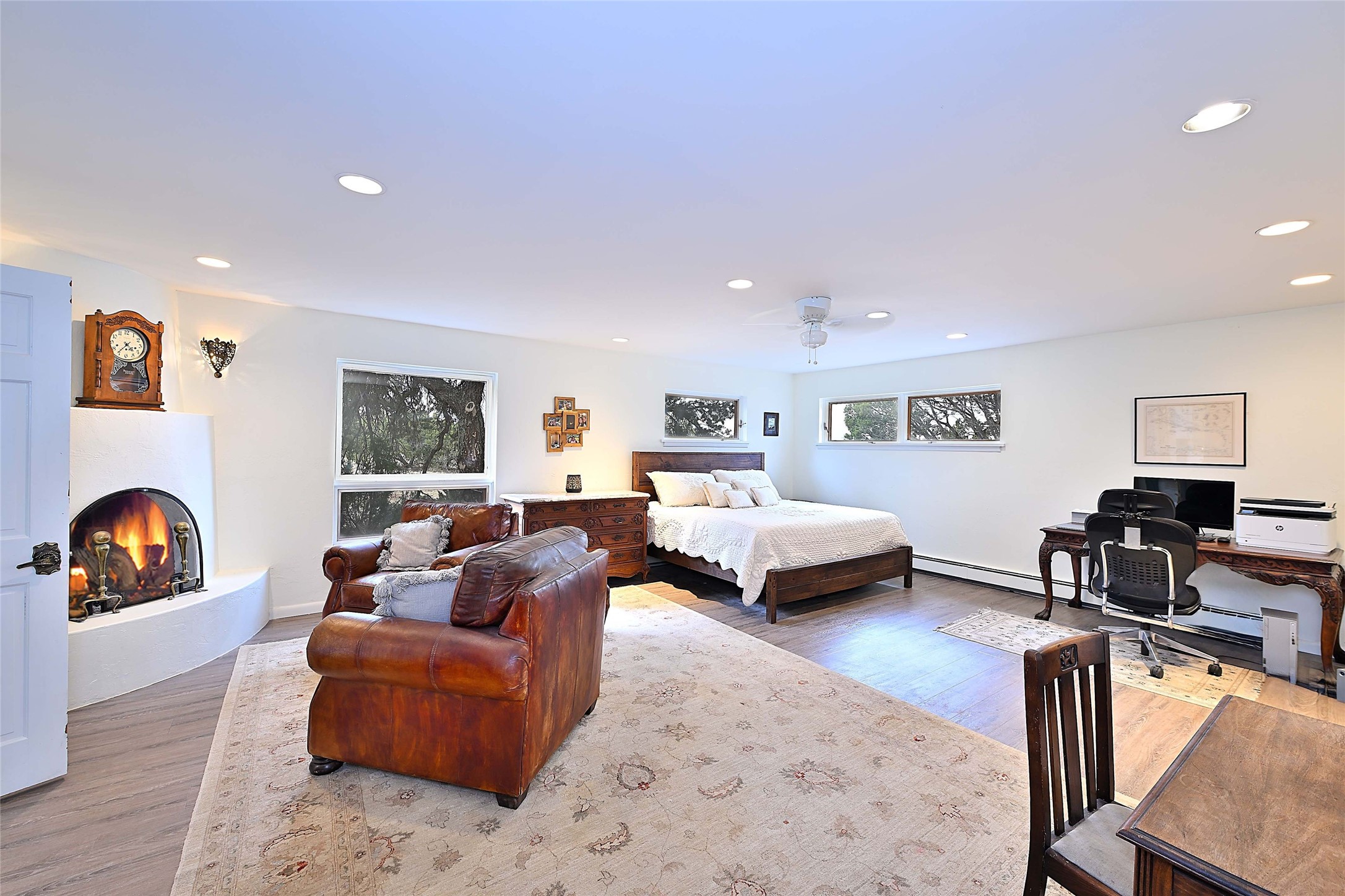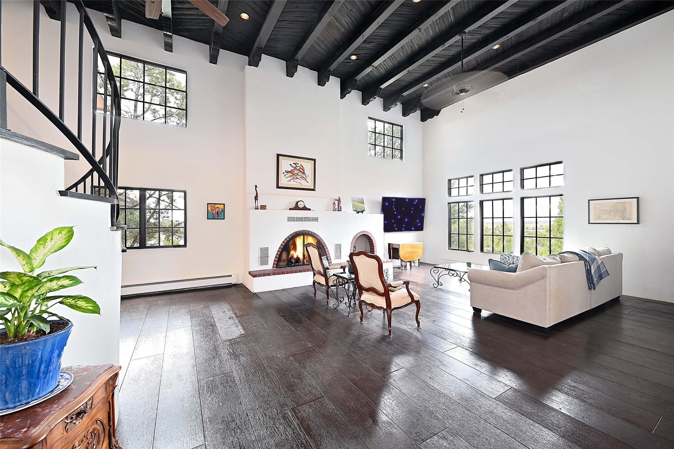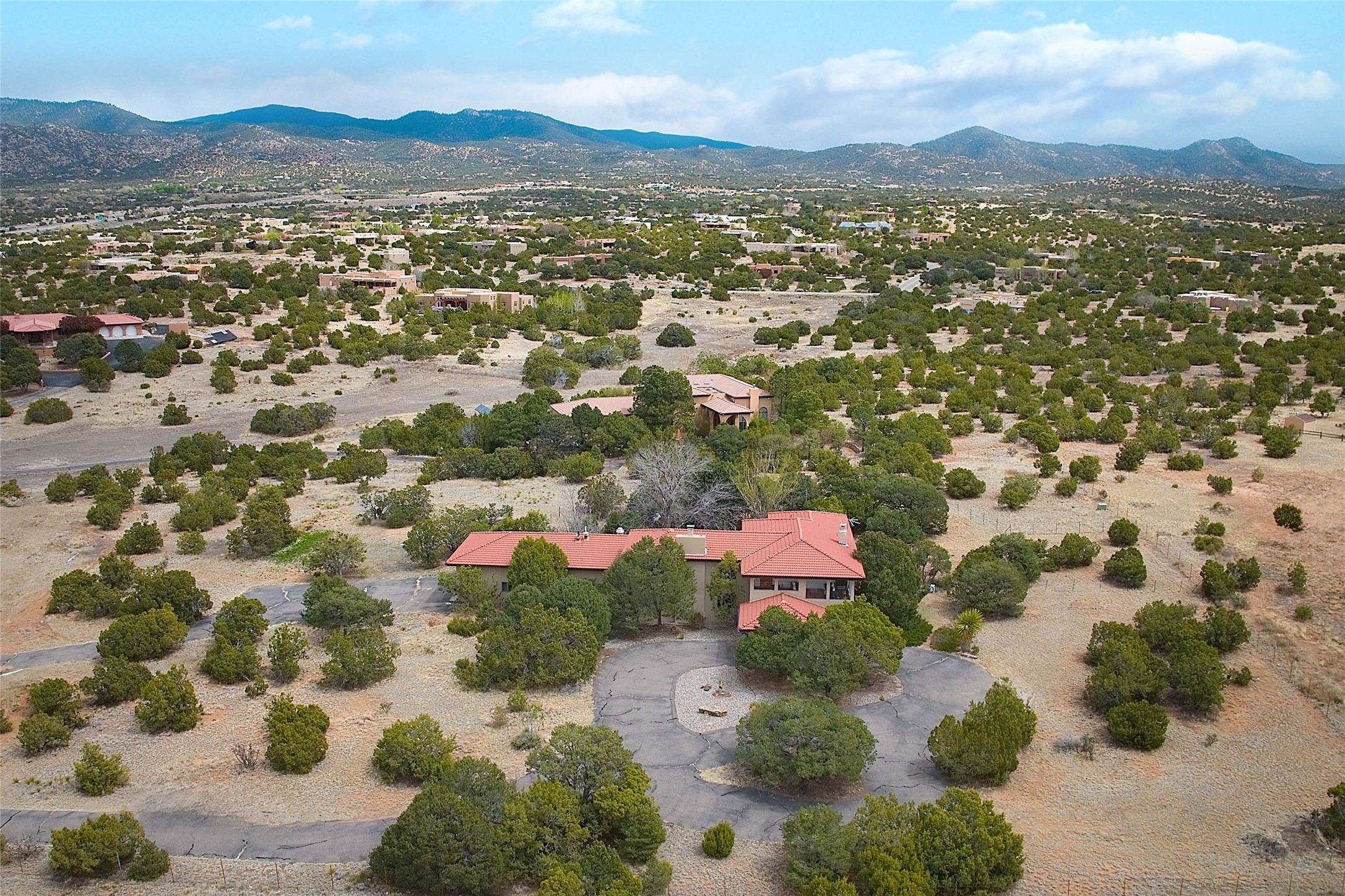 Tucked at the end of a quiet lane, this expansive 2.5-acre property offers privacy and sweeping views with the convenience of being within ten minutes to shopping, schools and the Plaza. With over 4,300 square feet, 5 bedrooms, and 4 bathrooms, there’s room to spread out while still feeling connected. The heart of the home is a generous recently remodeled kitchen designed for gathering, complete with a walk-in pantry and space that flows easily for everyday living or entertaining. A large laundry room off the kitchen connects to the expansive garage. The lower level features a large primary suite with a kiva fireplace, a spacious, recently renovated, master bathroom with a shower and a bathtub, and dual walk-in closets. An additional bedroom or office is also on the lower level. Upstairs features 3 bedrooms, 2 bathrooms, a western-facing sunroom with gorgeous Jemez and sunset views, and a spacious attic for storage. The living room features beautifully carved corbels and beamed 20-foot ceilings. Wide plank wood flooring pairs beautifully with the wood-burning fireplace, creating a cozy, inviting atmosphere year-round. Thoughtful features like baseboard hot water heat and central evaporative cooling provide comfort in every season. Outside, enjoy the expansive back portal off the kitchen, recently reseeded lawn and wide-open space with endless possibilities and views of the Sangre de Cristo Mountains—all with no HOA and no Santa Fe mansion tax. This home comes partially furnished, and includes a 90-inch, wall-mounted Sony TV in the living room, an outdoor TV on the back portal, Teak furniture on the back portal, and various antique pieces throughout. Whether you’re looking for quiet mornings, sunset views, or room to grow, this property delivers a lifestyle that feels both grounded and expansive.