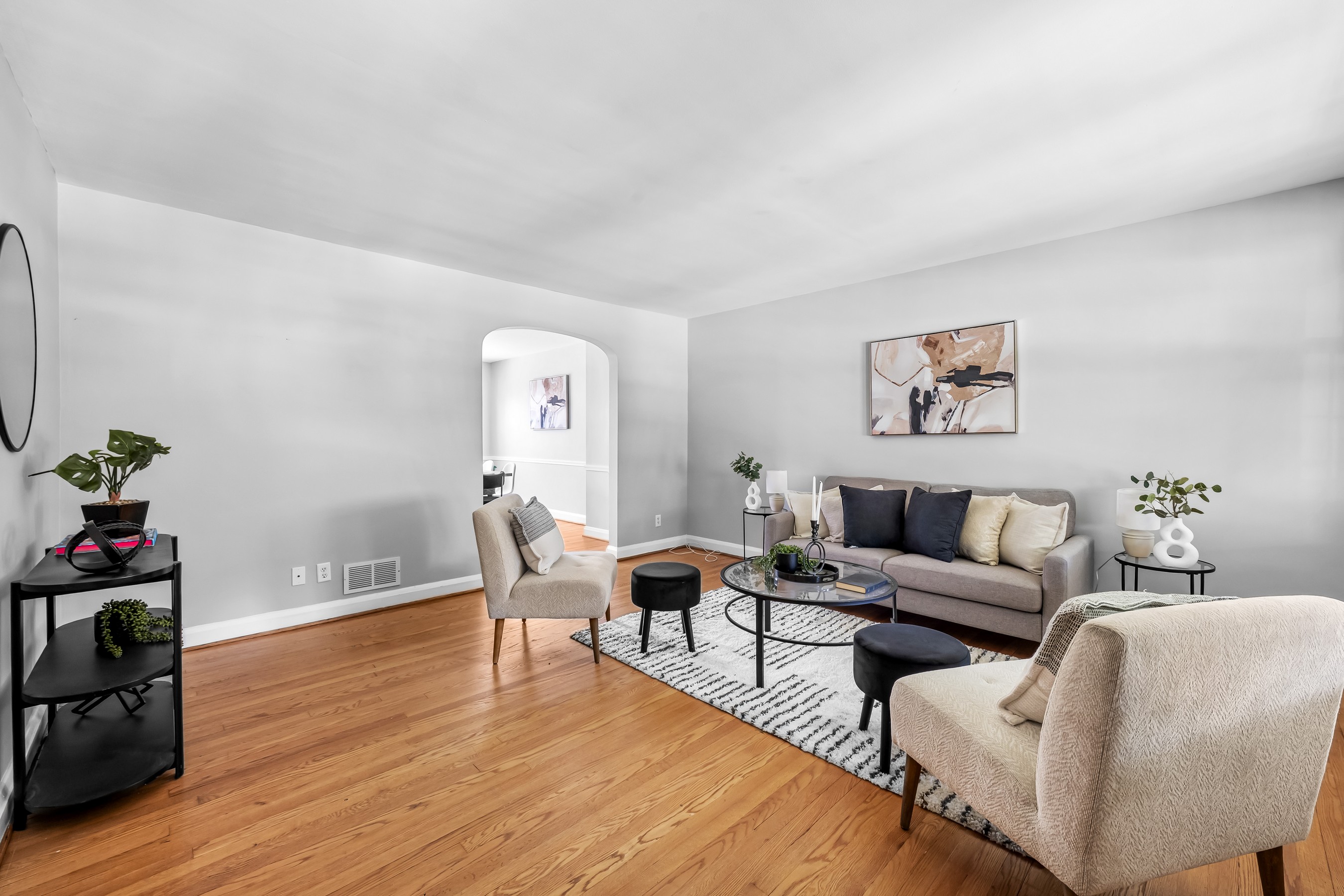The sun-filled main level features hardwood floors, a bay window, and a wide archway that seamlessly connects the spacious living and dining areas, perfect for both everyday living and entertaining. The kitchen offers a functional layout with ample cabinet space and a breakfast bar island.