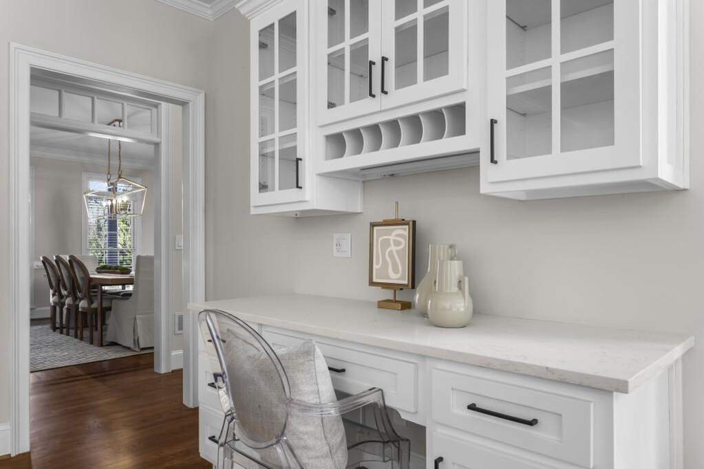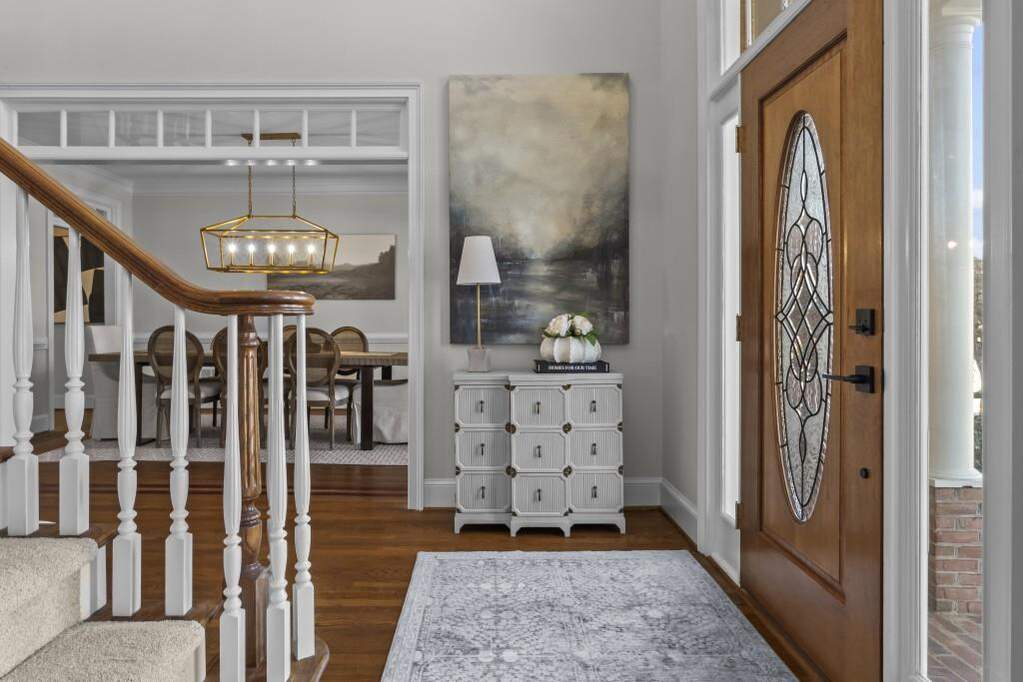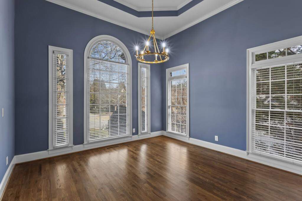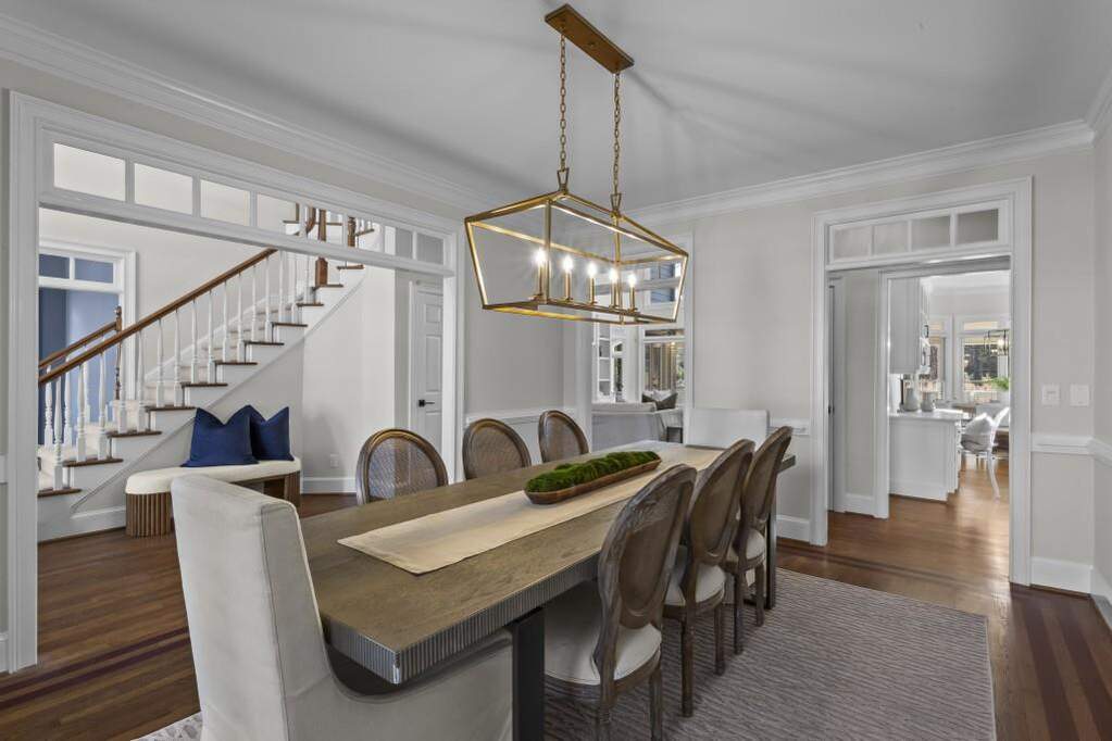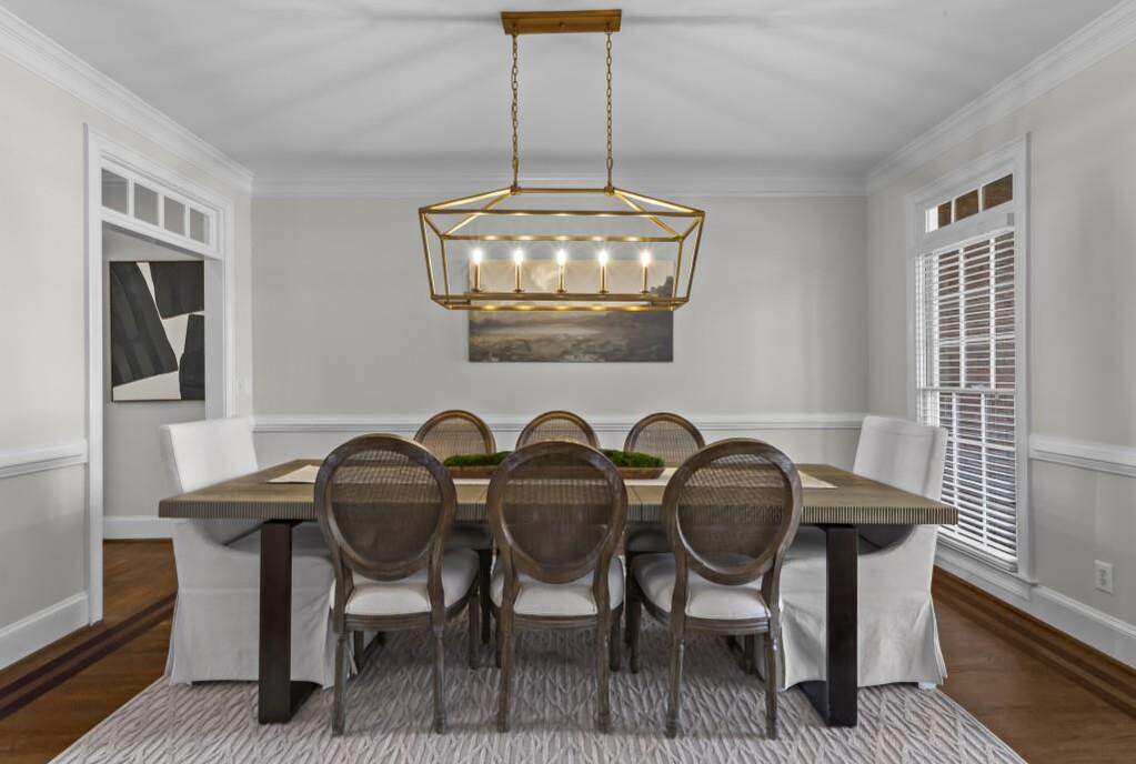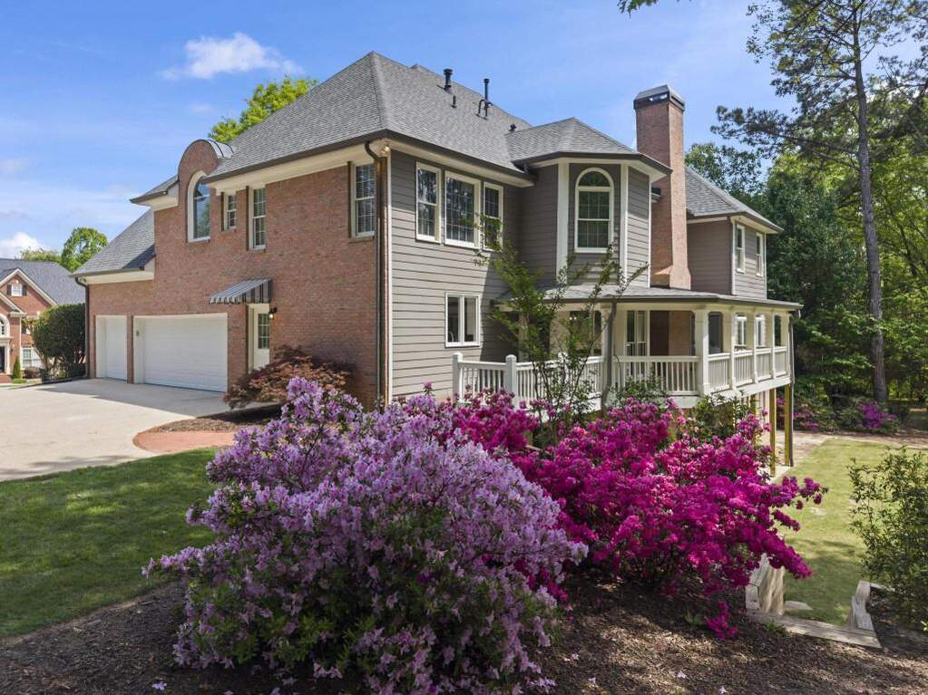 Pond views, a full-width covered deck, and three finished levels create a home that stands apart in Wellington Lake. Positioned on a deep lot with long rear views across the backyard and water, the setting offers a sense of openness, natural light, and privacy within one of Peachtree Corners' established swim and tennis communities. The location places you near Wesleyan School, Atlanta Athletic Club, and The Forum, with convenient access to Town Green and major commuter routes. Hardwood floors span the main level, complemented by fresh interior paint, updated lighting, and a two-story living room framed by arched upper walkways and custom built-ins. The renovated kitchen is both functional and refined, featuring quartz countertops, a porcelain farmhouse sink, shaker-style cabinetry, two pantries, and an oversized island. Premium appliances include Thermador double ovens, a Wolf gas cooktop, KitchenAid refrigerator and dishwasher, a Sharp microwave drawer, and a Zephyr beverage refrigerator. A main-level bedroom with en suite bath offers flexibility for guests, a private office, or additional living space. Across the back of the home, a covered deck spans the full width, creating multiple areas for dining, relaxing, and grilling while overlooking the pond. The space connects seamlessly to the sunroom, allowing for a natural transition between indoor and outdoor living throughout the year. Upstairs, the primary suite includes a sitting room with fireplace and pond views, along with a renovated spa-inspired bath featuring a freestanding tub, glass shower, and dual vanities. Three additional bedrooms provide en suite bath access. The full daylight terrace level with LVP flooring throughout offers expansive flexible space, with the potential for two additional bedrooms, recreation areas, or extended living. An exterior-entry storage room presents an ideal setup for a workshop, hobby space, or organized storage. The backyard extends beyond the deck, offering space for a garden, outdoor play, or simply enjoying the open setting and water views. Located in Wellington Lake with swim and tennis amenities, this home offers a thoughtful balance of setting, space, and livability in Peachtree Corners.